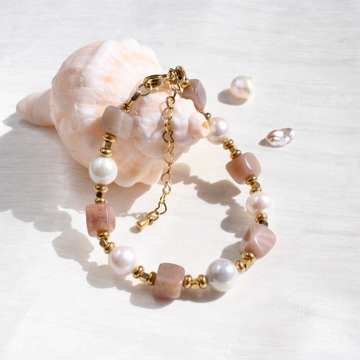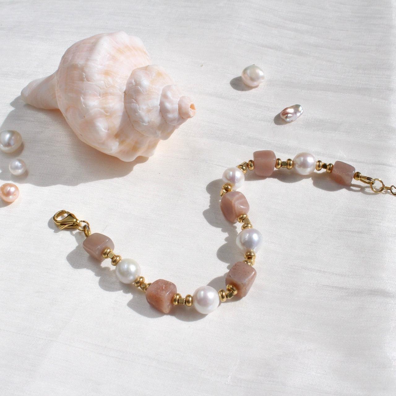 The beautiful Athena bracelet is a timelessly elegant piece of jewelry that combines irregularly shaped natural sunstones with round freshwater pearls. The handmade pearl and healing stone bracelet is unique, with attention to detail in their creation and 18 carat gold-plated components. Its natural beauty and sophistication make it an indispensable accessory in any jewelry collection.