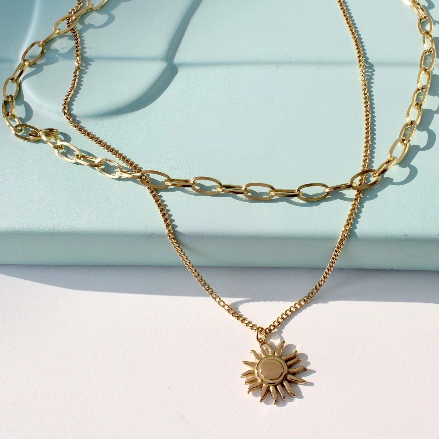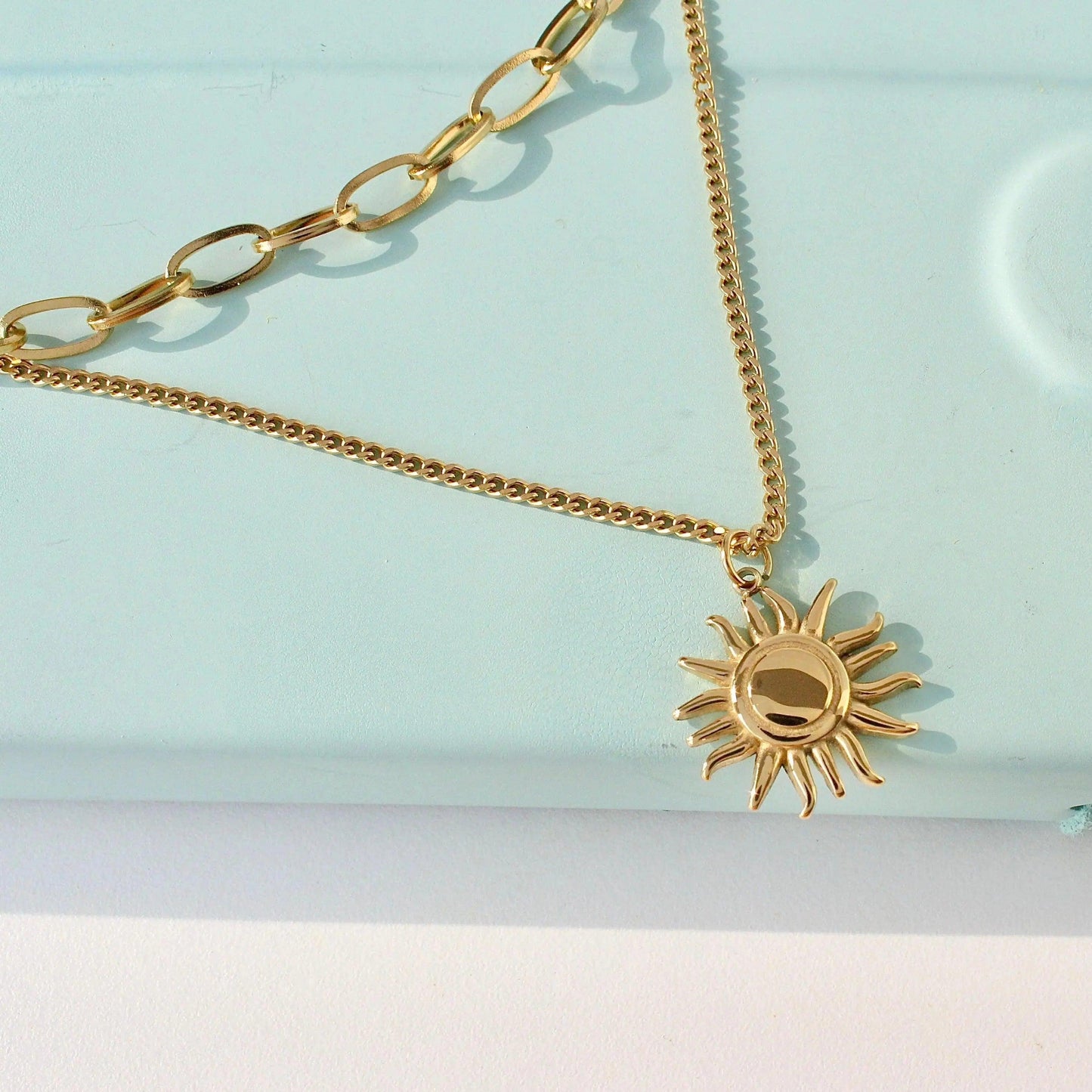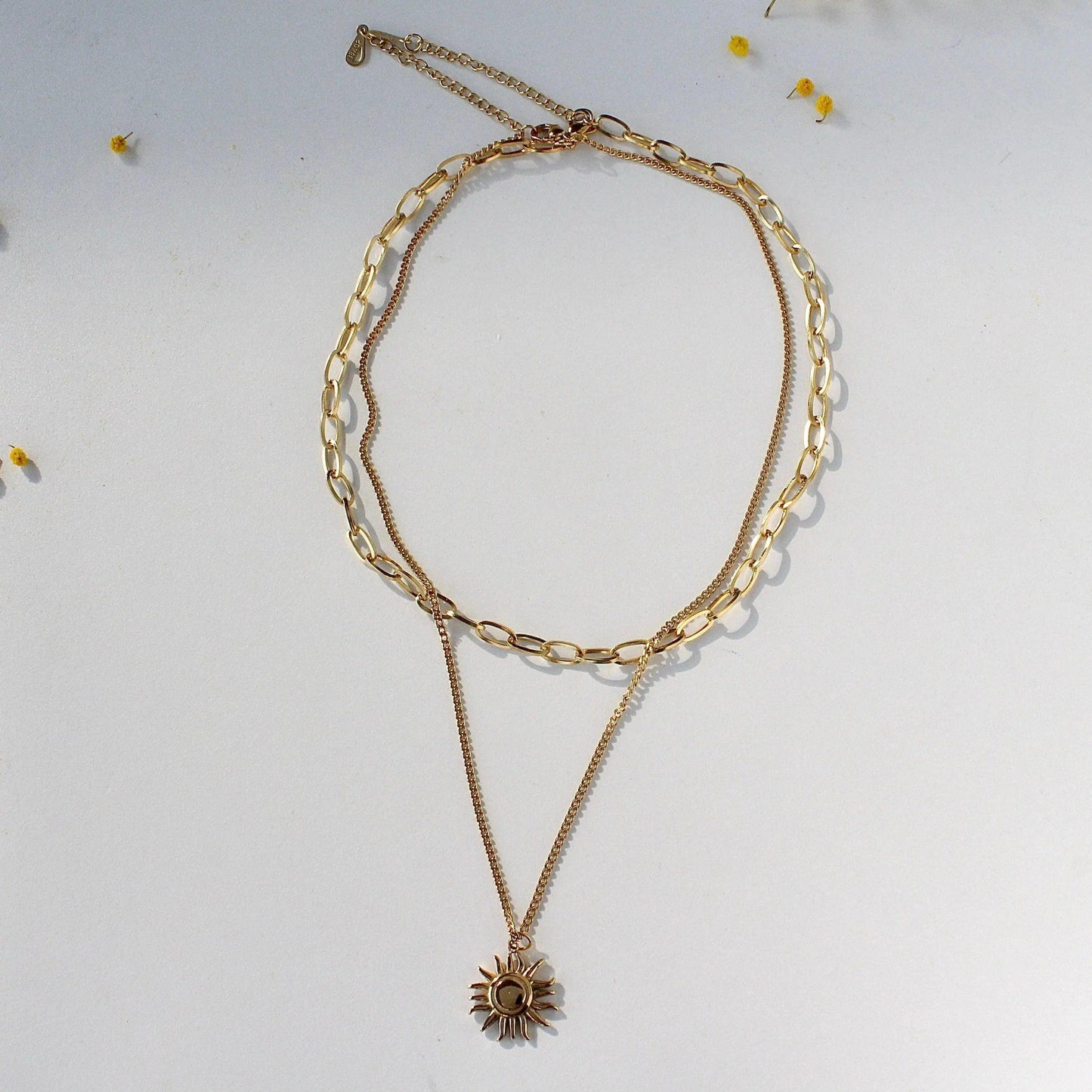 This double necklace with a golden sun can also be worn separately. The chains are made of surgical steel and coated with 18k real gold. They are water resistant and hypoallergenic.