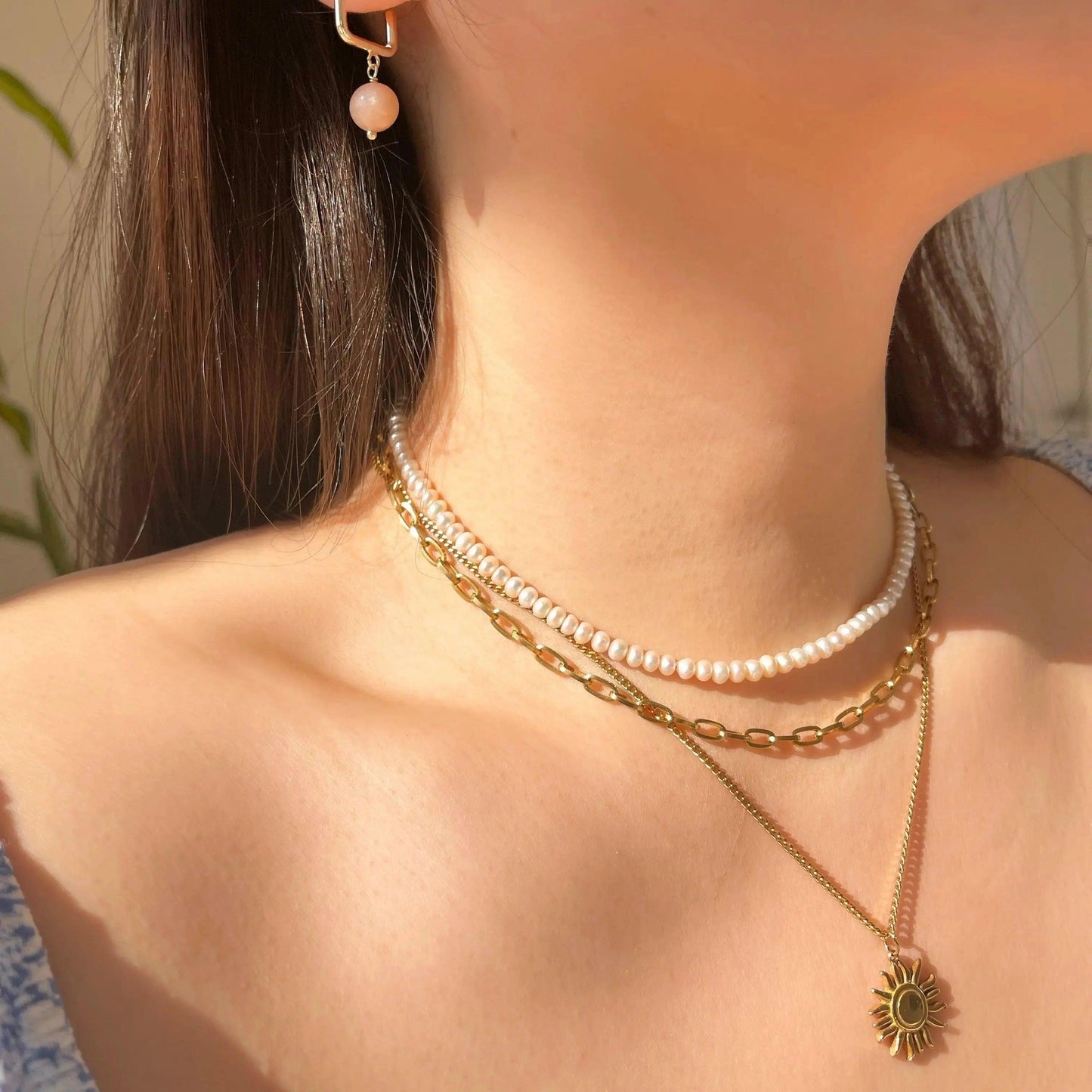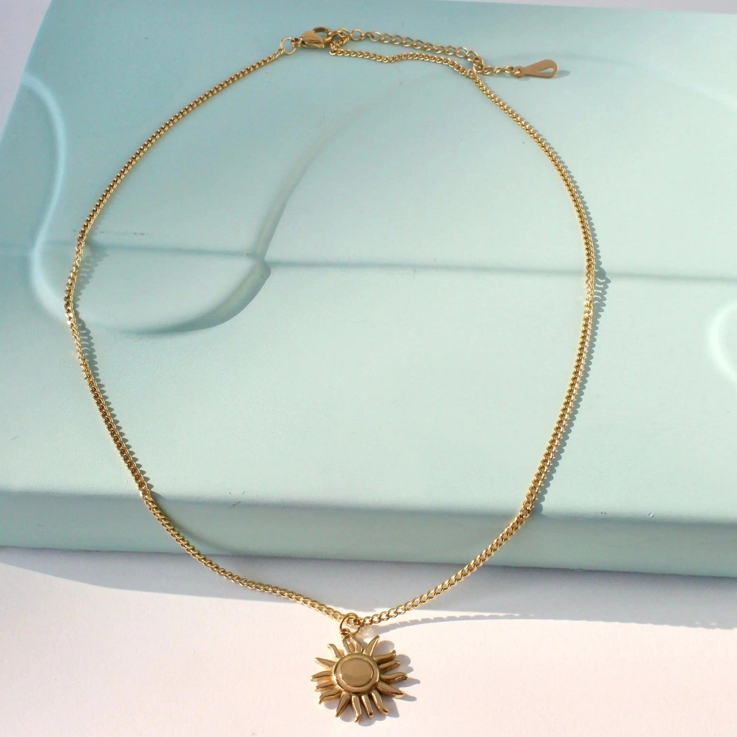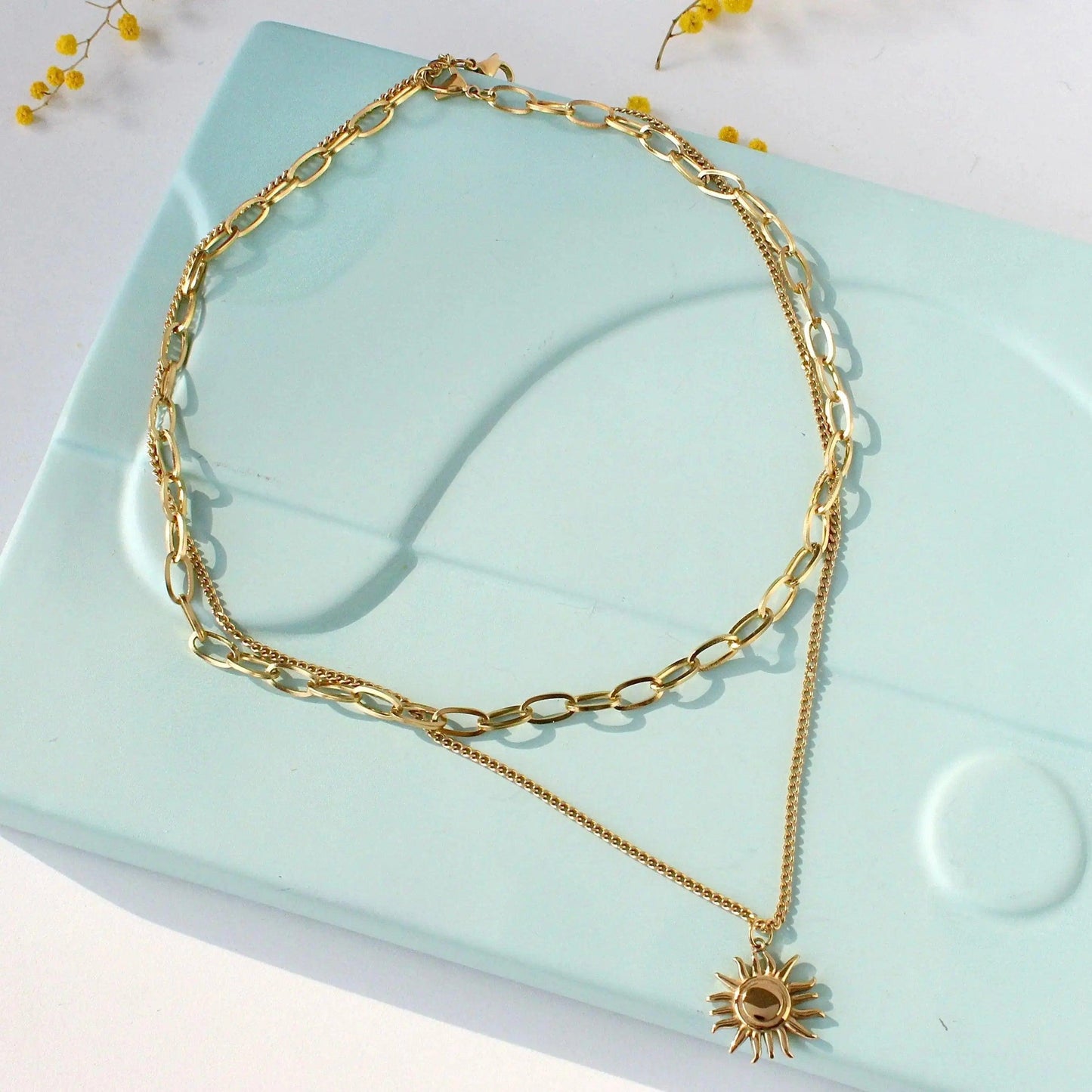 This double necklace with a golden sun can also be worn separately. The chains are made of surgical steel and coated with 18k real gold. They are water resistant and hypoallergenic.