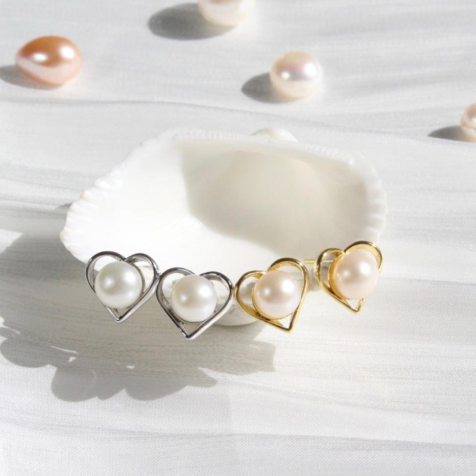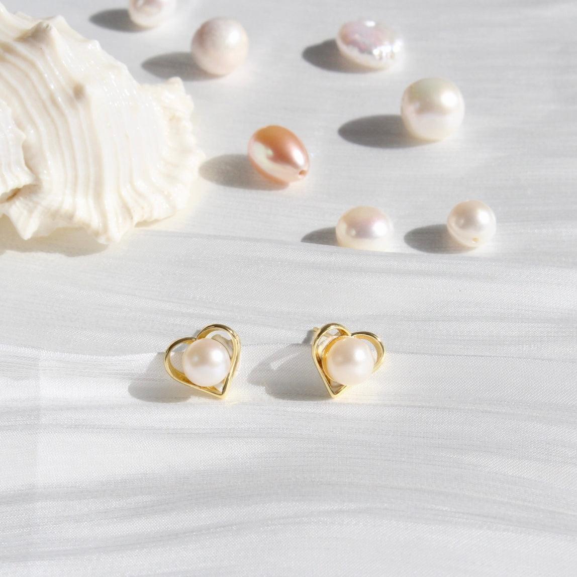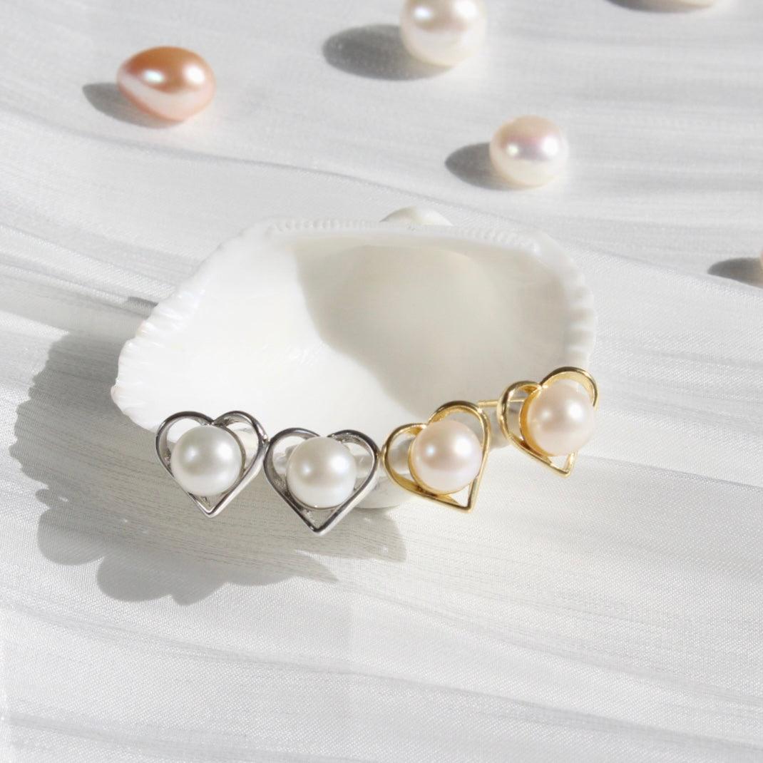 Classic yet playful heart-shaped stud earrings, adorned with delicate details and a precious freshwater pearl as the centerpiece. The stud earrings are available in two versions—either with high-quality white gold or 18k yellow gold plating. They bring timeless elegance to any outfit.