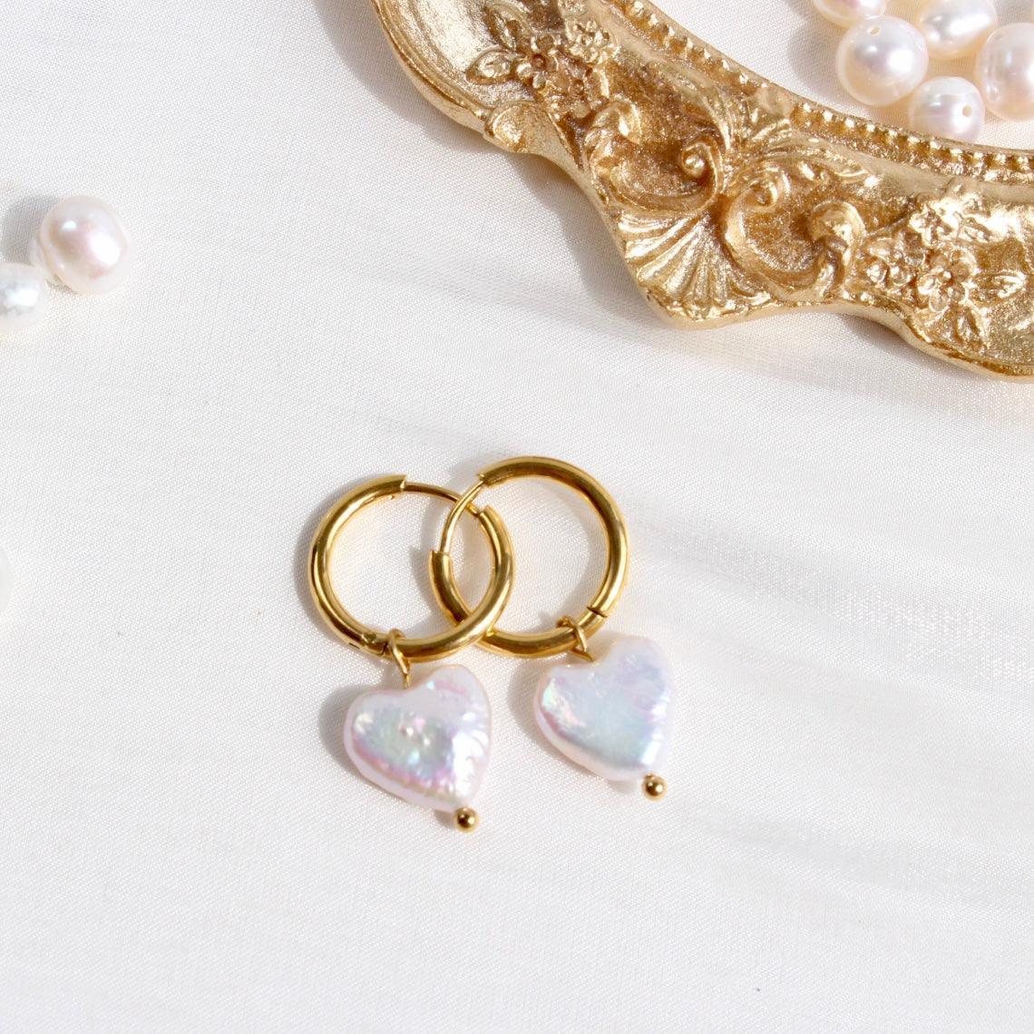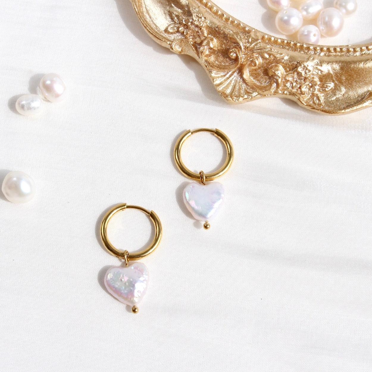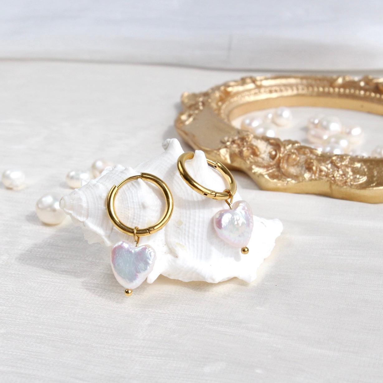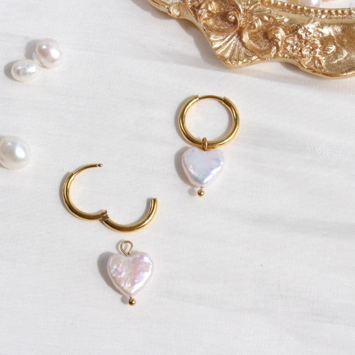 The hoop earrings feature the same heart-shaped baroque pearl as the necklace. The heart-shaped baroque pearls have a unique beauty that gives the earrings a character and sweetness that cannot be duplicated. The pearls are combined with the simple, round design of the 18-karat gold-plated stainless steel earrings, allowing the heart pearls to be removed and worn individually.