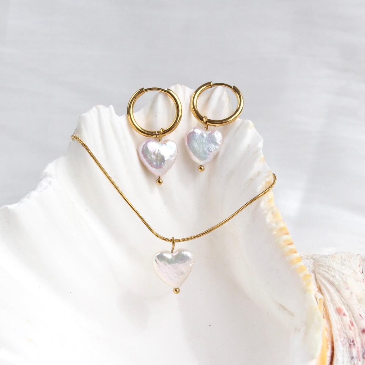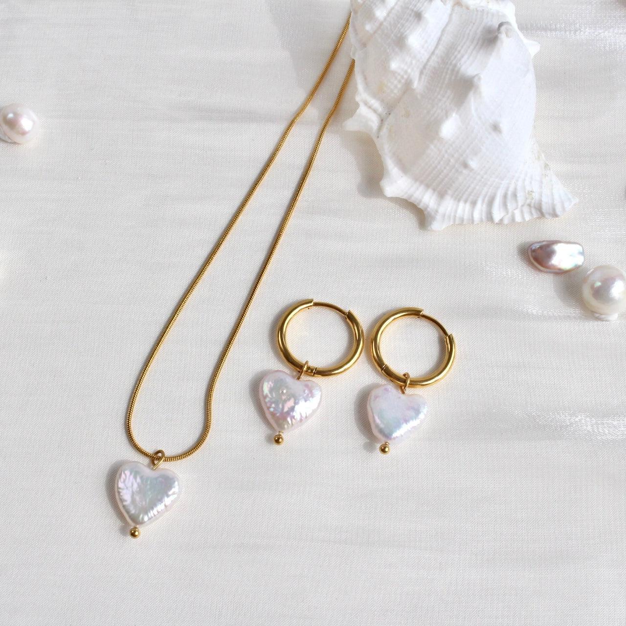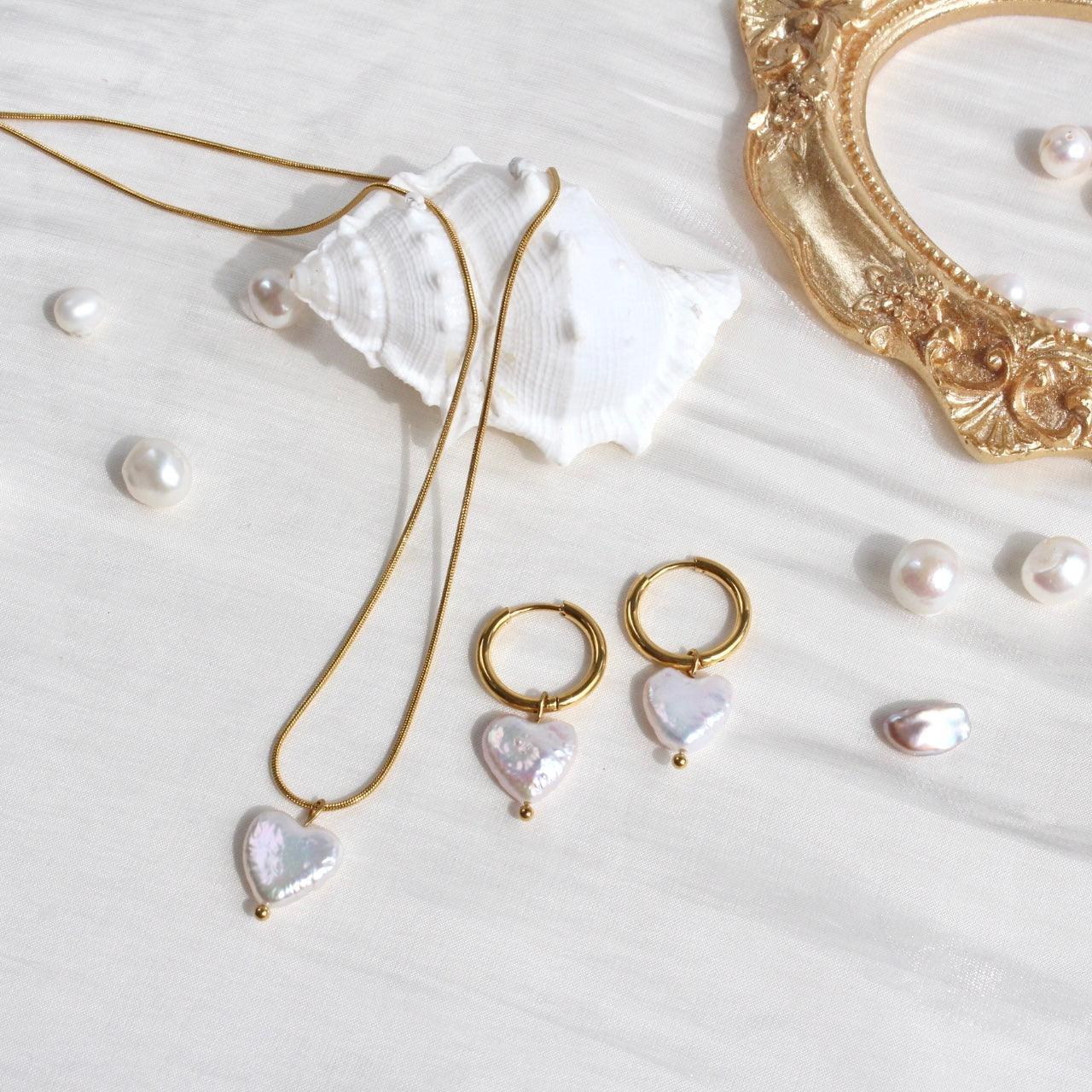 This necklace and hoop earring set combines elegance with modern style for a unique sense of sophistication. Featuring a selection of heart-shaped baroque pearls for a romantic touch, the necklace comes on a classic 18k gold-plated stainless steel snake chain measuring 41cm in length with a 5cm extender, making it easily adjustable to suit different wearing needs. The necklace can be worn both everyday and on special occasions such as weddings and dates.