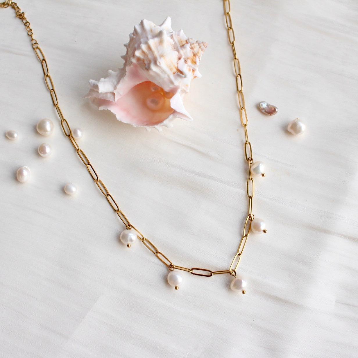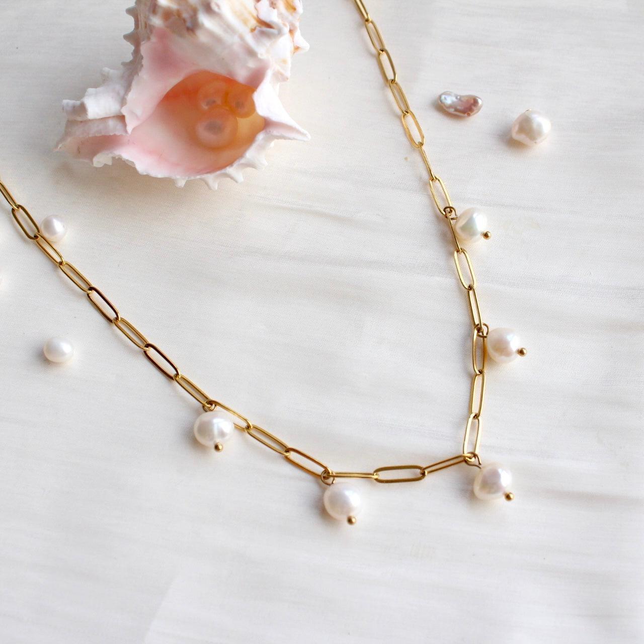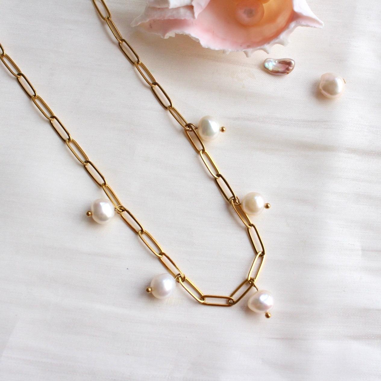 Simple and classic design with irregularly shaped baroque pearls on a high-quality stainless steel chain. The chain is 18k gold-plated and measures 38 cm in length with a 6.5 cm extender. The extender can be adjusted to the desired length. A selection of high-quality genuine freshwater cultured pearls.