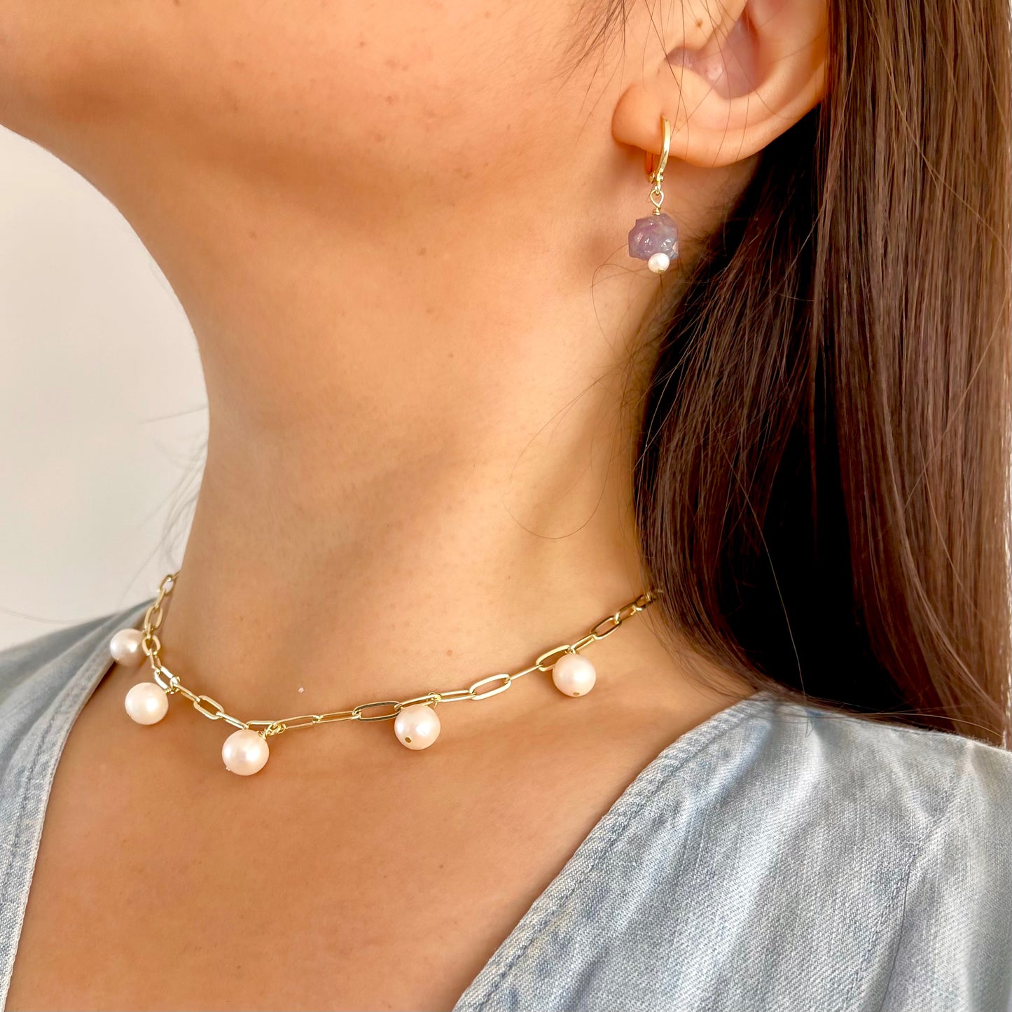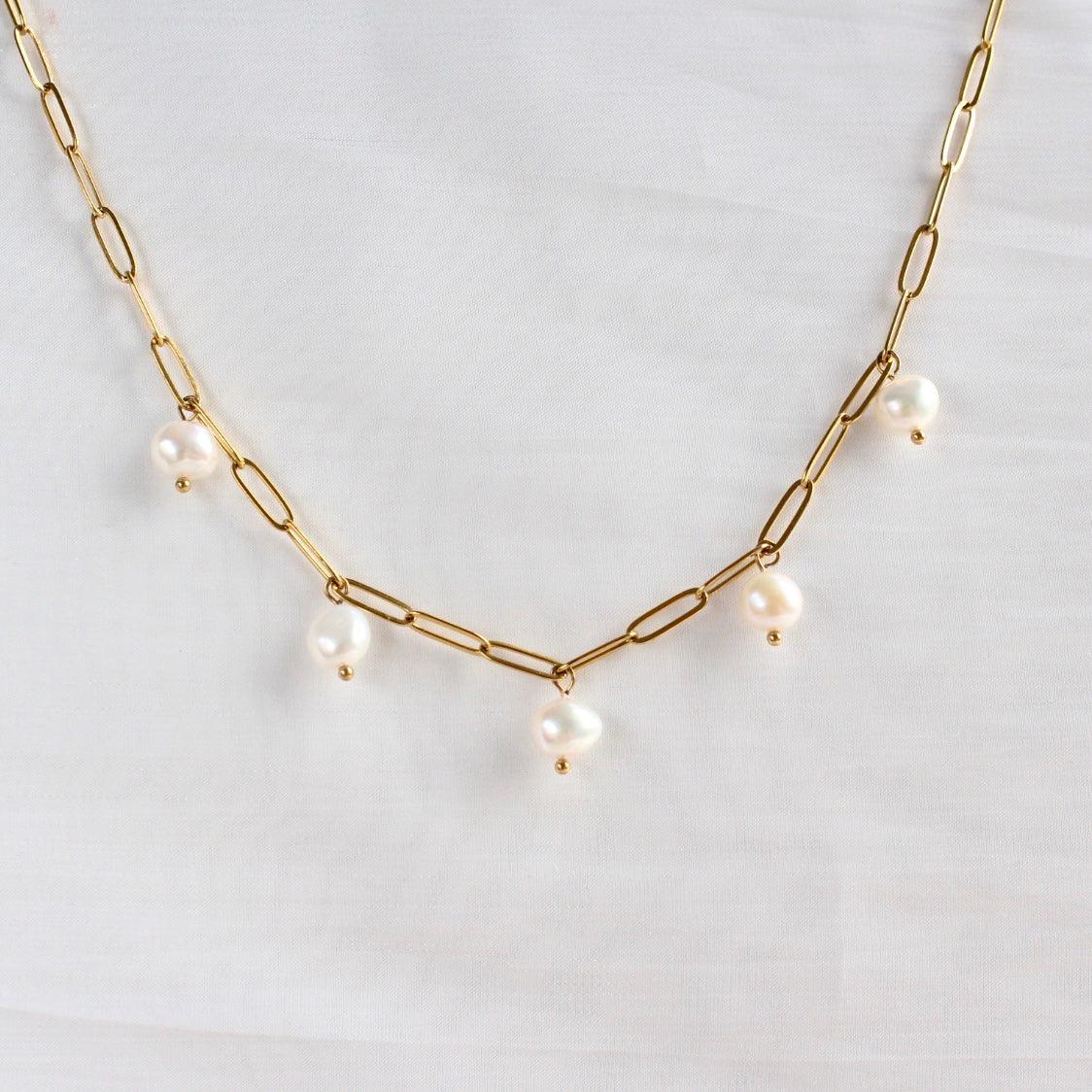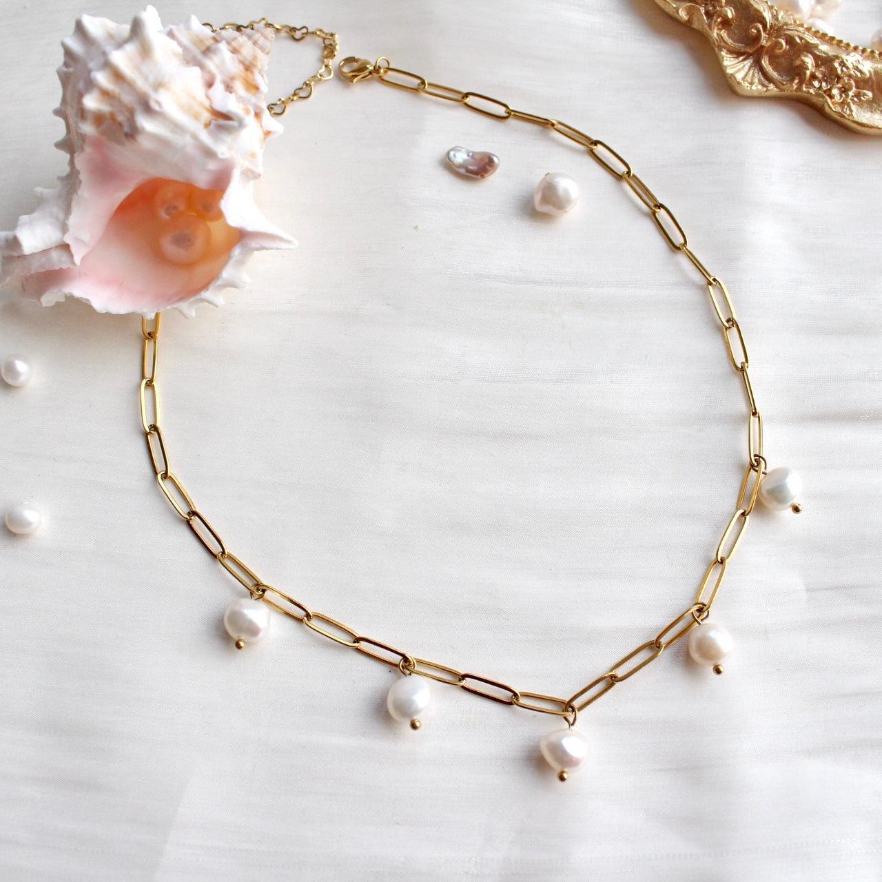 Simple and classic design with irregularly shaped baroque pearls on a high-quality stainless steel chain. The chain is 18k gold-plated and measures 38 cm in length with a 6.5 cm extender. The extender can be adjusted to the desired length. A selection of high-quality genuine freshwater cultured pearls.