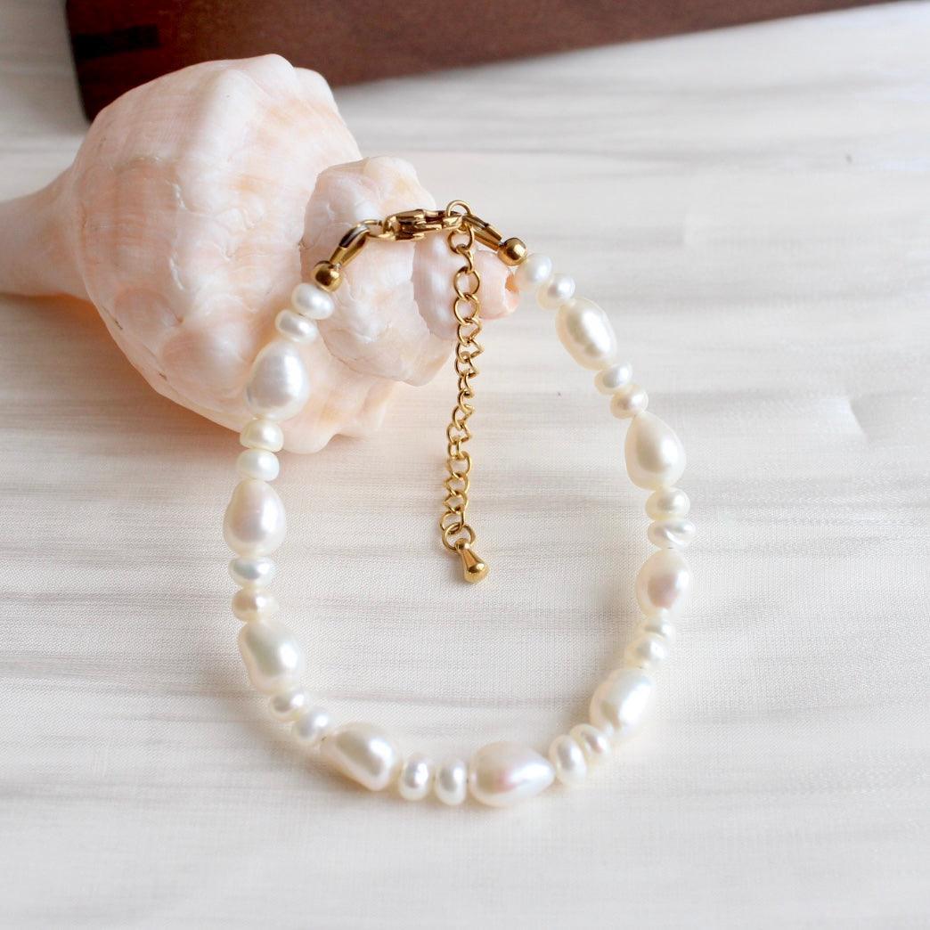 The necklace length is 41cm, plus 6.5cm extension chain; The arm chain length is 17.5cm, plus 4.5cm extension chain. With the extra long extension chain, the length can be adjusted as required. Selected real pearls from freshwater culture. The components are made of stainless steel and coated with 18 carat real gold. They are water-resistant and anti-allergic.