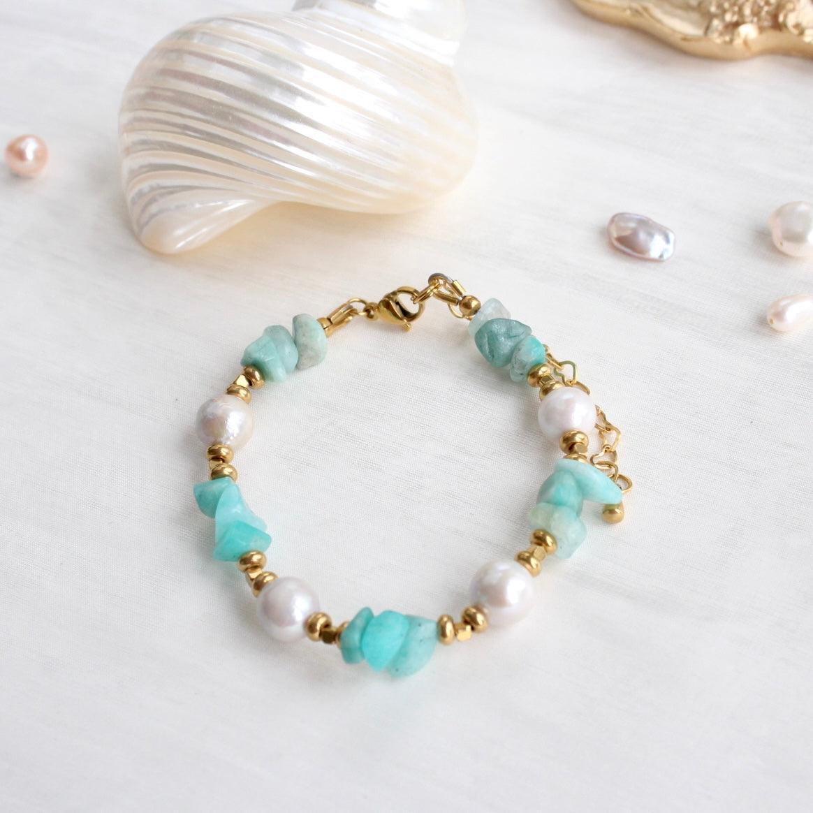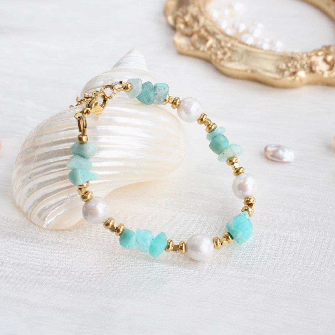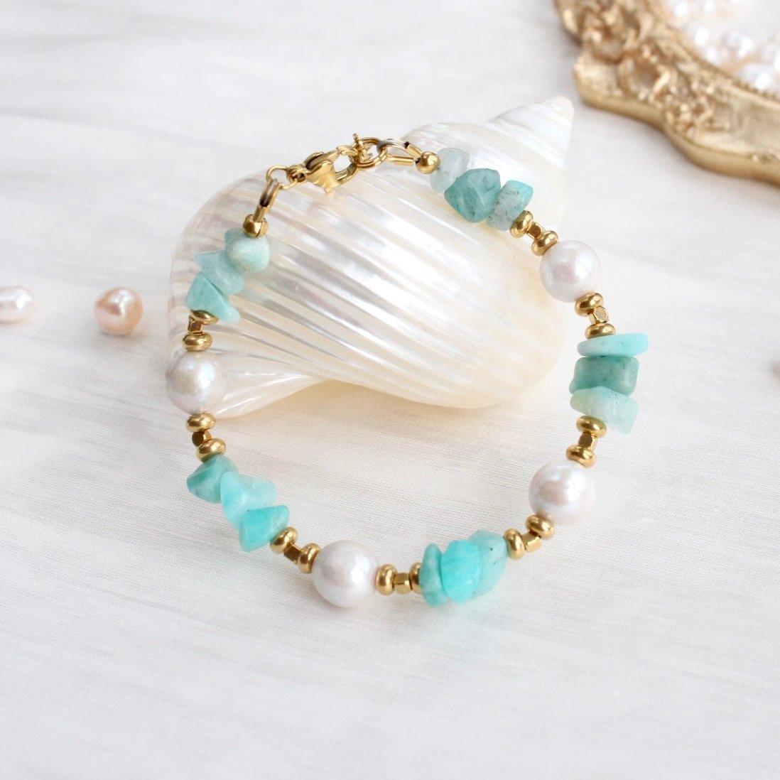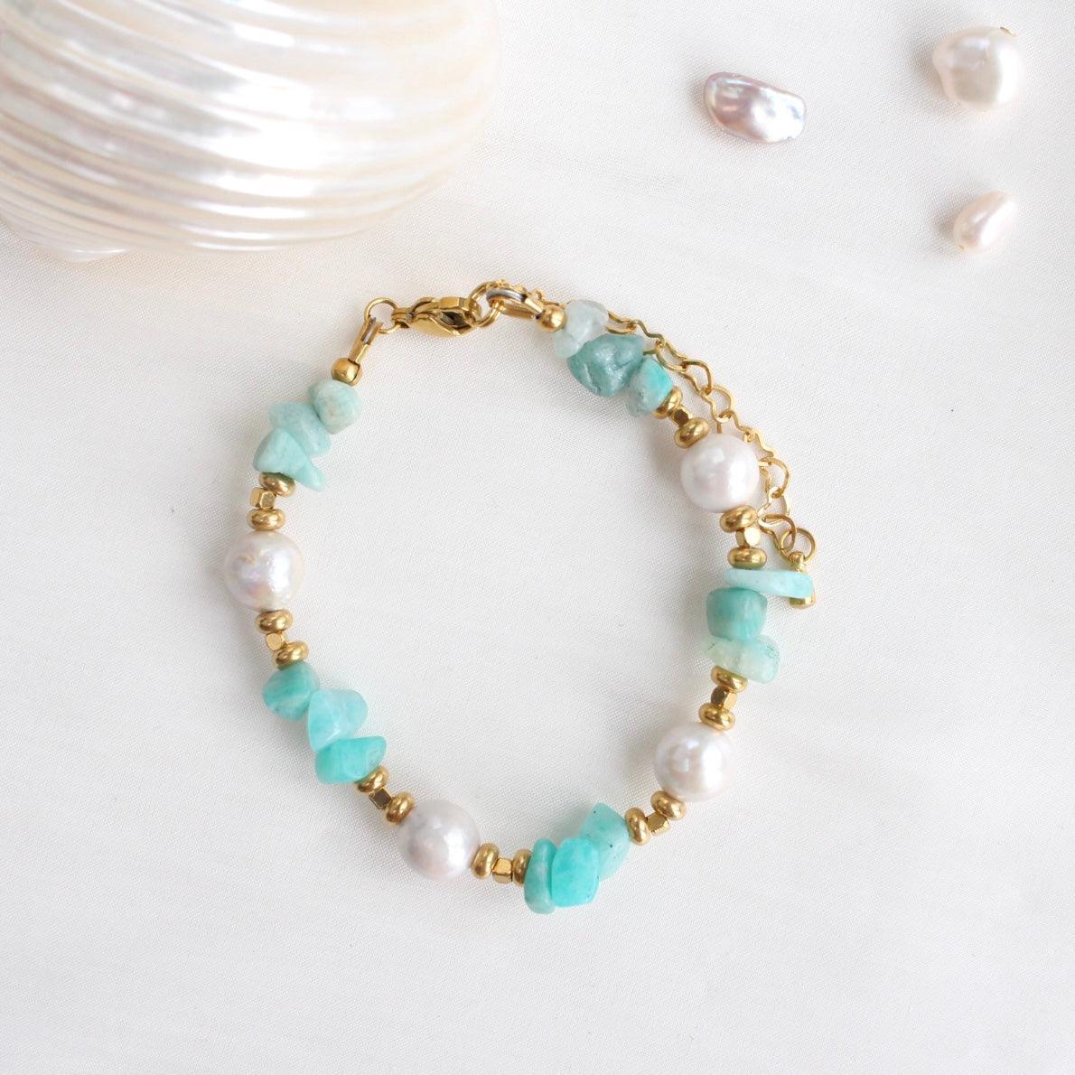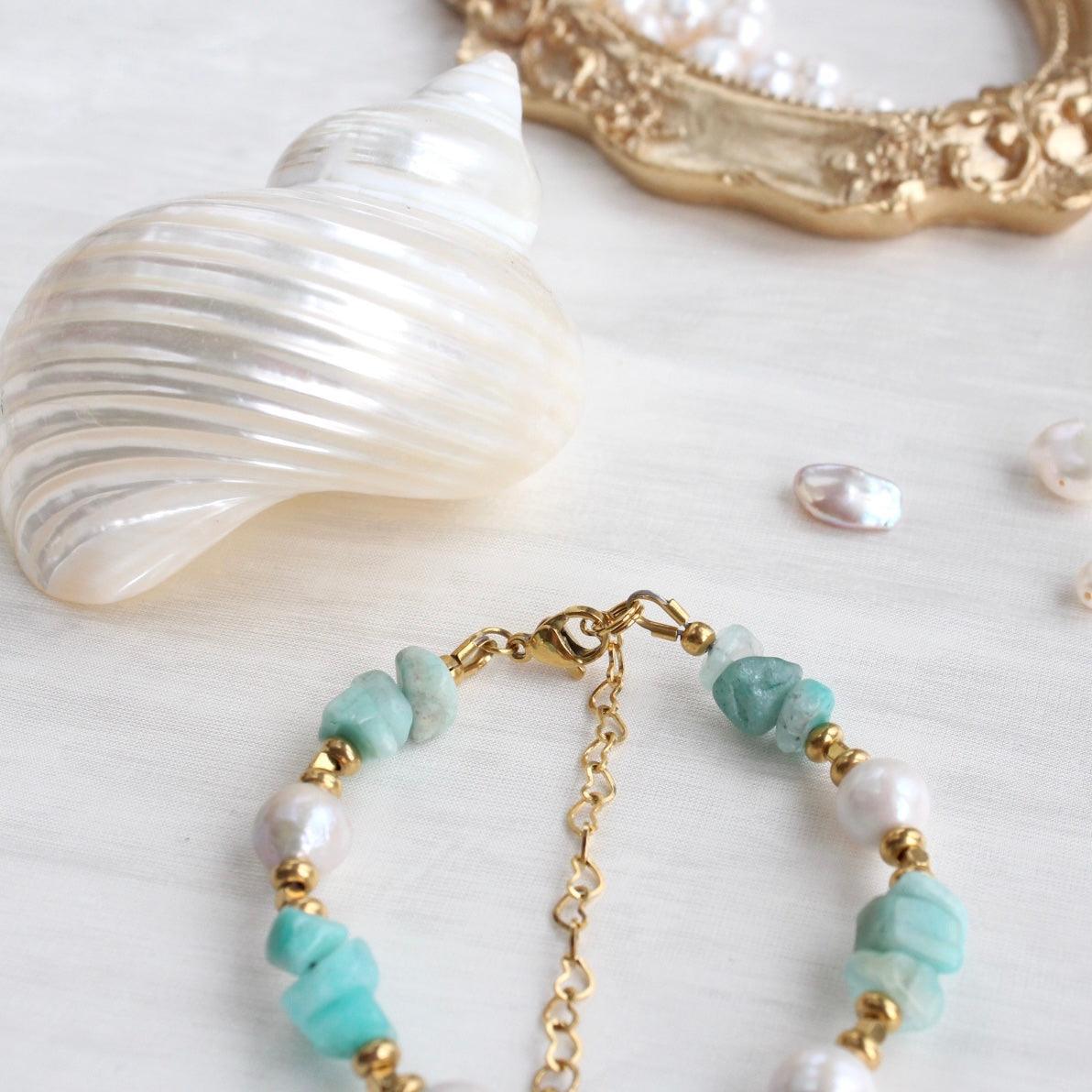 Melissa is a must-have for anyone who loves natural gemstones and pearls. Amazonite, an irregularly shaped natural healing stone, is paired with 8 to 9mm round natural freshwater pearls. This handcrafted bracelet is crafted with meticulous attention to detail. The components are made of stainless steel and plated with 18-karat gold, making it water and sweat resistant. Its unique beauty and sophistication make it an essential accessory for any jewelry collection.