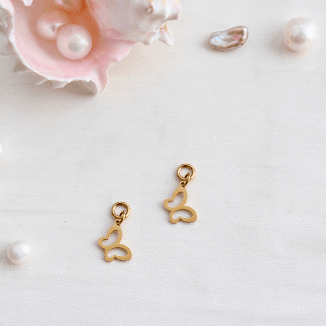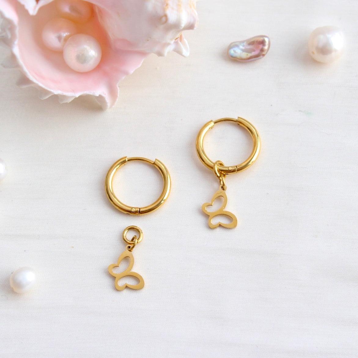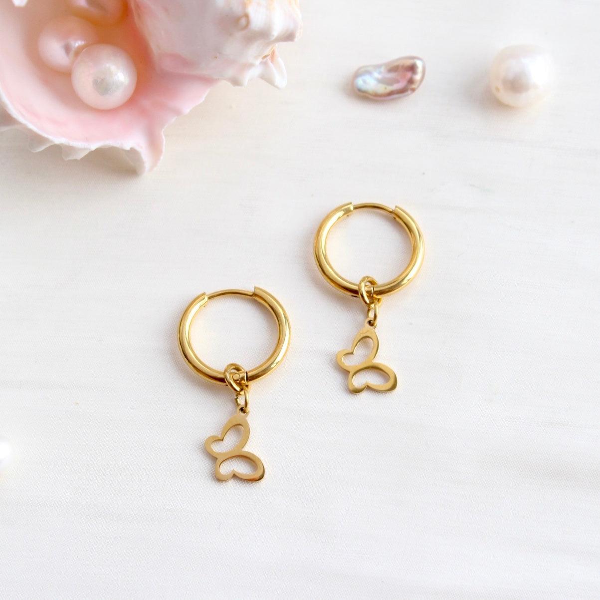 Classic, versatile earrings with a butterfly pendant add timeless elegance. These stylish stainless steel hoop earrings are highly polished and plated with 18-karat gold. The earrings are water-resistant and hypoallergenic.