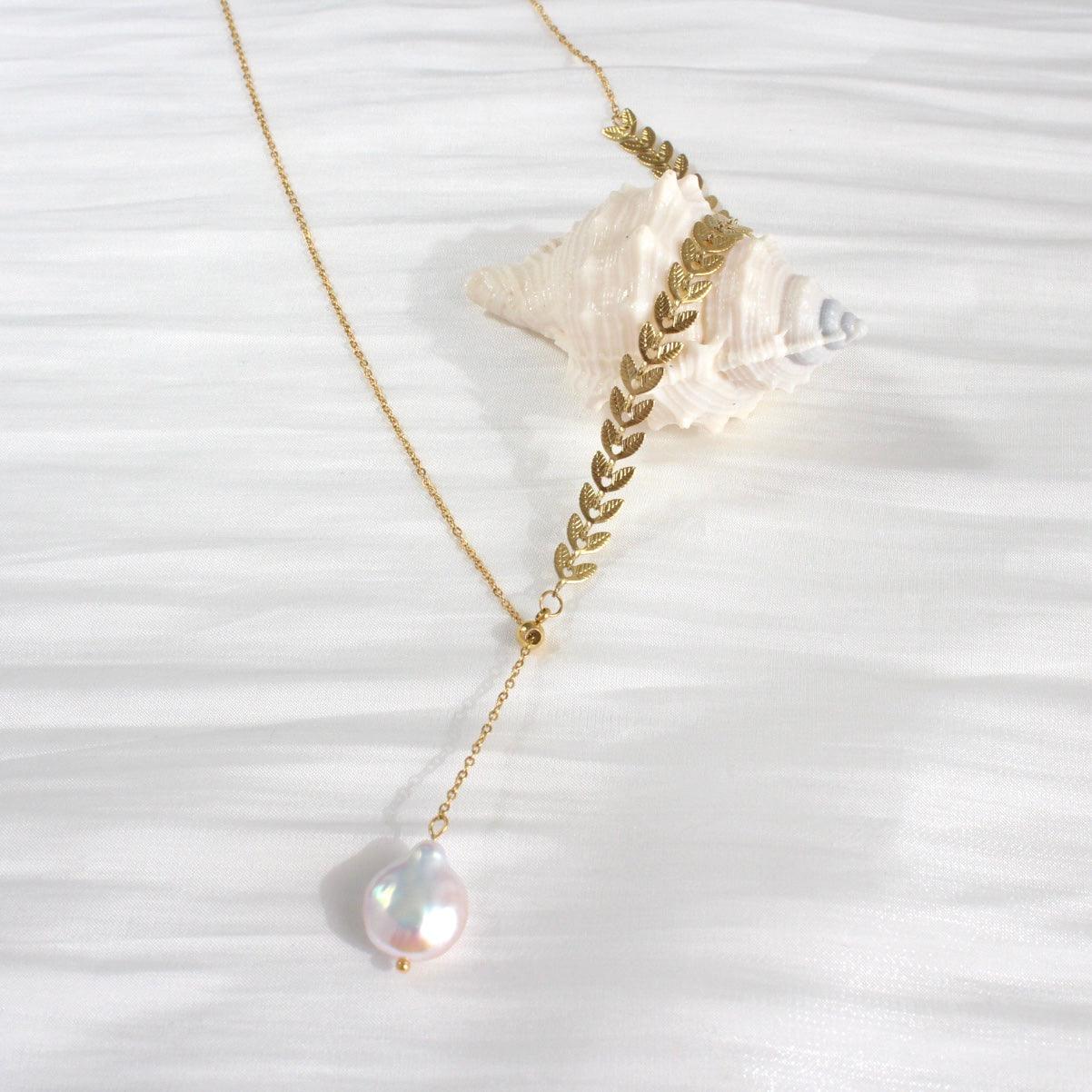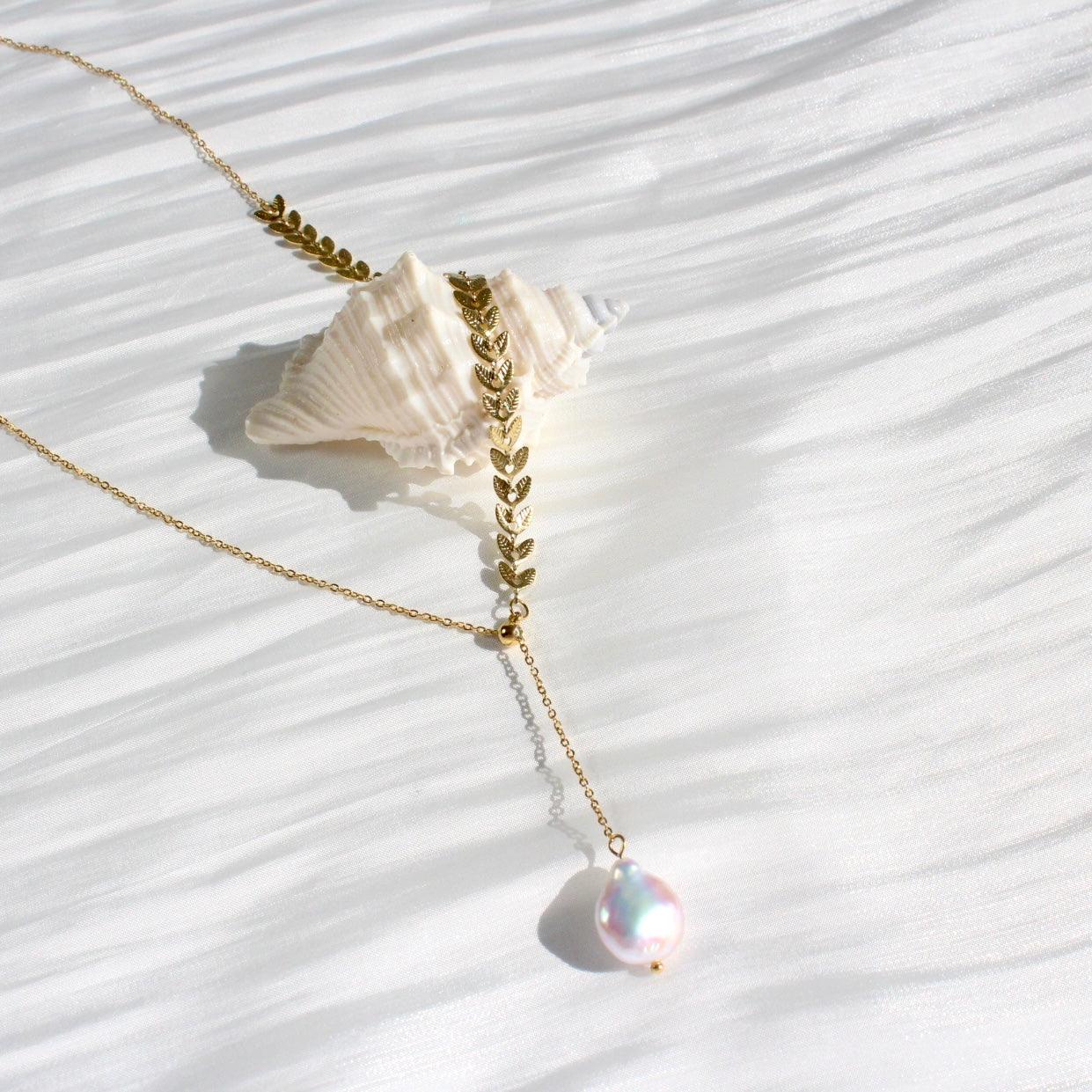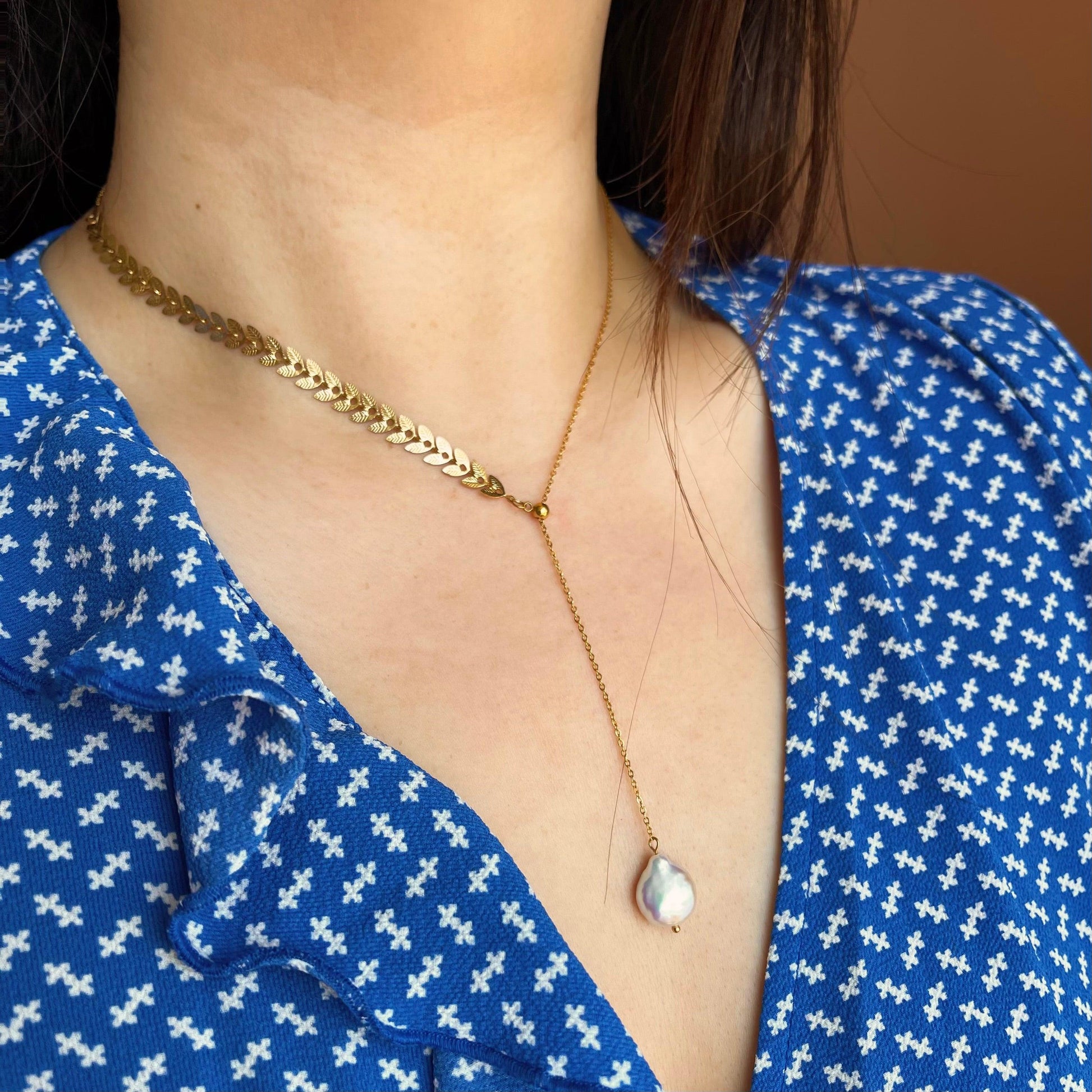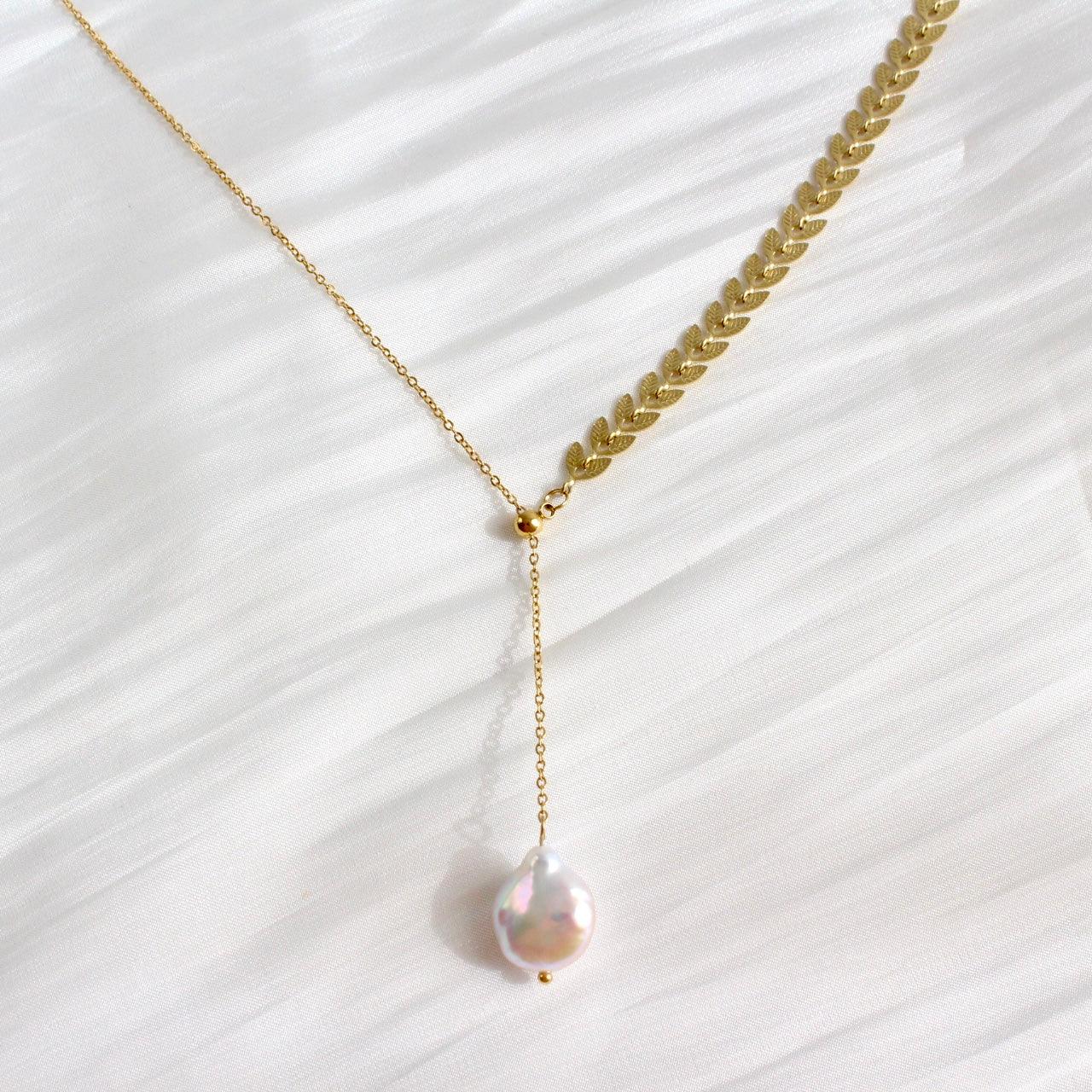 Unique in its shape and shine, this Camila Y-necklace combines timeless sophistication with a modern twist. A special highlight is the lustrous, flawless button-shaped baroque pearl, which elegantly rounds off the design as a pendant. The asymmetrical combination of a delicate ear of wheat on one side and an adjustable chain strand on the other allows for flexible adjustment of the pendant's length – ideal for harmoniously adapting to any neckline and look.