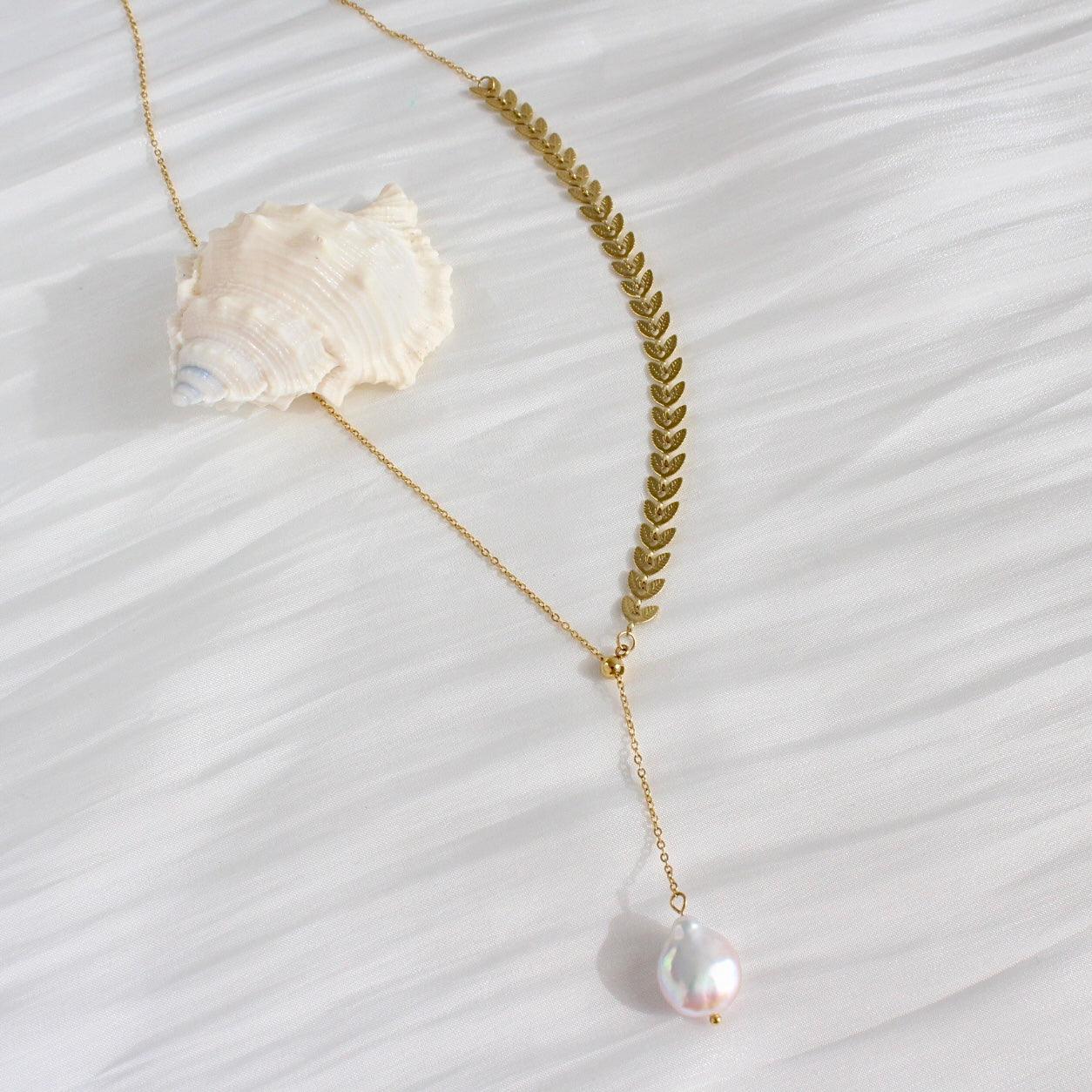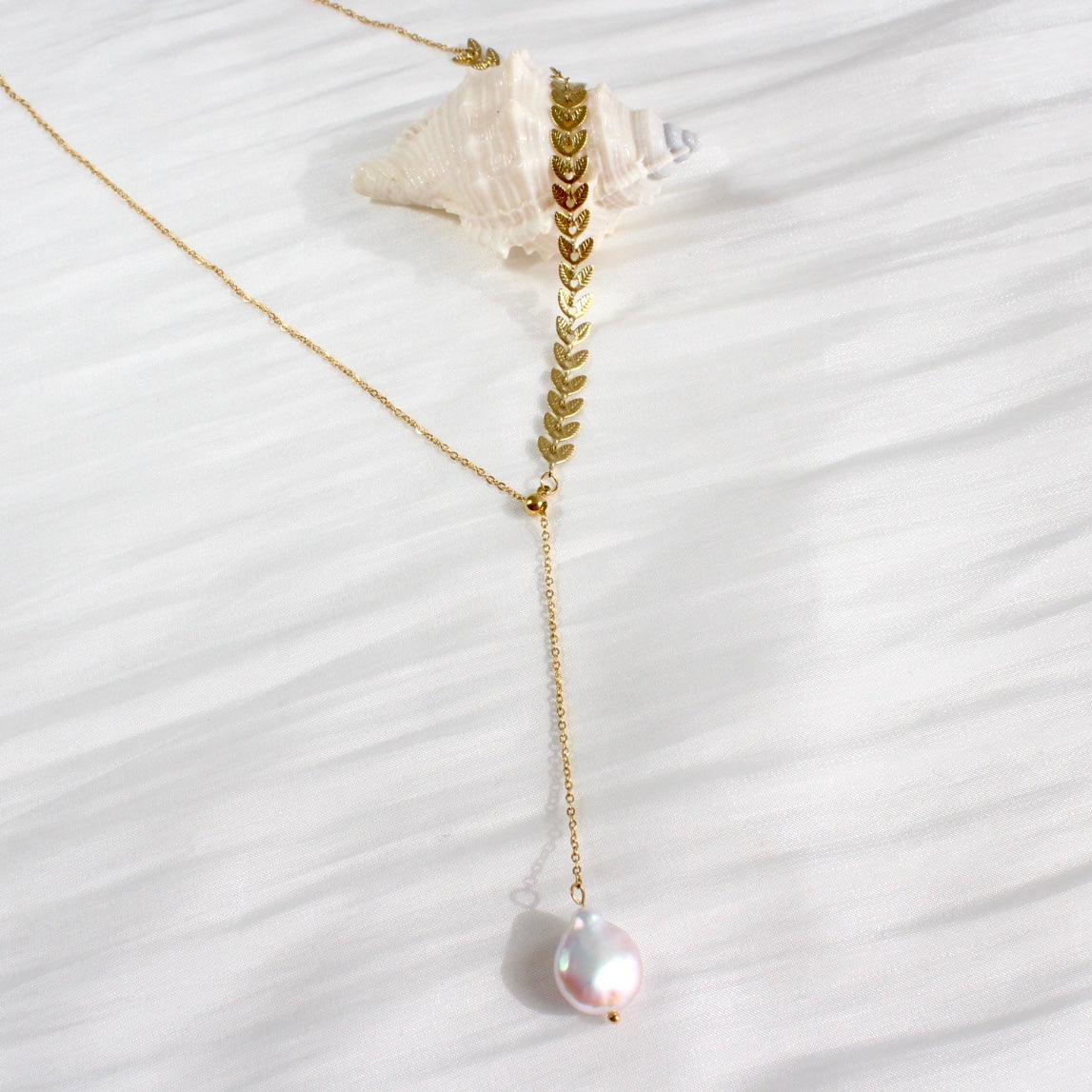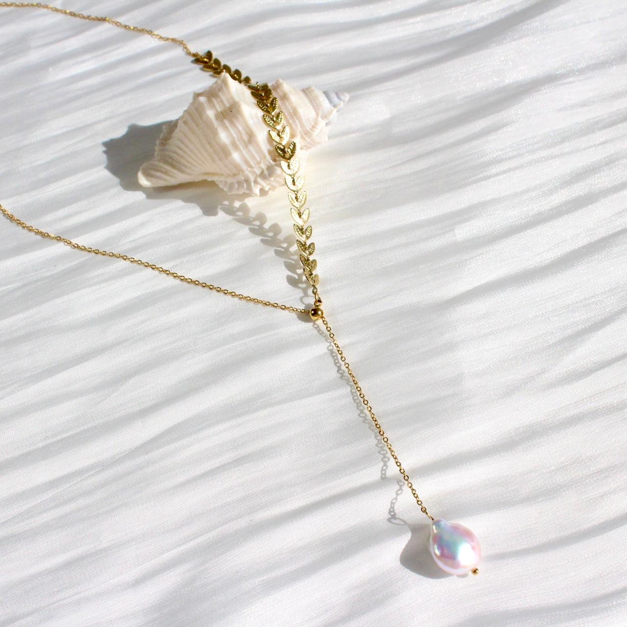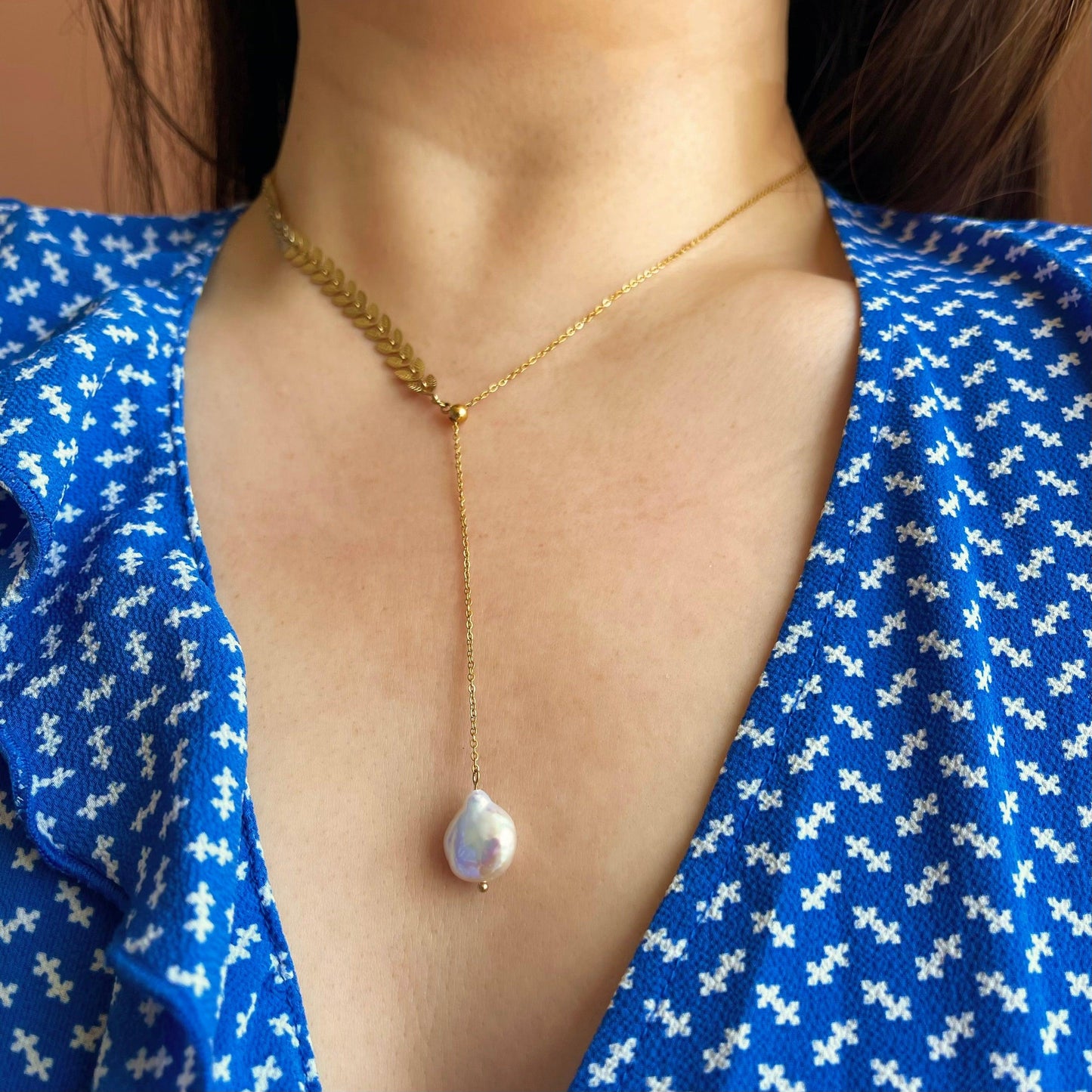 Unique in its shape and shine, this Camila Y-necklace combines timeless sophistication with a modern twist. A special highlight is the lustrous, flawless button-shaped baroque pearl, which elegantly rounds off the design as a pendant. The asymmetrical combination of a delicate ear of wheat on one side and an adjustable chain strand on the other allows for flexible adjustment of the pendant's length – ideal for harmoniously adapting to any neckline and look.