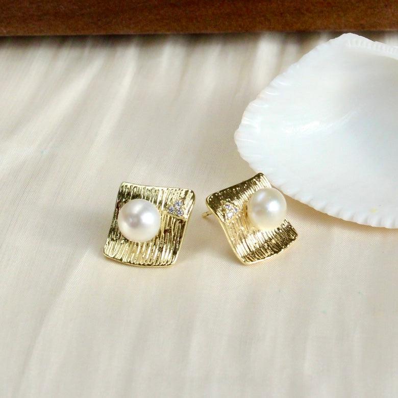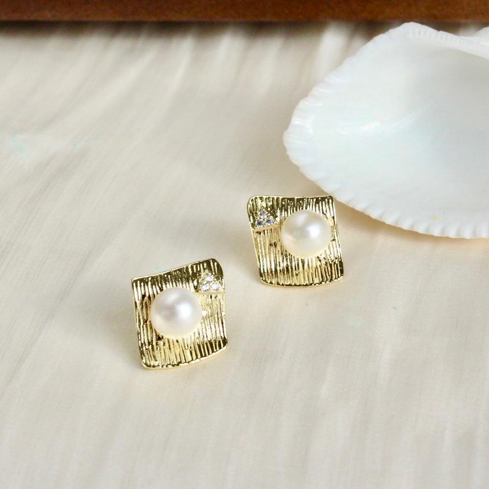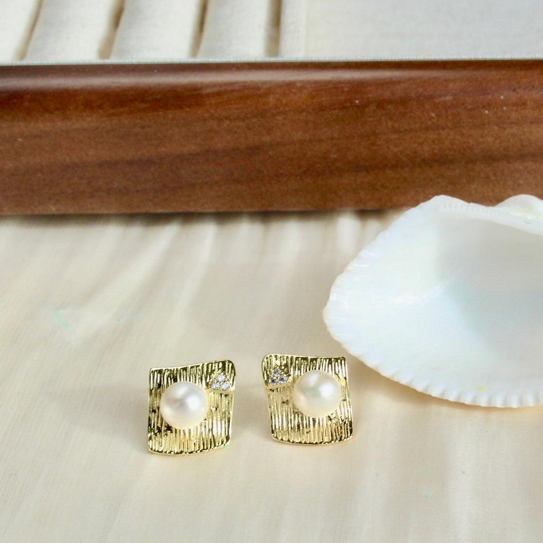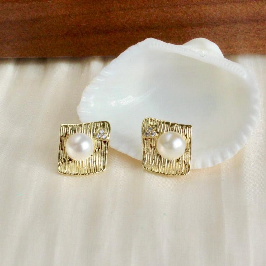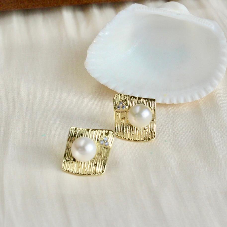 Zoya, where classic meets style. Diamond-shaped stud earrings set with sparkling zirconia and adorned with a 7.5mm white freshwater pearl. Elegant and stylish at the same time.