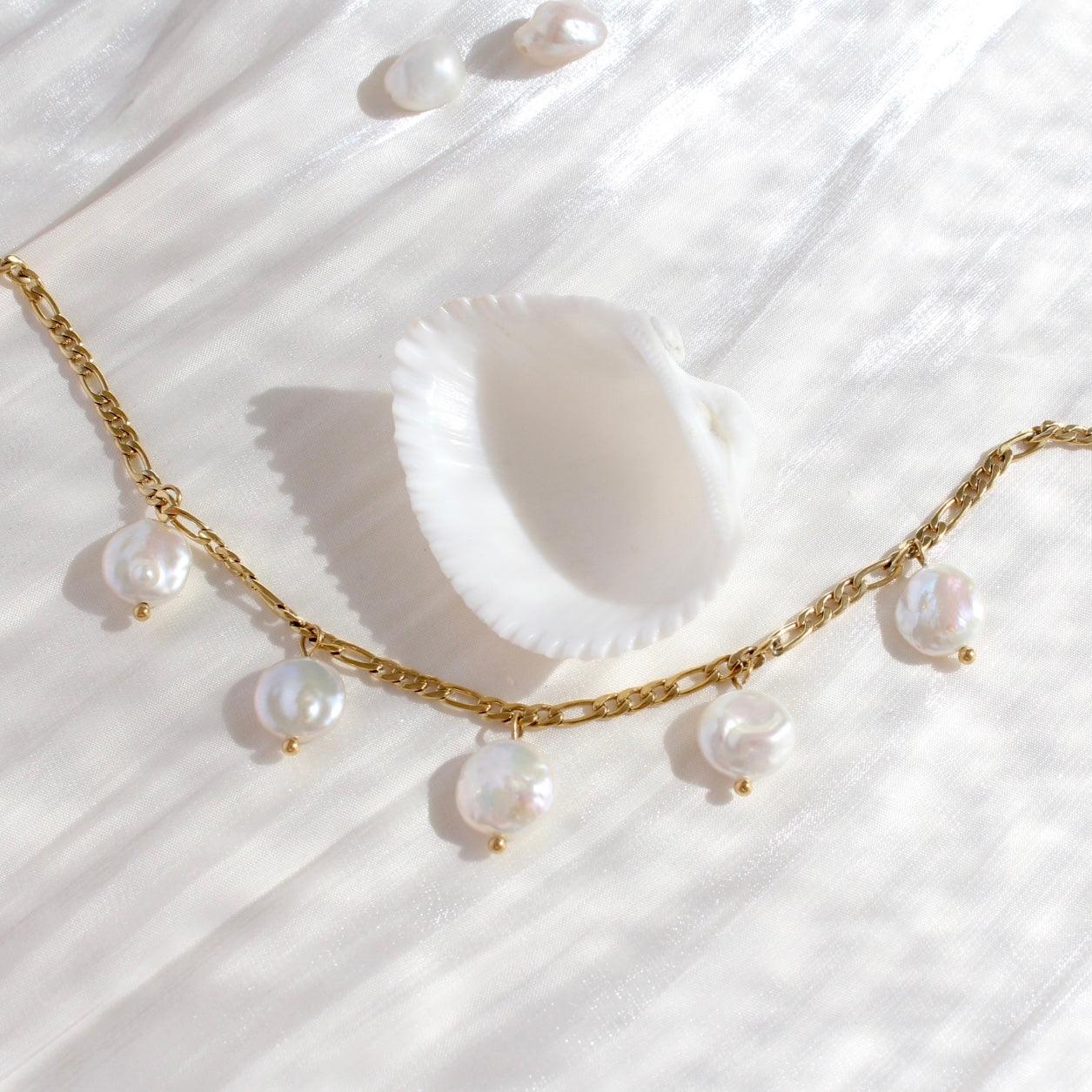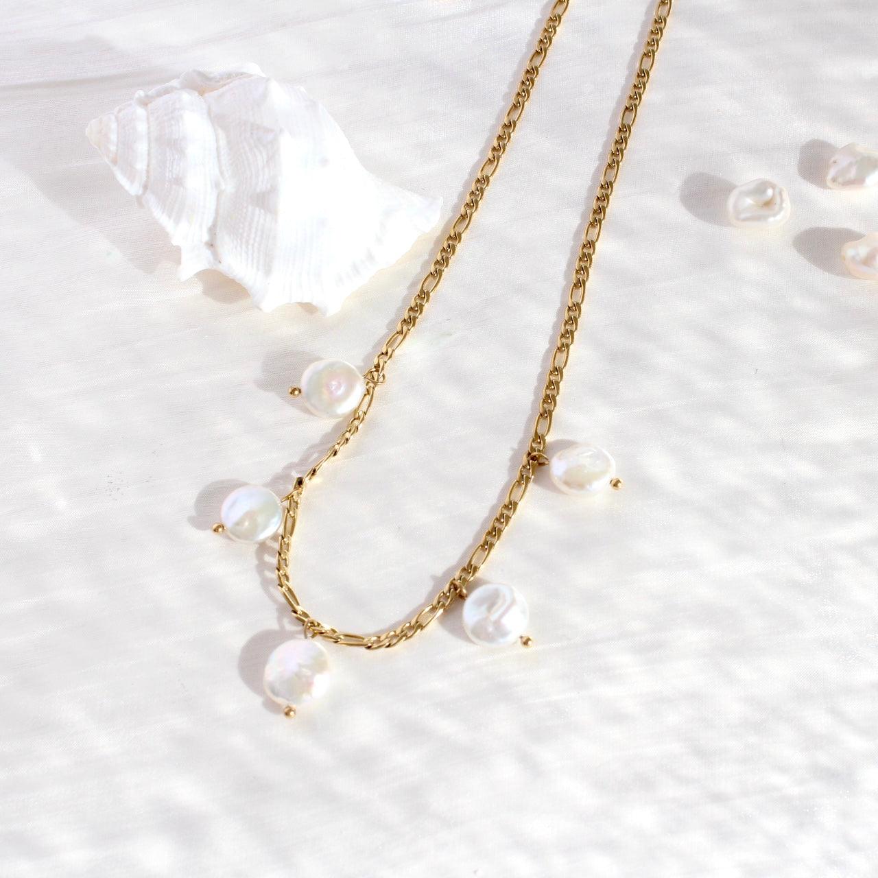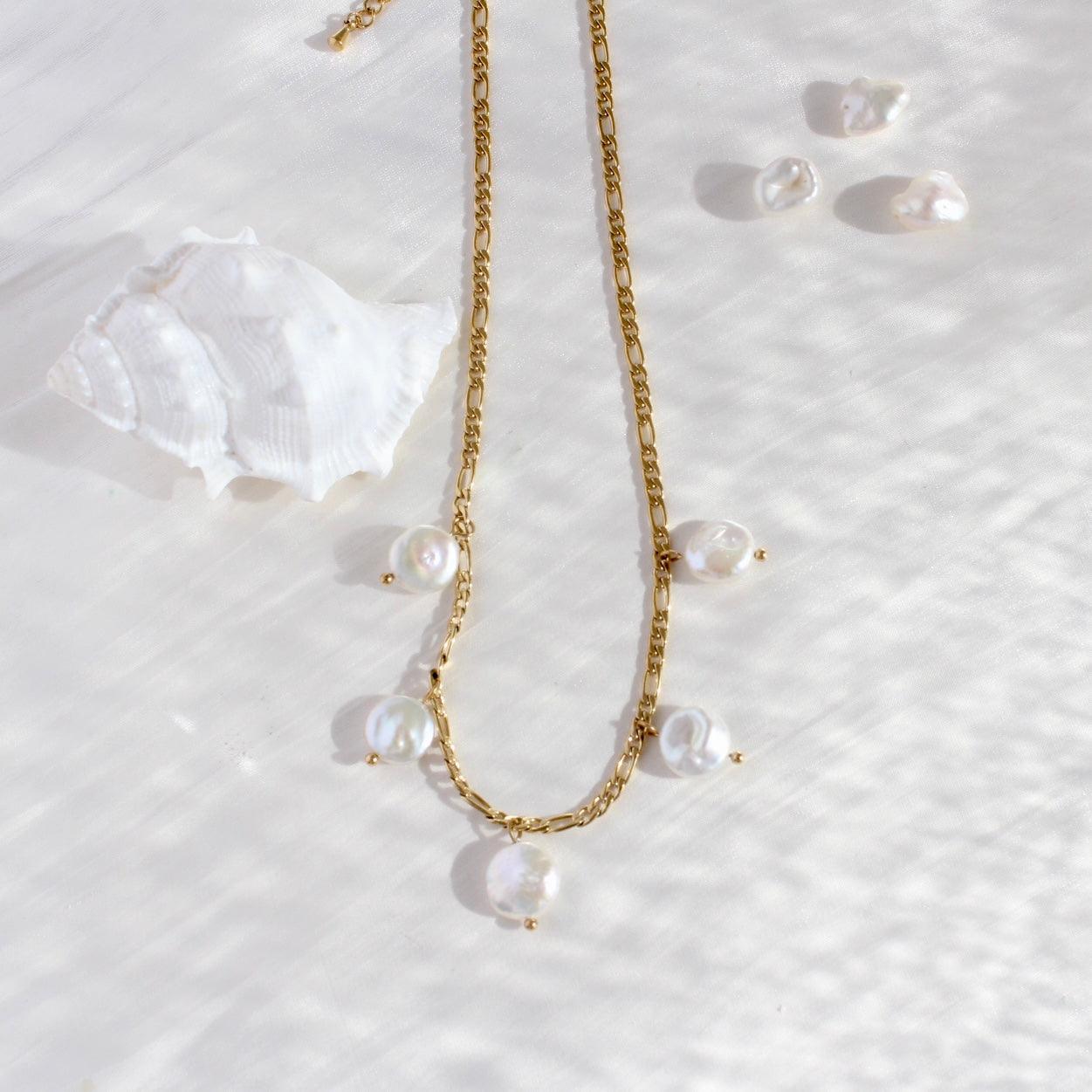 Ainara, cinq perles baroques brillantes en forme de bouton, chacune unique par sa forme et son éclat, confèrent à ce collier son caractère unique. Les perles d'eau douce naturelles ont été soigneusement sélectionnées et s'harmonisent harmonieusement pour créer un design à la fois moderne et intemporel.