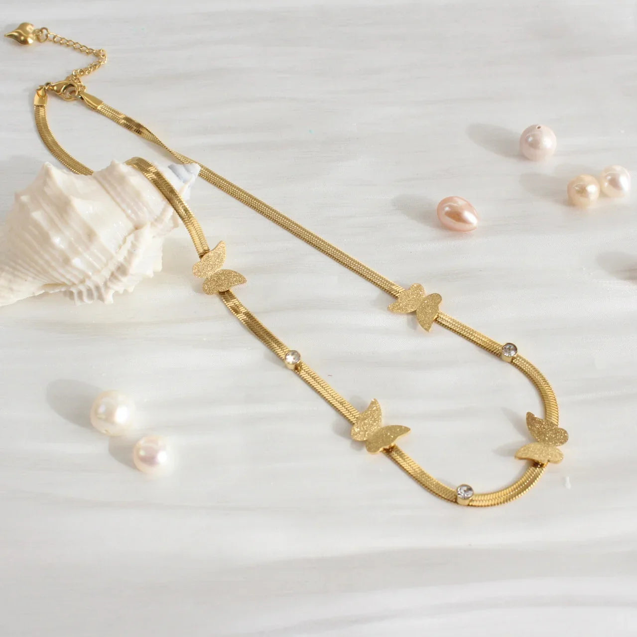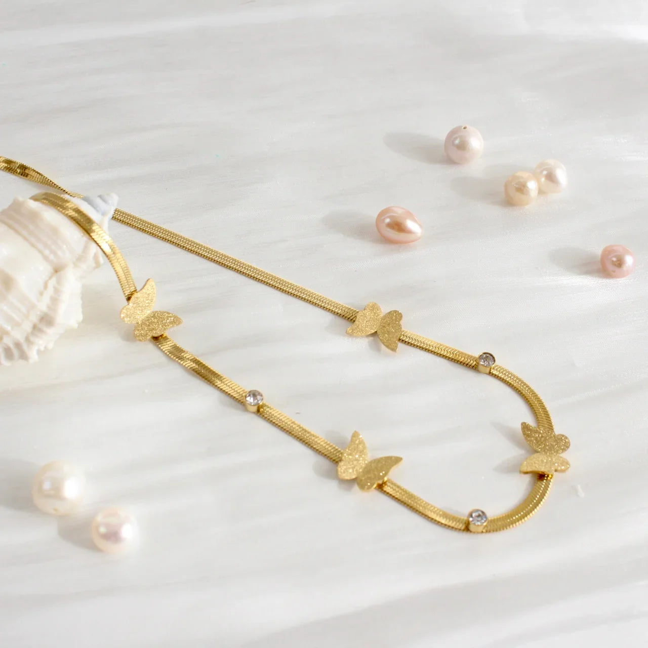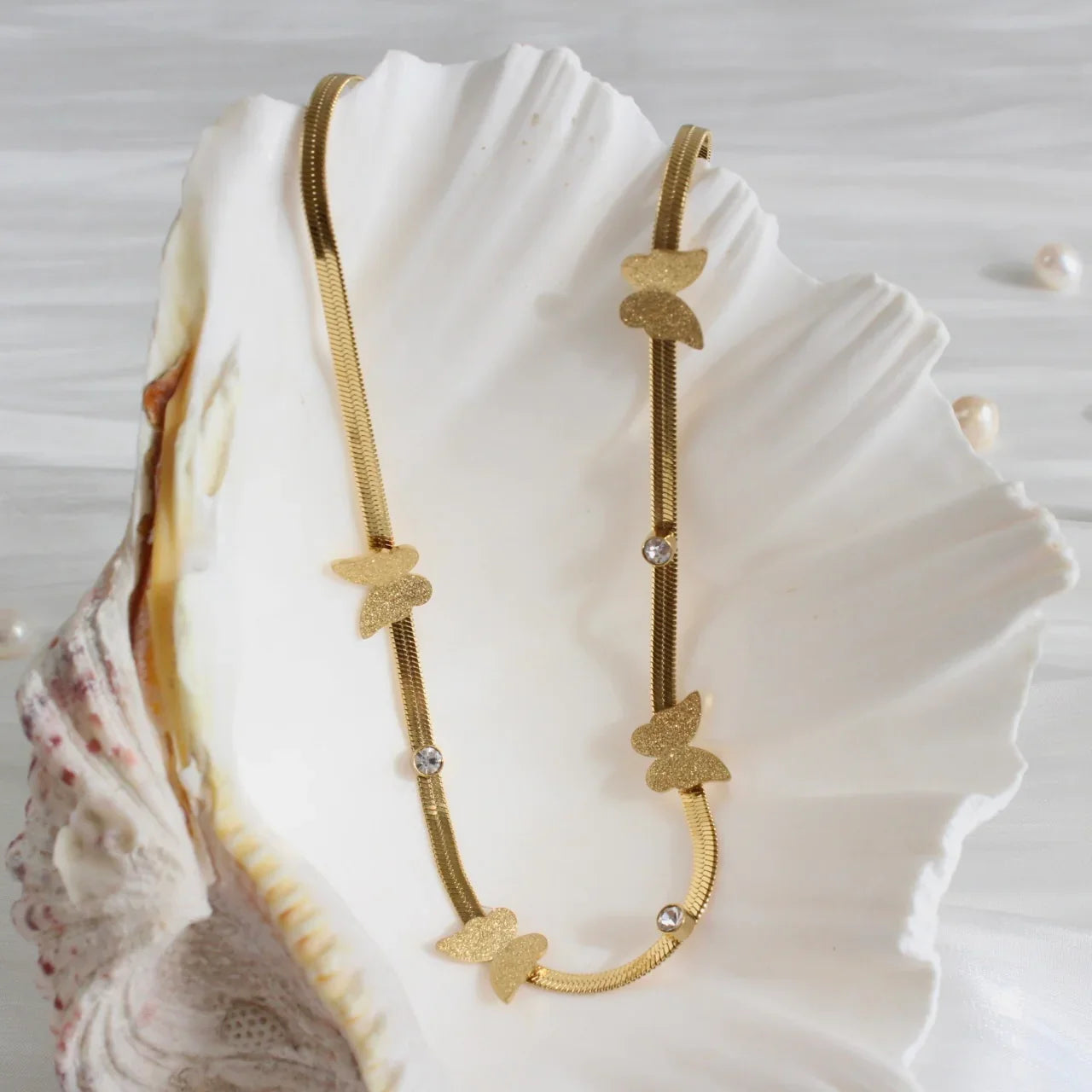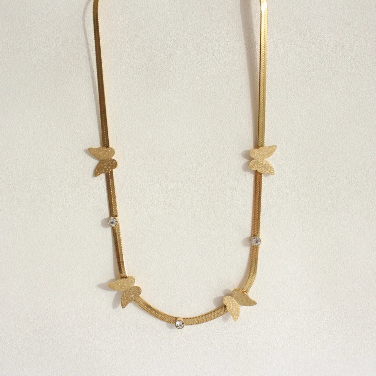 Kali, un collier élégant composé d'une élégante chaîne serpent et d'un pendentif papillon aux détails soignés. Les papillons, vibrants de vie, sont sublimés par des zircones étincelantes qui brillent de mille feux. Le pendentif, soigneusement poli et fini en or véritable 18 carats, offre un éclat éclatant et une personnalité expressive.