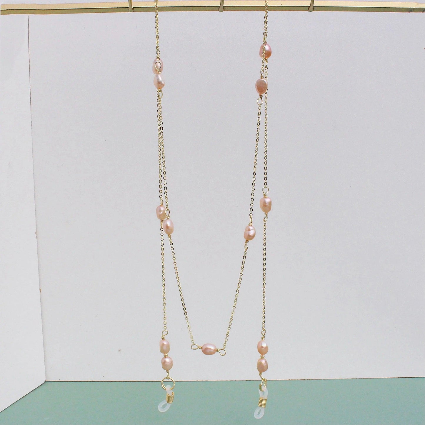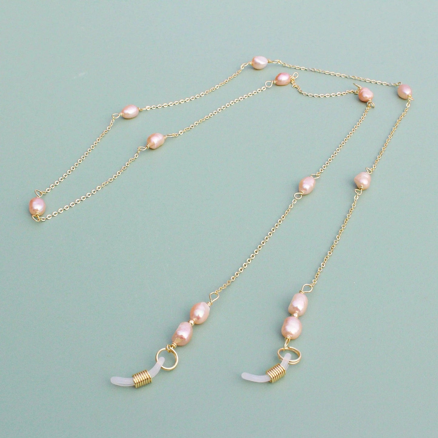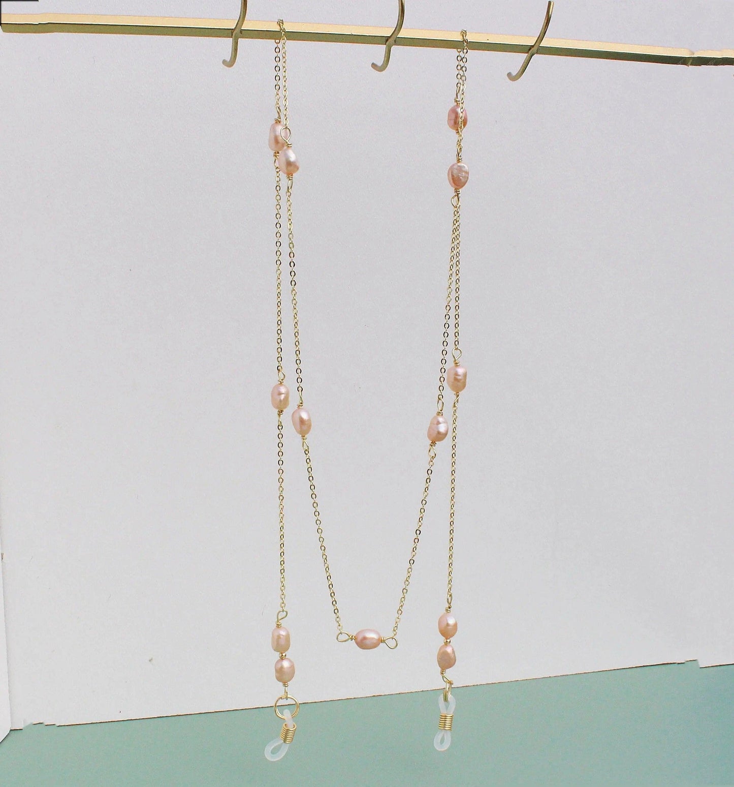 Elegante catena per occhiali fatta a mano con perle barocche uniche e placcata oro vero 18 carati. Design elegante e unico che si abbina a qualsiasi occhiale da vista o da sole.