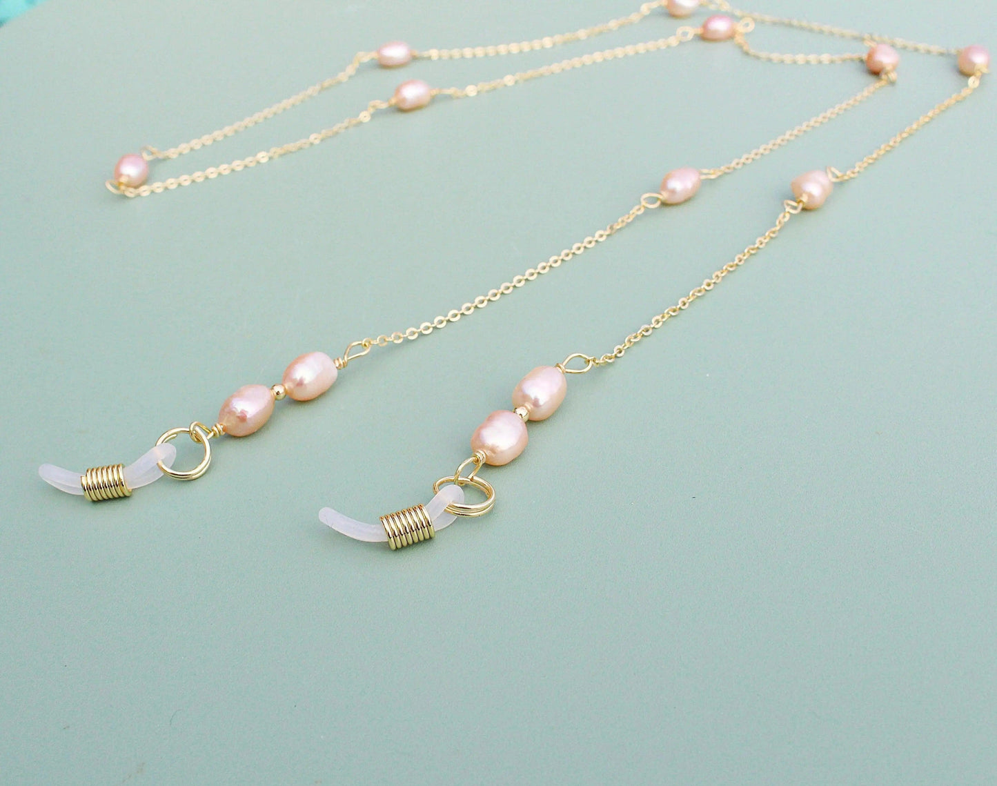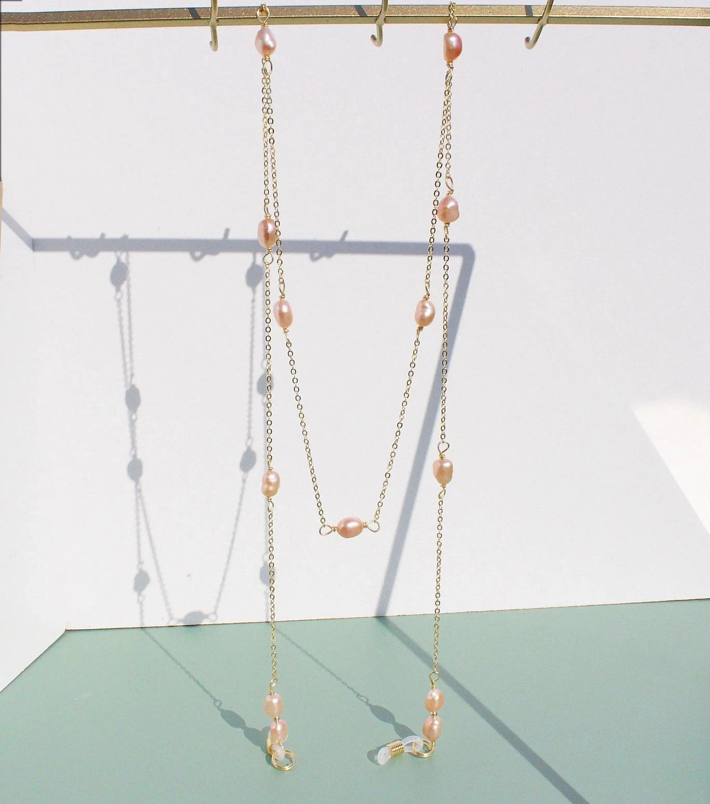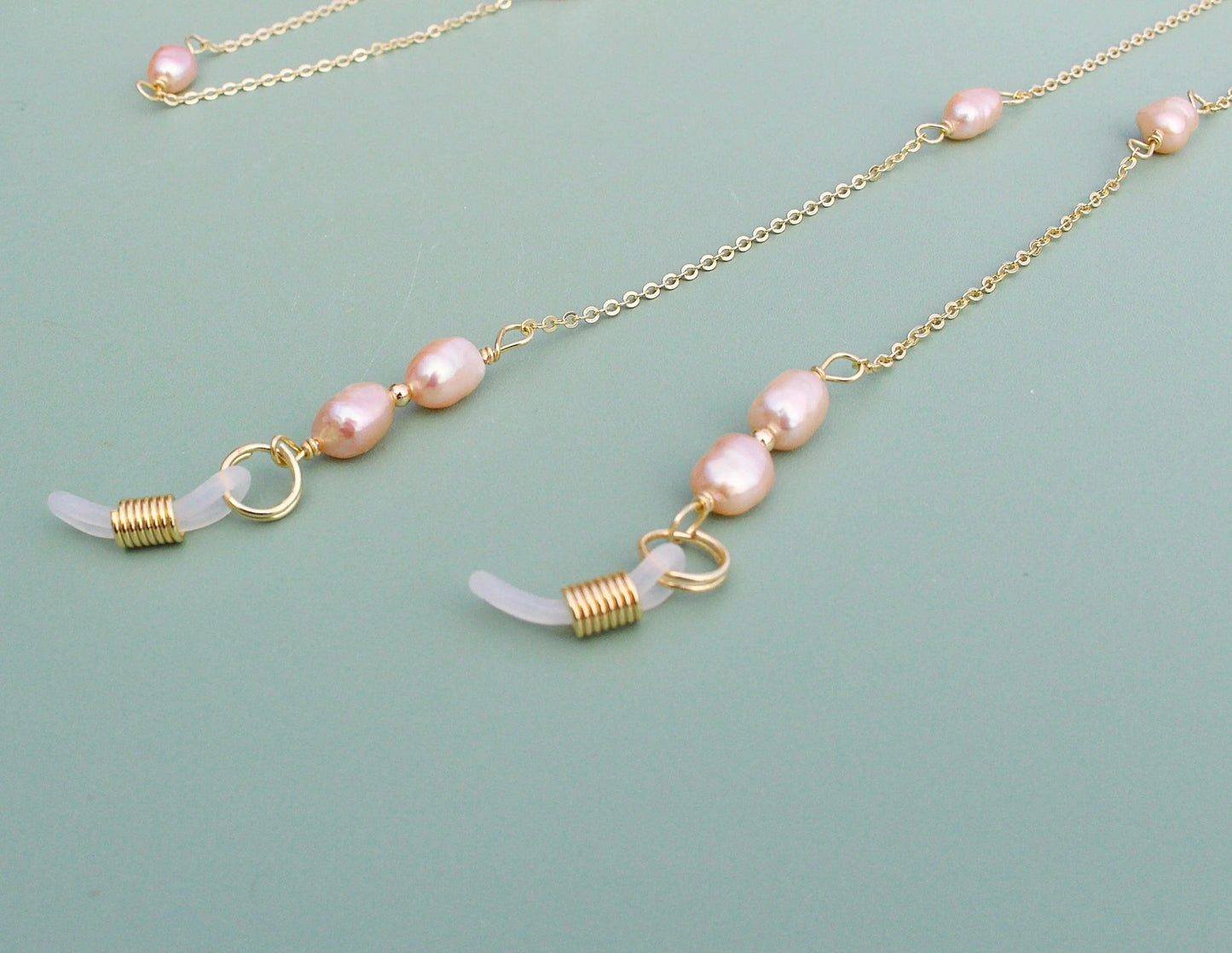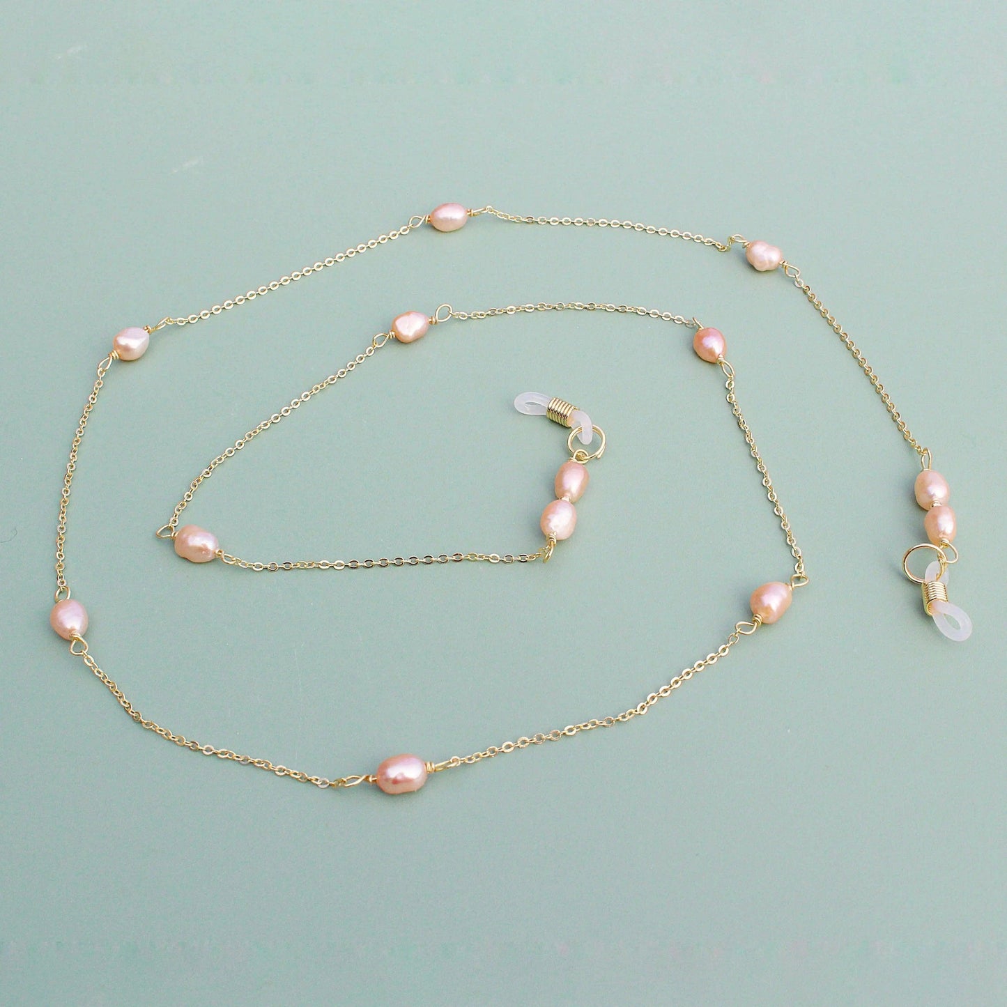 Elegante catena per occhiali fatta a mano con perle barocche uniche e placcata oro vero 18 carati. Design elegante e unico che si abbina a qualsiasi occhiale da vista o da sole.