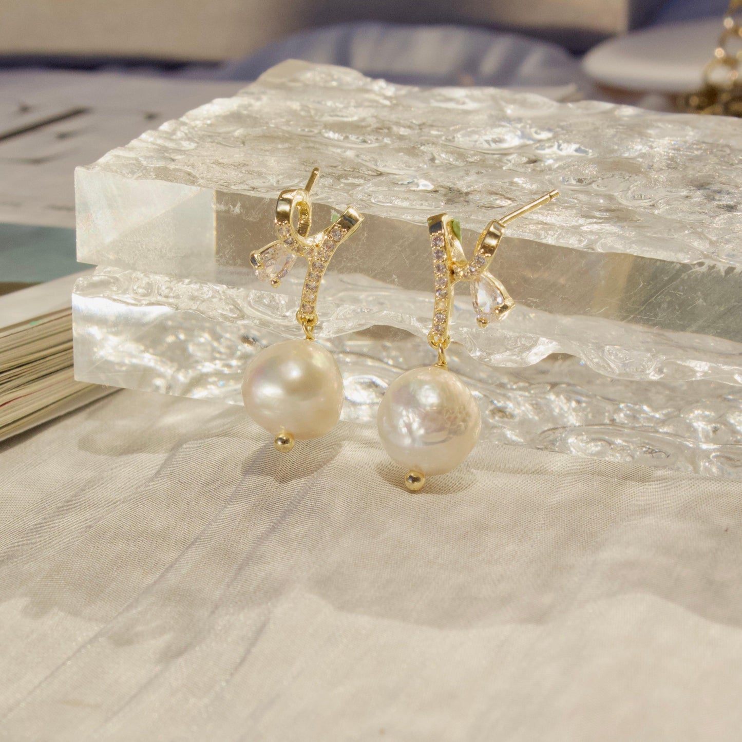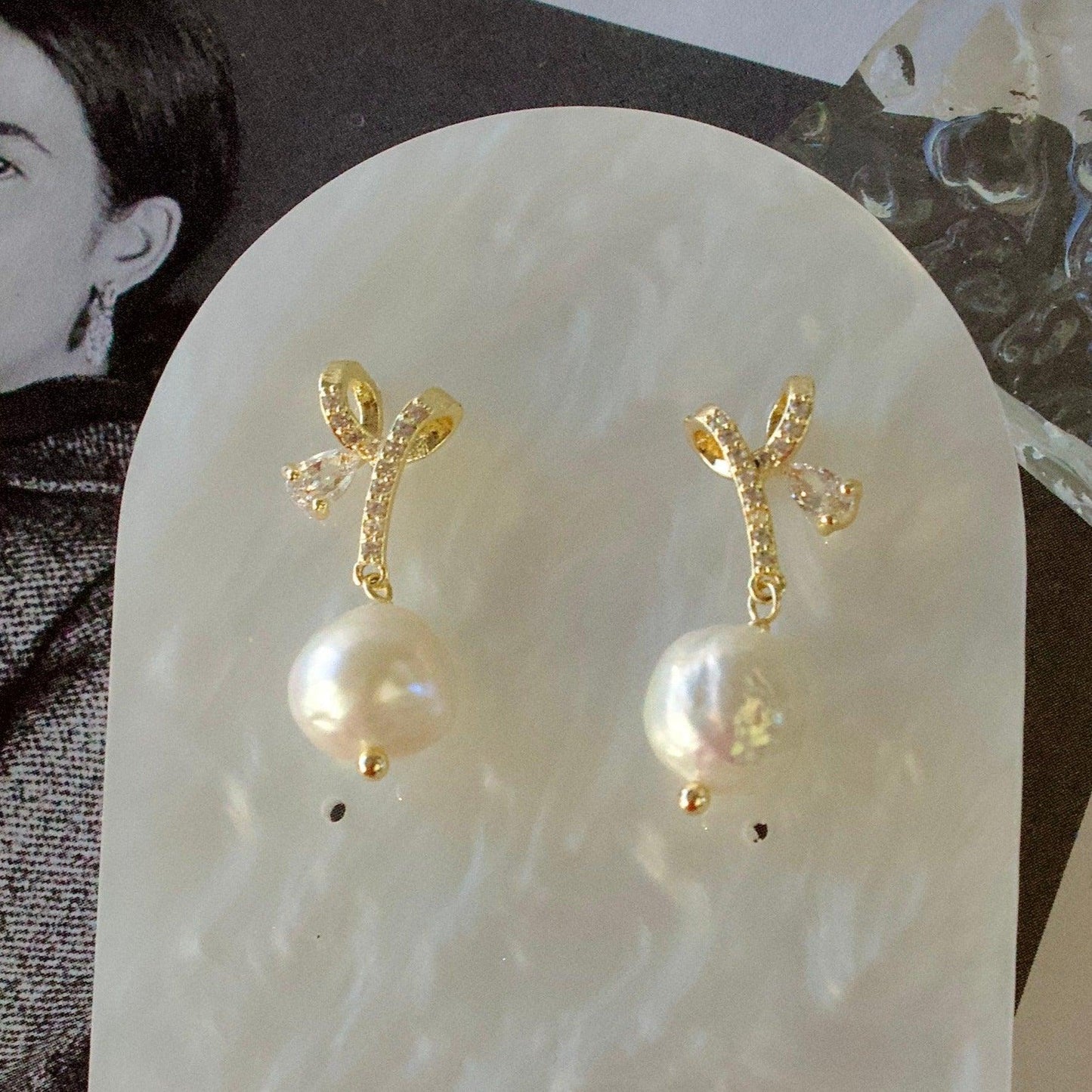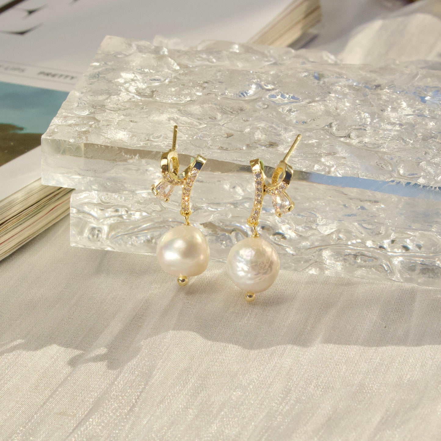 Orecchini pendenti di perle fatti a mano eleganti e unici. Placcato in oro 18 carati e incastonato con scintillanti zirconi a forma di fiocco con perle barocche rotonde. Le perle sono selezionate tra perle barocche d'acqua dolce e misurano 9,5 mm di diametro. Gli orecchini sono lunghi circa 2,5 cm. Una forma attraente e carina da indossare tutti i giorni o per le occasioni speciali.