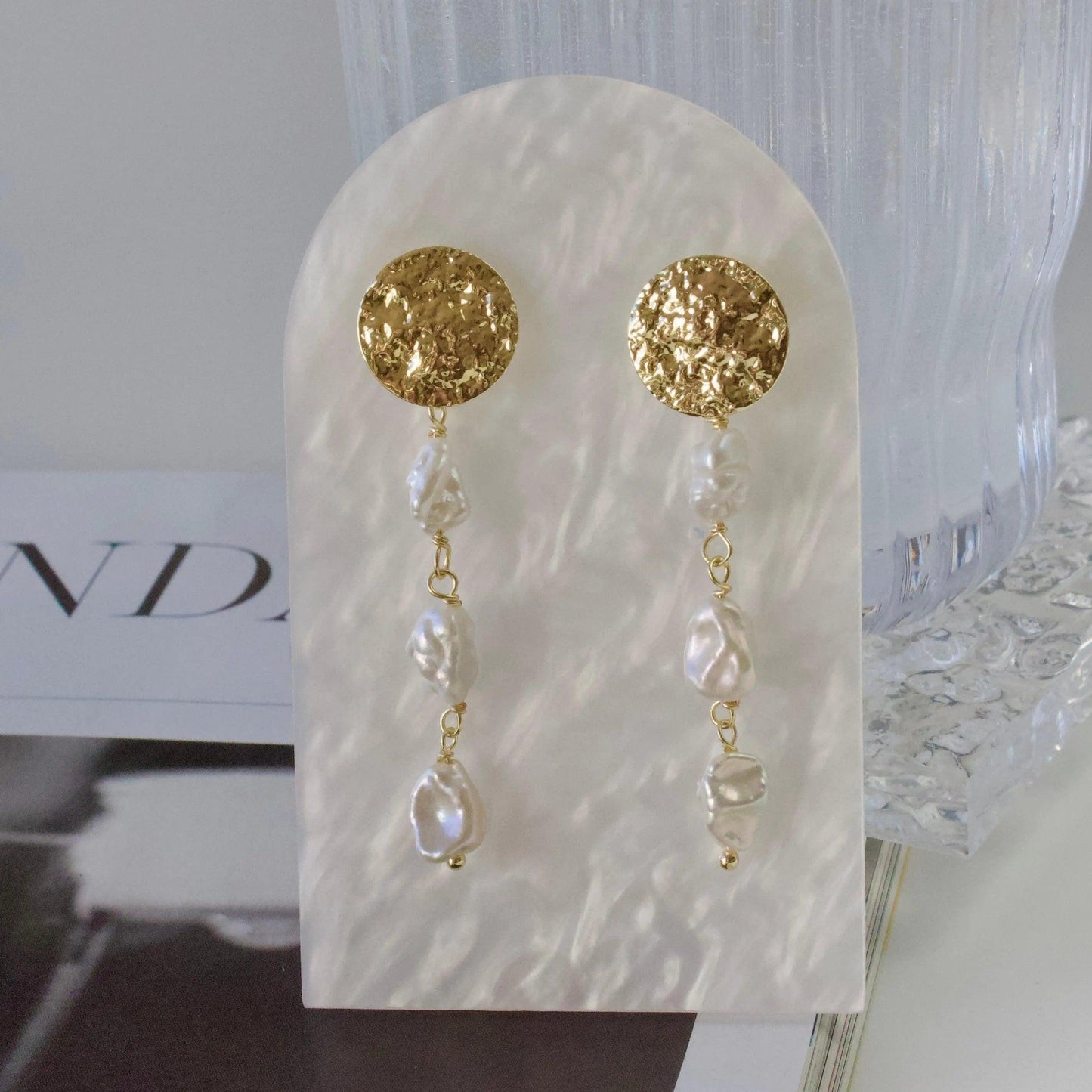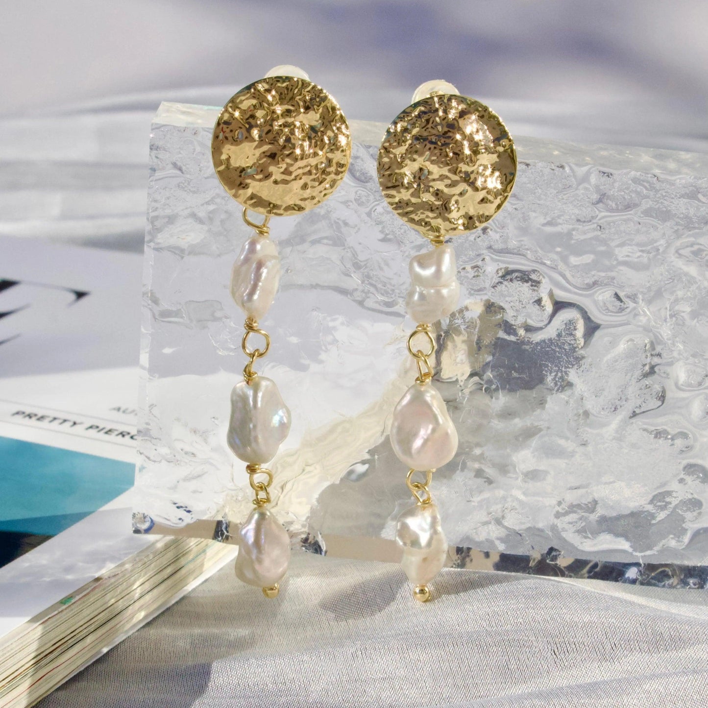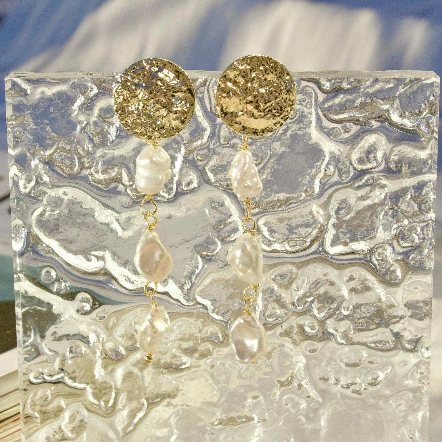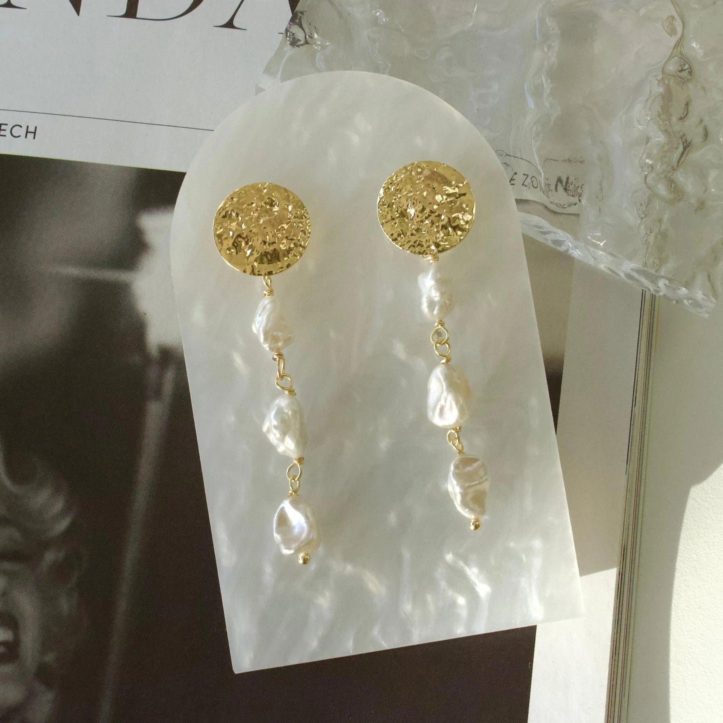 Orecchini pendenti di perle fatti a mano eleganti e unici. Orecchini tondi superficie lunare placcati oro 18k con perle barocche irregolari uniche e caratteristiche. Le perle sono perle barocche d'acqua dolce con un diametro di 7 mm. Gli orecchini sono lunghi circa 6 cm. Una forma attraente e carina da indossare tutti i giorni o per occasioni speciali.