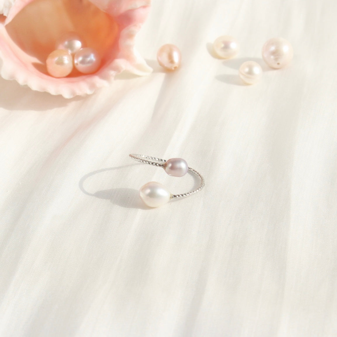 Der Ailany Doppel-Perlenring verkörpert zeitlose Eleganz und natürliche Schönheit. Im Mittelpunkt stehen zwei sorgfältig ausgewählte Süsswasserperlen, die jede Kombination zu einem Unikat machen. Ob zwei reine, weisse Perlen oder die raffinierte Harmonie aus Weiss und einem zarten Violett- oder Rose – jede Farbkombination entsteht durch die Natur und verleiht dem Ring seinen einzigartigen Charakter.