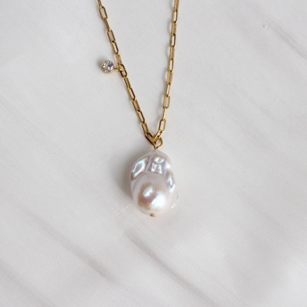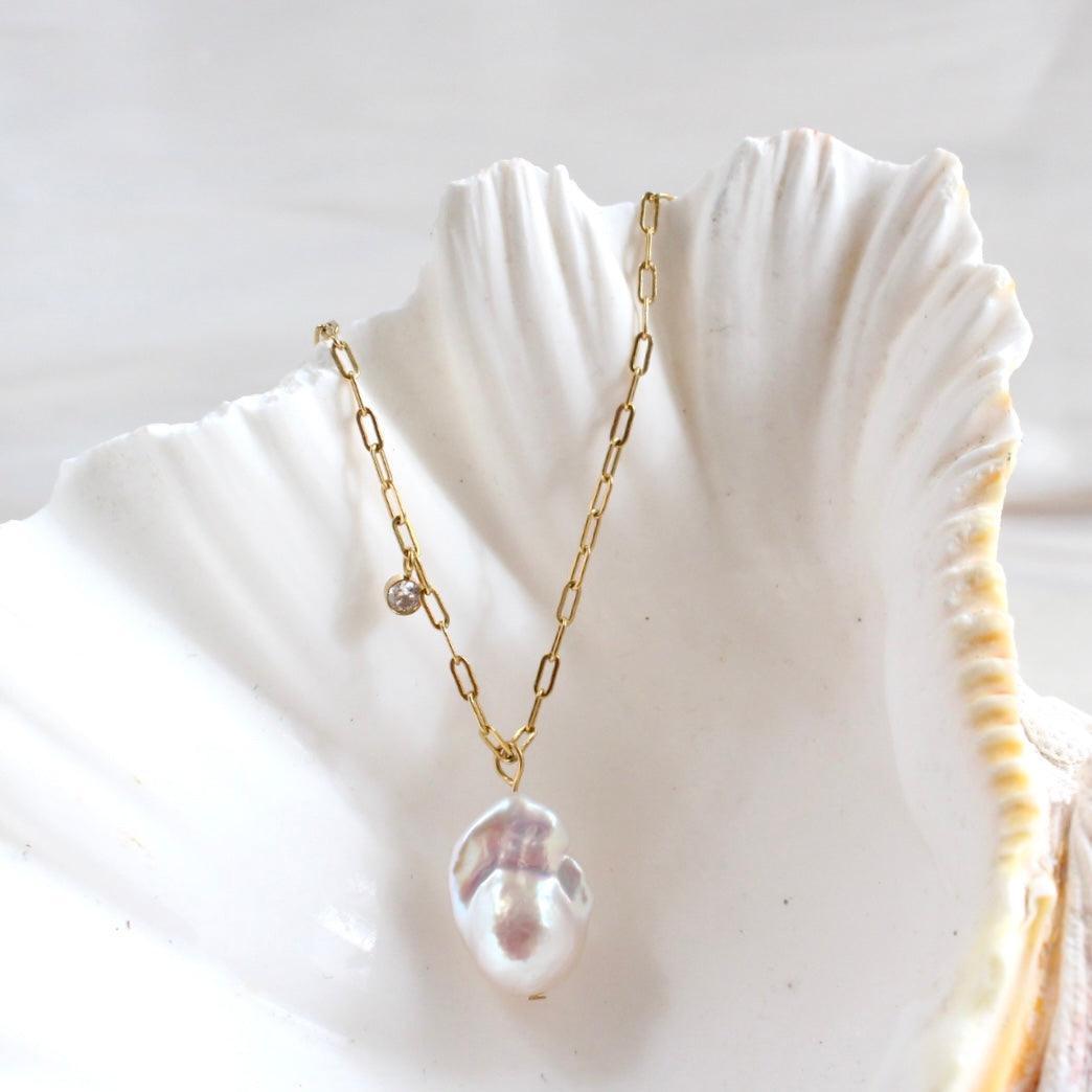 Diese Halskette hat eine wunderschöne und einzigartige natürliche Süsswasser-Barockperle. Die hochwertige, sorgfältig ausgewählte Perle misst etwa 13 x 19mm und ist mit einem zarten, funkelnden Zirkonia-Anhänger kombiniert. Die Komponenten der Halskette sind aus hochwertigem Stahl gefertigt und mit 18 Karat Echtgold beschichtet. Sie sind wasserbeständig und antiallergisch.