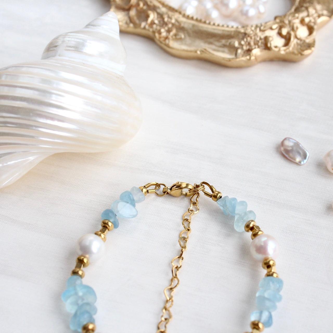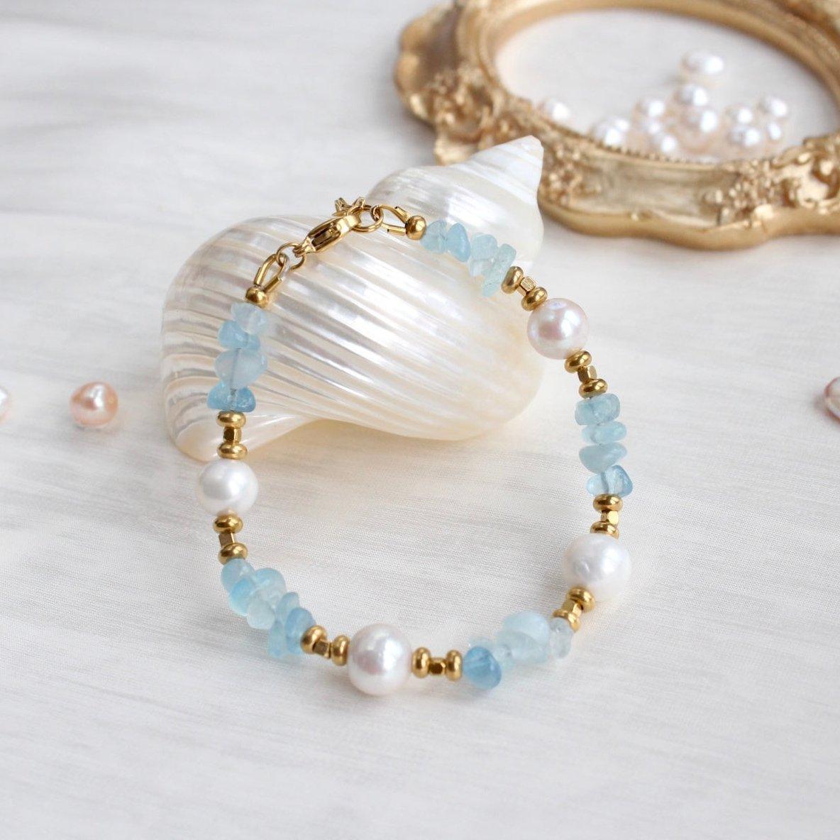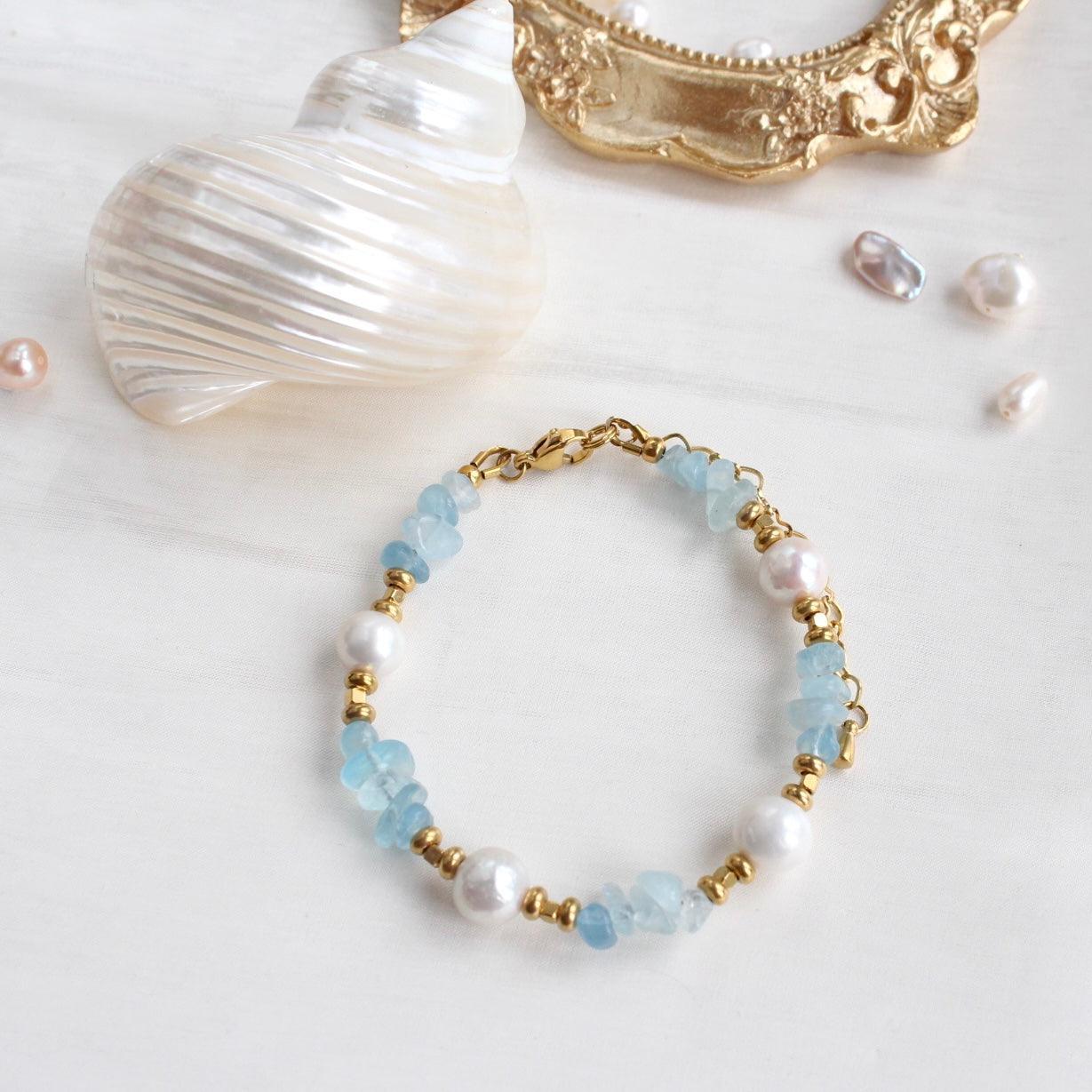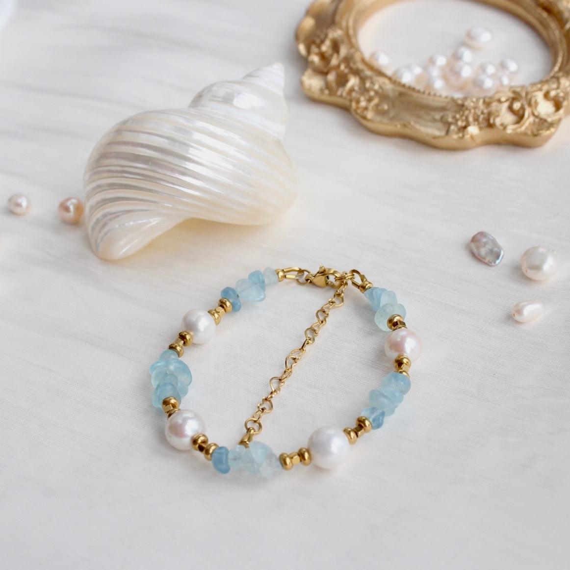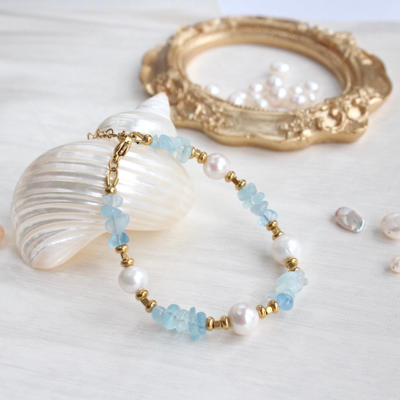 Melissa ist ein Must-Have für alle, die natürliche Edelsteine und Perlen lieben. Klarer Aquamarin, ein unregelmässig geformter natürlicher Heilstein, wird mit 8 bis 9mm grossen runden natürlichen Süsswasserperlen gepaart. Dieser handgefertigte Armschmuck wird mit viel Liebe zum Detail hergestellt. Die Komponenten sind aus rostfreiem Stahl gefertigt und mit 18 Karat Gold beschichtet, wodurch es wasser- und schweissbeständig ist. Seine einzigartige Schönheit und Raffinesse machen es zu einem unverzichtbaren Accessoire für jede Schmucksammlung.