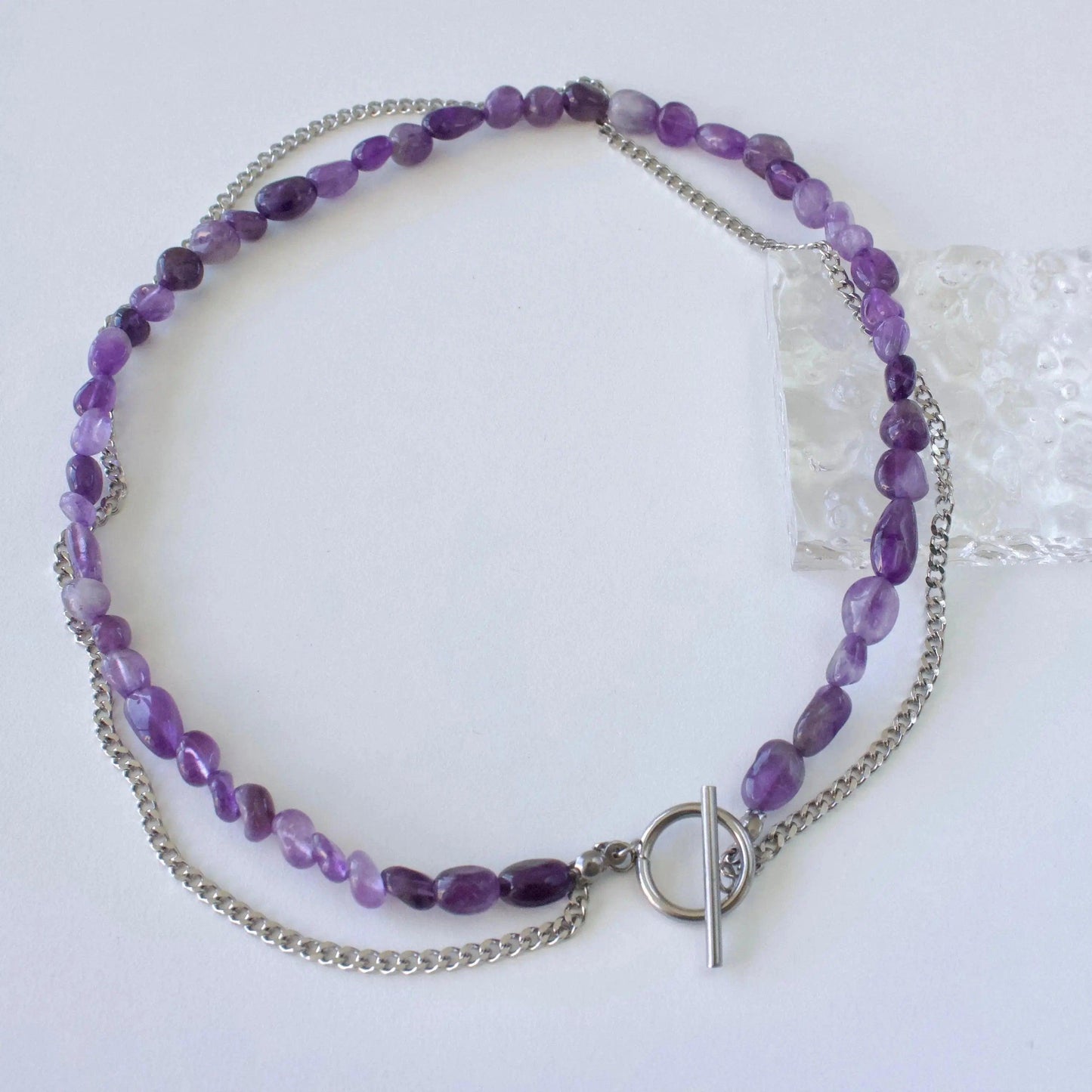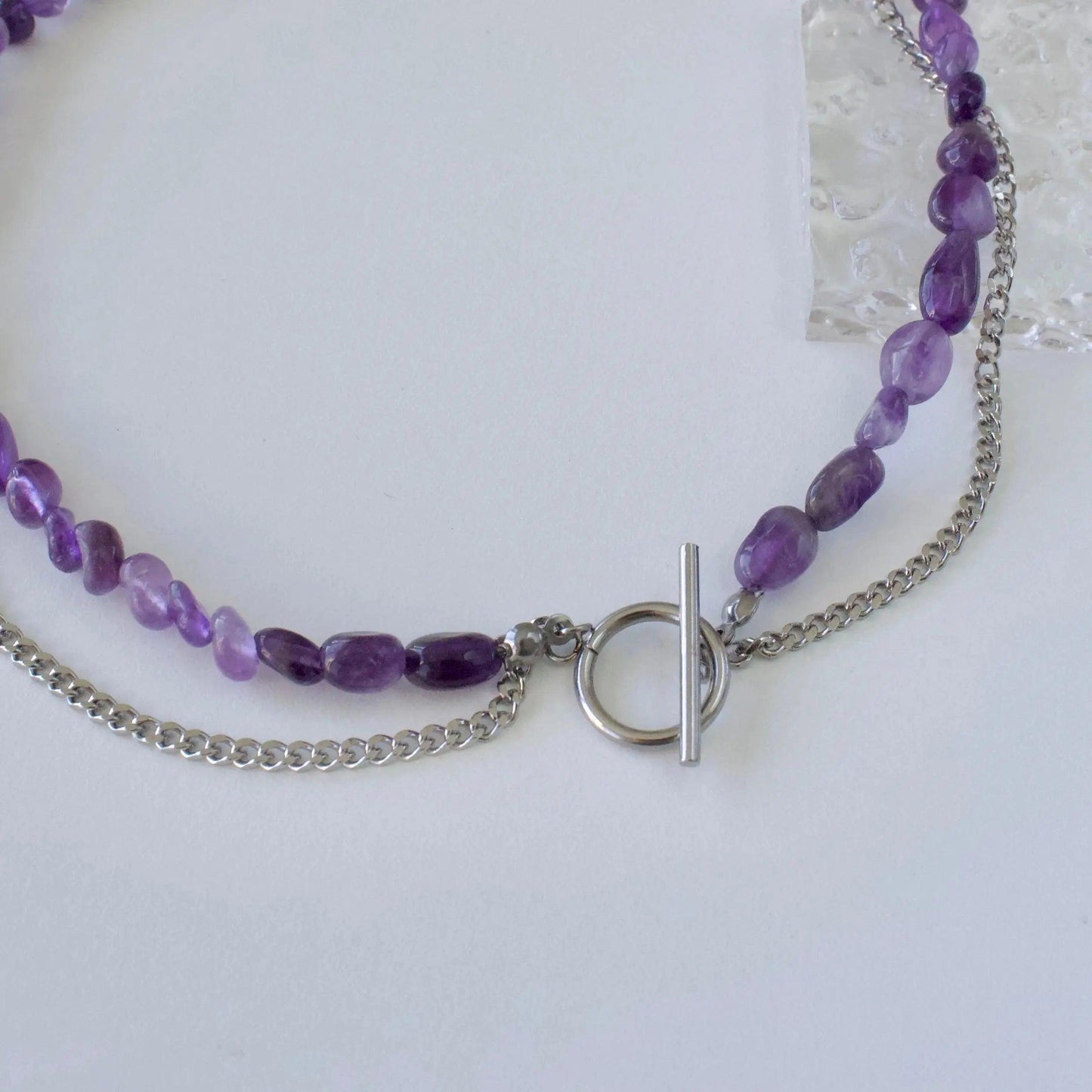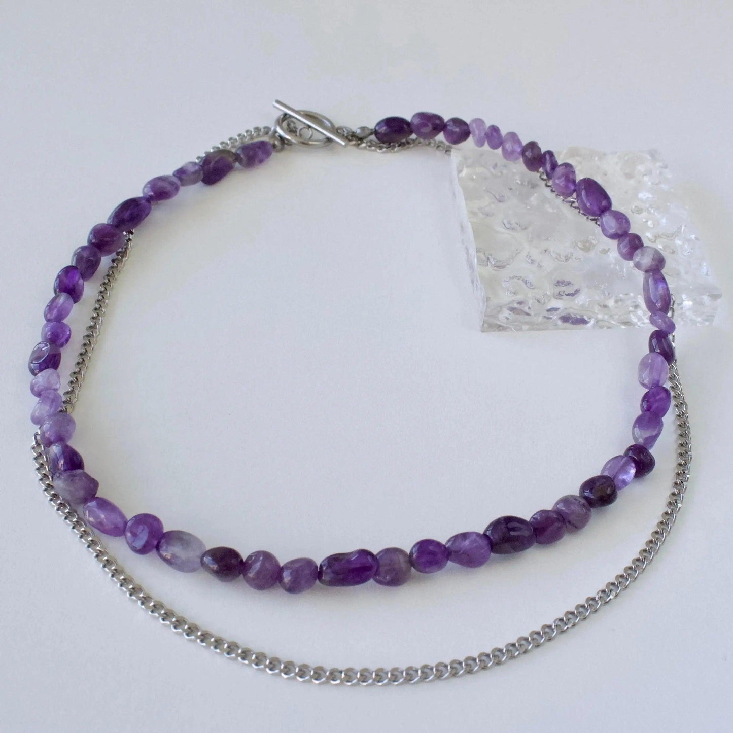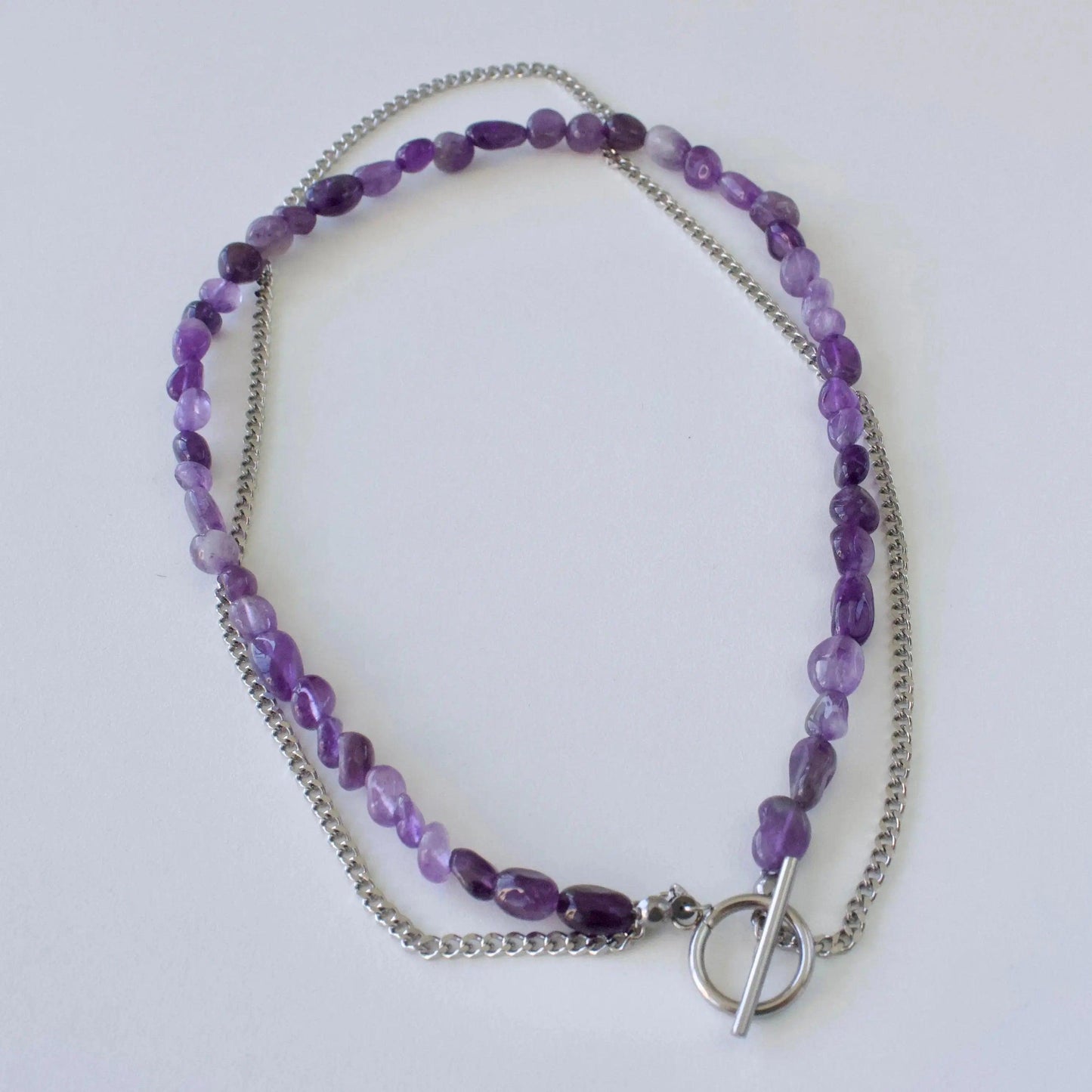 Stylische Handgemachte Doppelkette mit einzigartigen Amethyststeinen und Stahlkette mit einem einfachen und stilvollen Knebelverschluss. Die Kette kann auf zwei verschiedene Arten getragen werden.