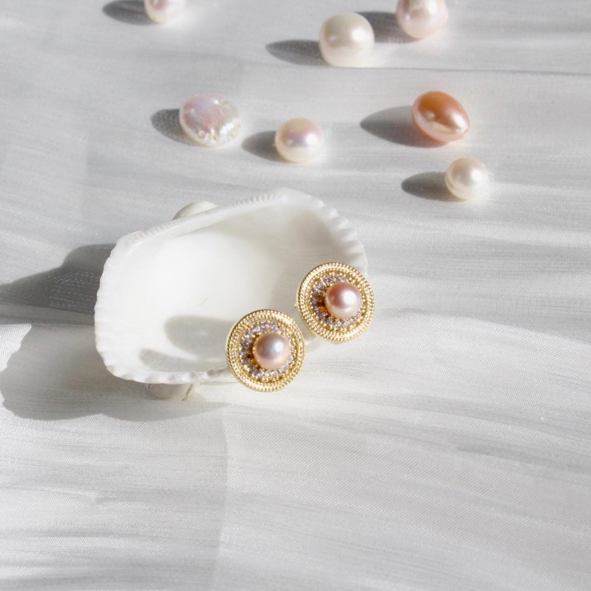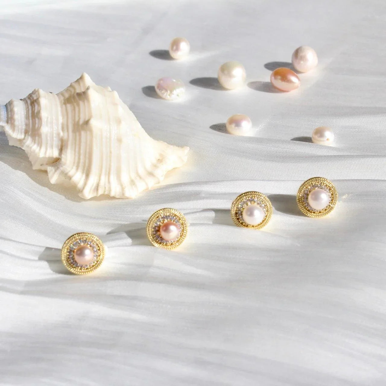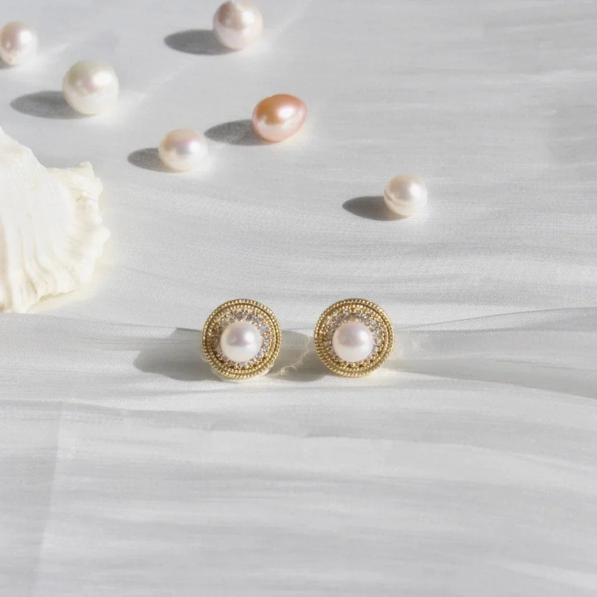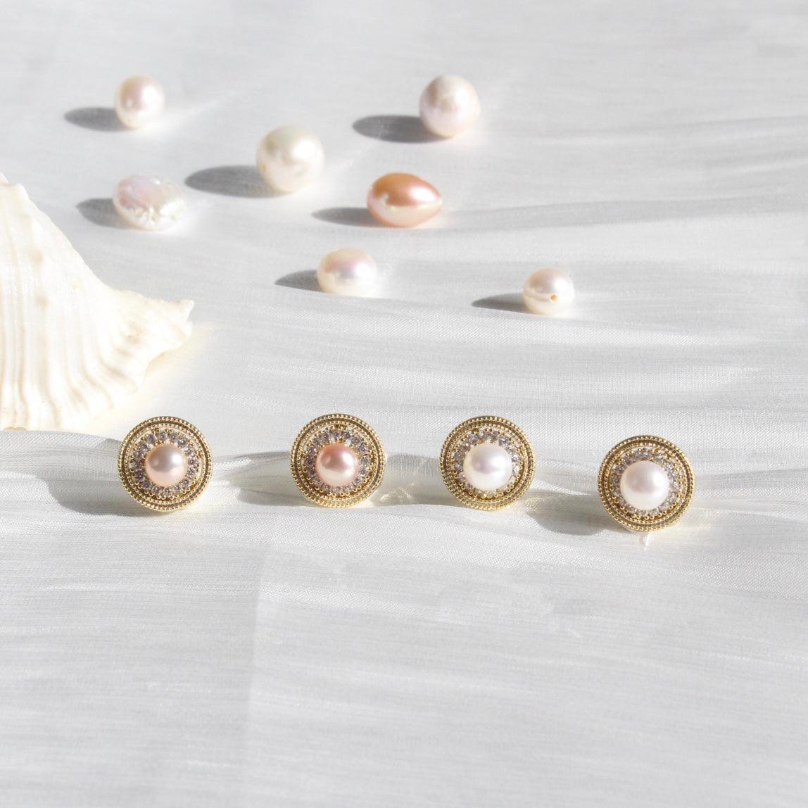 Elle, diese Ohrstecker zeigen sich in einem eleganten, vintage-inspirierten Runddesign. Der filigrane Ring ist rundum mit funkelnden Zirkonia besetzt und wird in der Mitte von einer zarten Süsswasserperle vollendet. Zur Auswahl stehen natürliche Perlen in klassischem Weiss oder in einem dezenten, sanften Rosa – jede für sich ein edler Akzent.