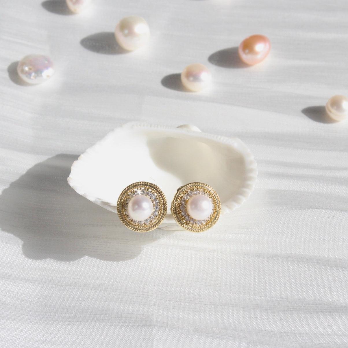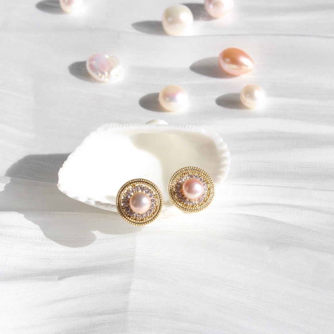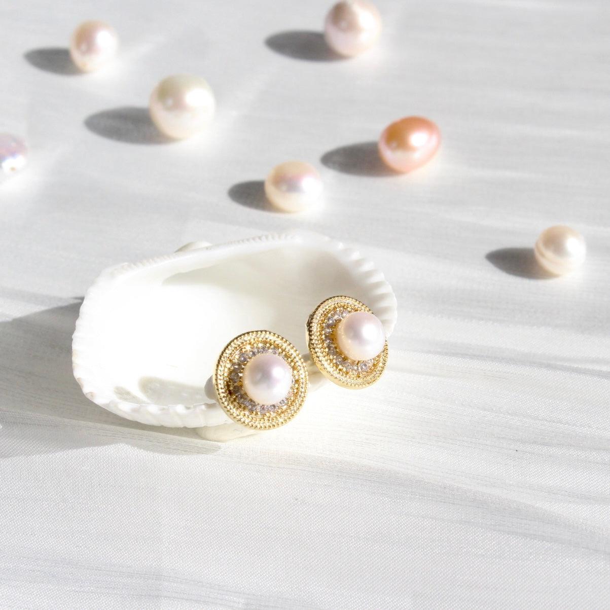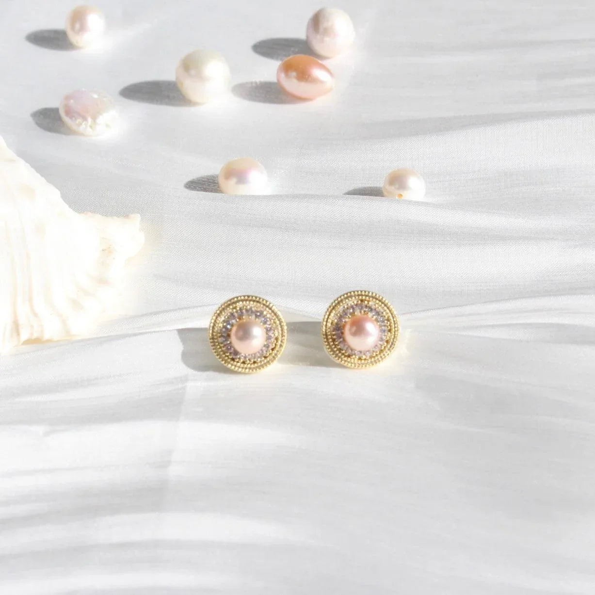 Elle, diese Ohrstecker zeigen sich in einem eleganten, vintage-inspirierten Runddesign. Der filigrane Ring ist rundum mit funkelnden Zirkonia besetzt und wird in der Mitte von einer zarten Süsswasserperle vollendet. Zur Auswahl stehen natürliche Perlen in klassischem Weiss oder in einem dezenten, sanften Rosa – jede für sich ein edler Akzent.