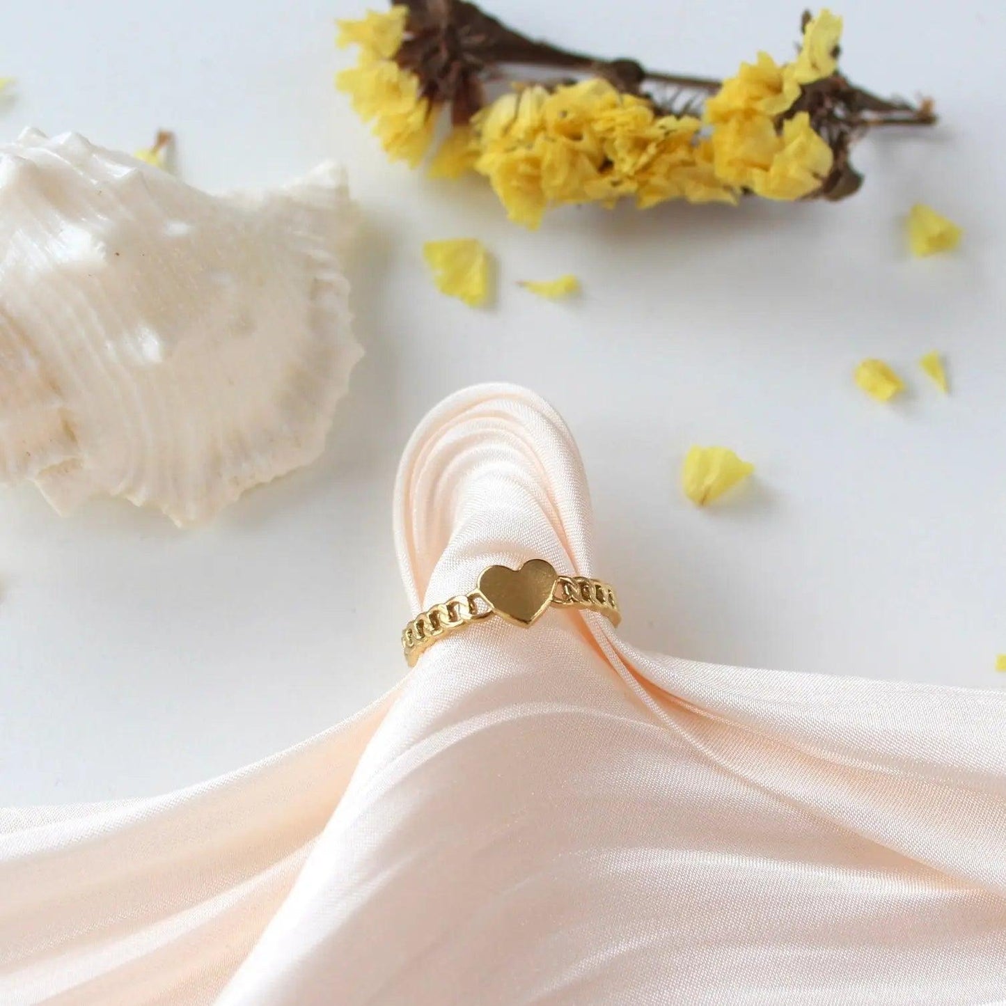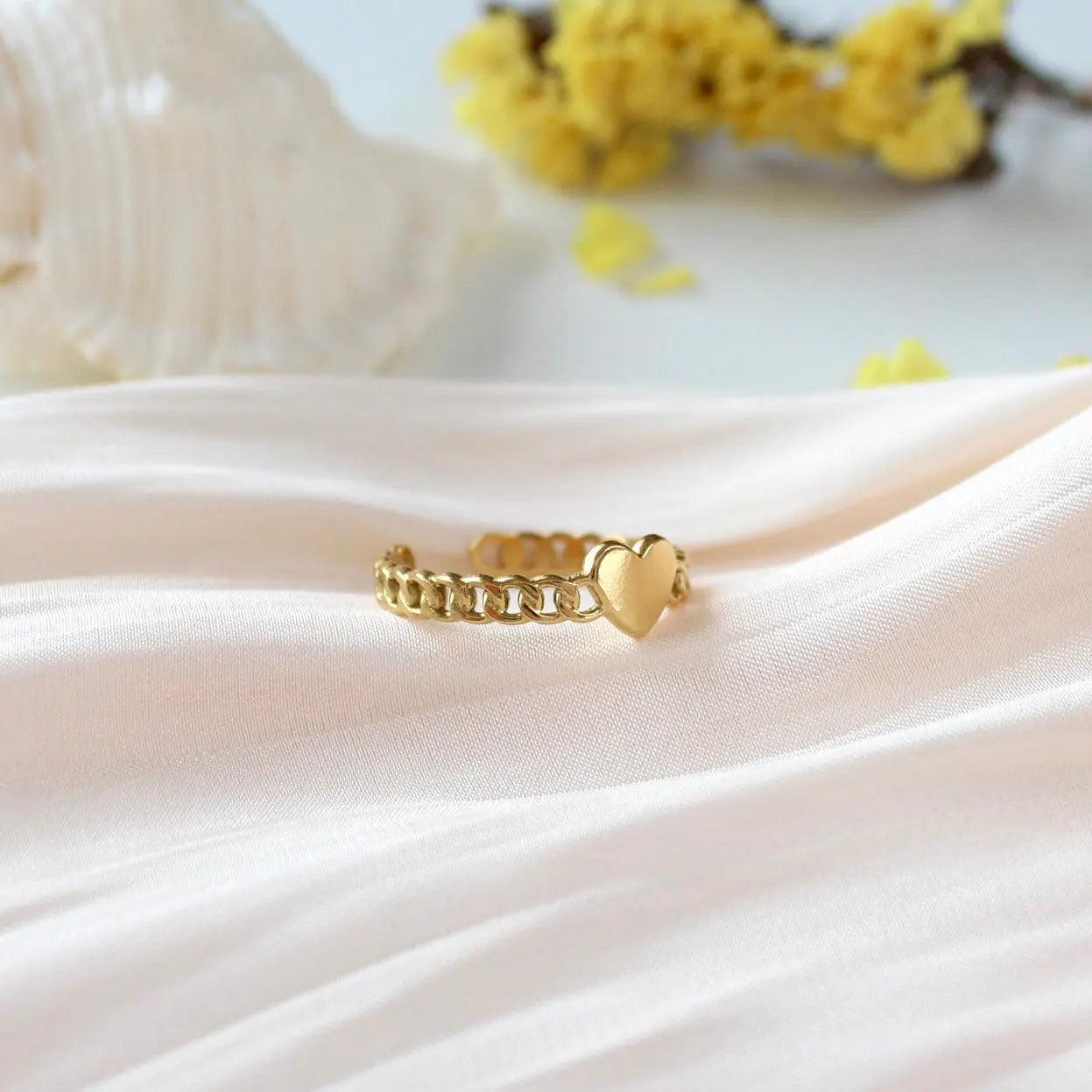 Süsses Herz mit panzerkettenförmigem Ring. Das offene Ringdesign ist in der Grösse verstellbar. Der Ring ist aus Chirurgenstahl gefertigt und mit 18 Karat Echtgold beschichtet. Es ist wasserfest und antiallergen.