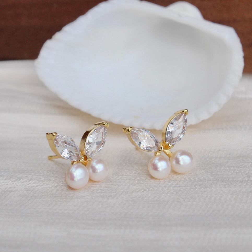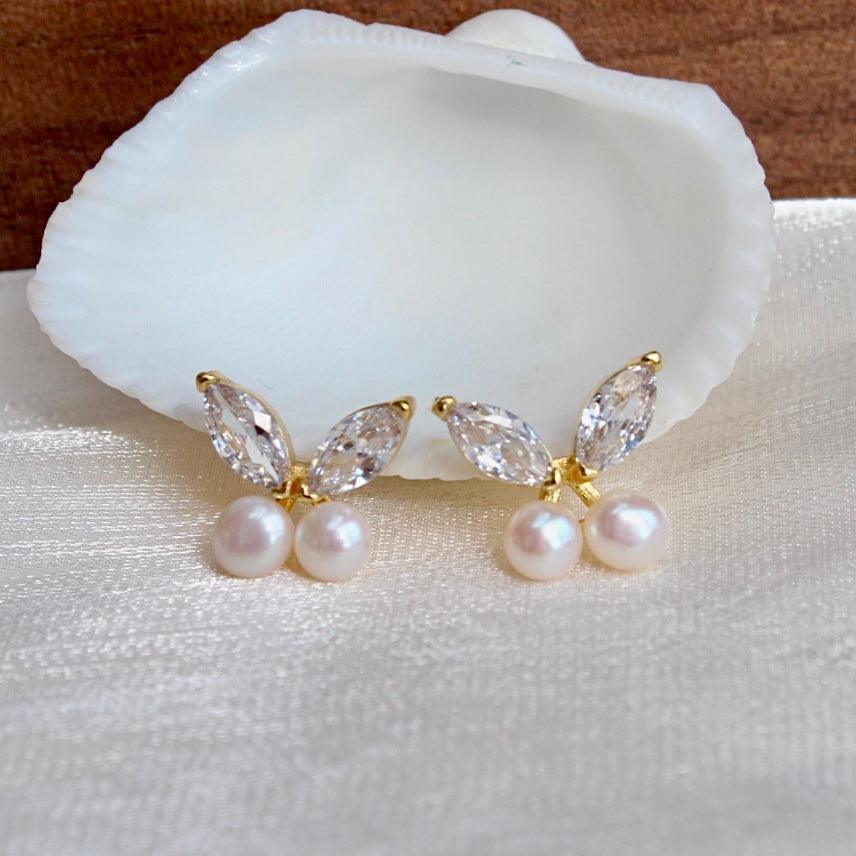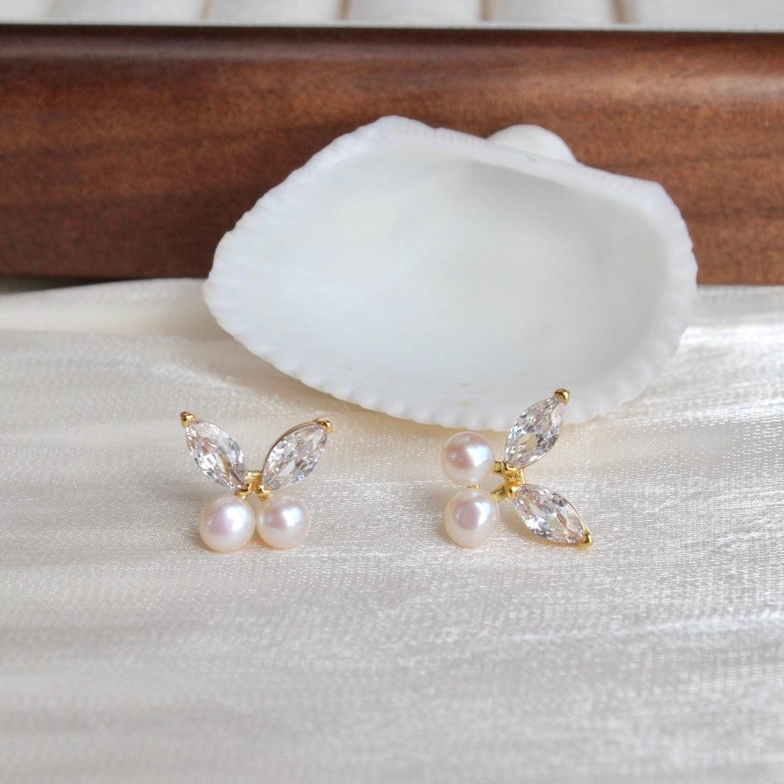 Julia, absolut zart und lieblich. Schmetterlingsförmige Ohrstecker mit funkelnden Zirkonia-Flügeln, besetzt mit zwei 5mm grossen, glänzenden weissen Süsswasserperlen. Eleganz und Stil zugleich.