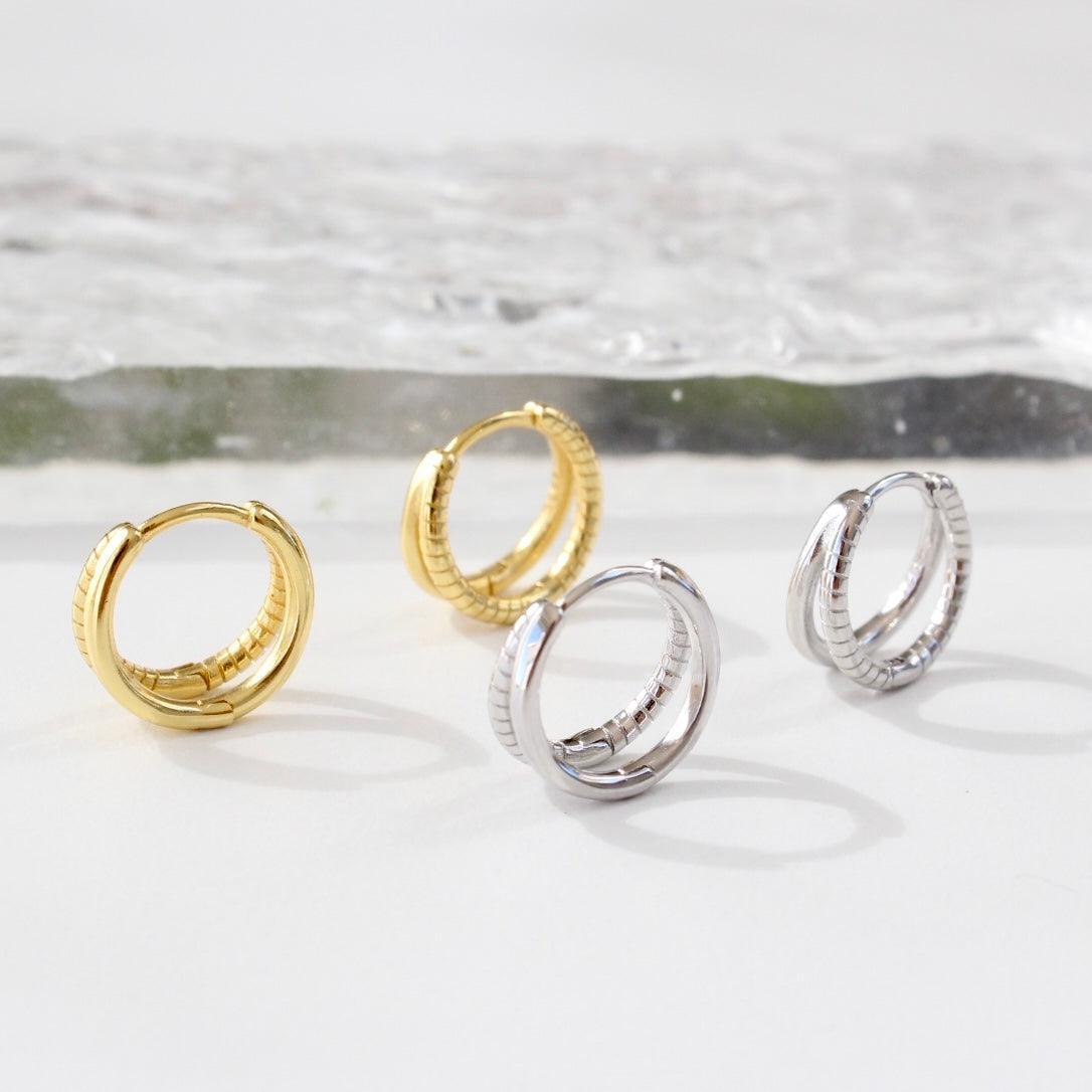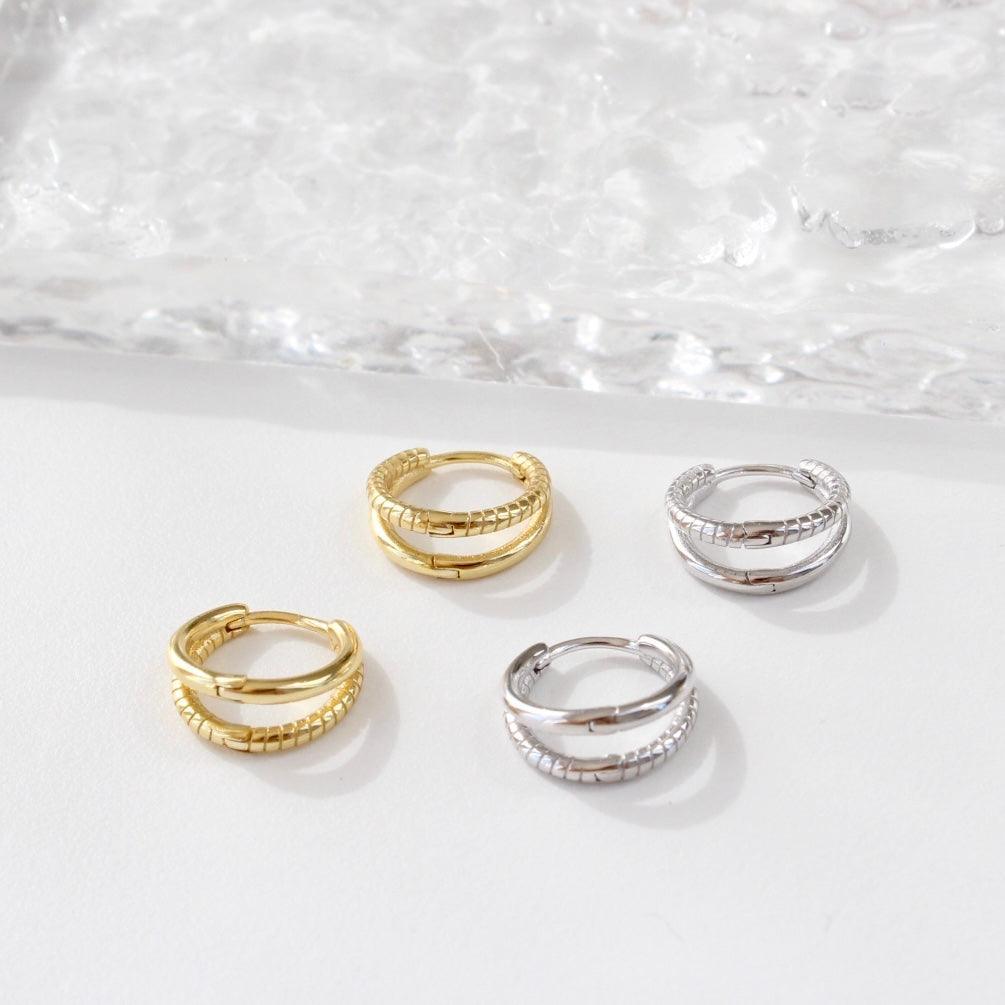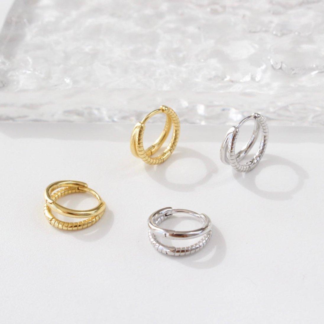 Dieser schlichten und stilvollen doppellagigen Creolen sind aus Sterlingsilber gefertigt und bestechen durch seinen einzigartigen und modernen Stil. Die Ohrringe sind in zwei Farbvarianten erhältlich: Die goldene Version ist mit 18 Karat vergoldet, um einen luxuriösen Glanz zu erzielen, während die silberne Version mit Weissgold vergoldet ist, um eine dezente und elegante Textur zu erhalten. Das doppellagige Design verleiht den Creolen Dimension und Stil, so dass sie sowohl im Alltag als auch zu besonderen Anlässen getragen werden können. Ihre klassische Schlichtheit kommt nie aus der Mode und macht sie zu einem Must-Have in jedem Schmuckkästchen.