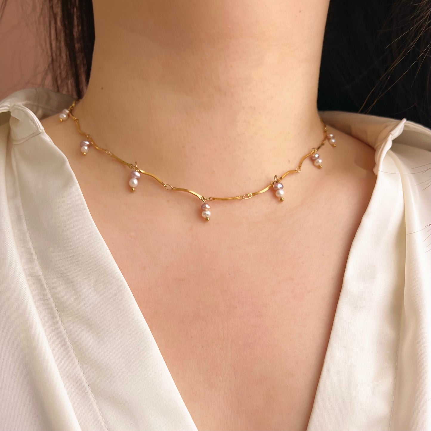 Feine, natürliche Süsswasserperlen in zartem Violett und klassischem Weiss bilden das Herzstück dieses Designs. Die kleinen Perlen wurden zu einem filigranen, wunderschönen Anhänger verarbeitet, der an einer besonderen Gliederkette aus Metall schwebt – ein harmonisches Zusammenspiel aus Farbe, Form und Leichtigkeit.