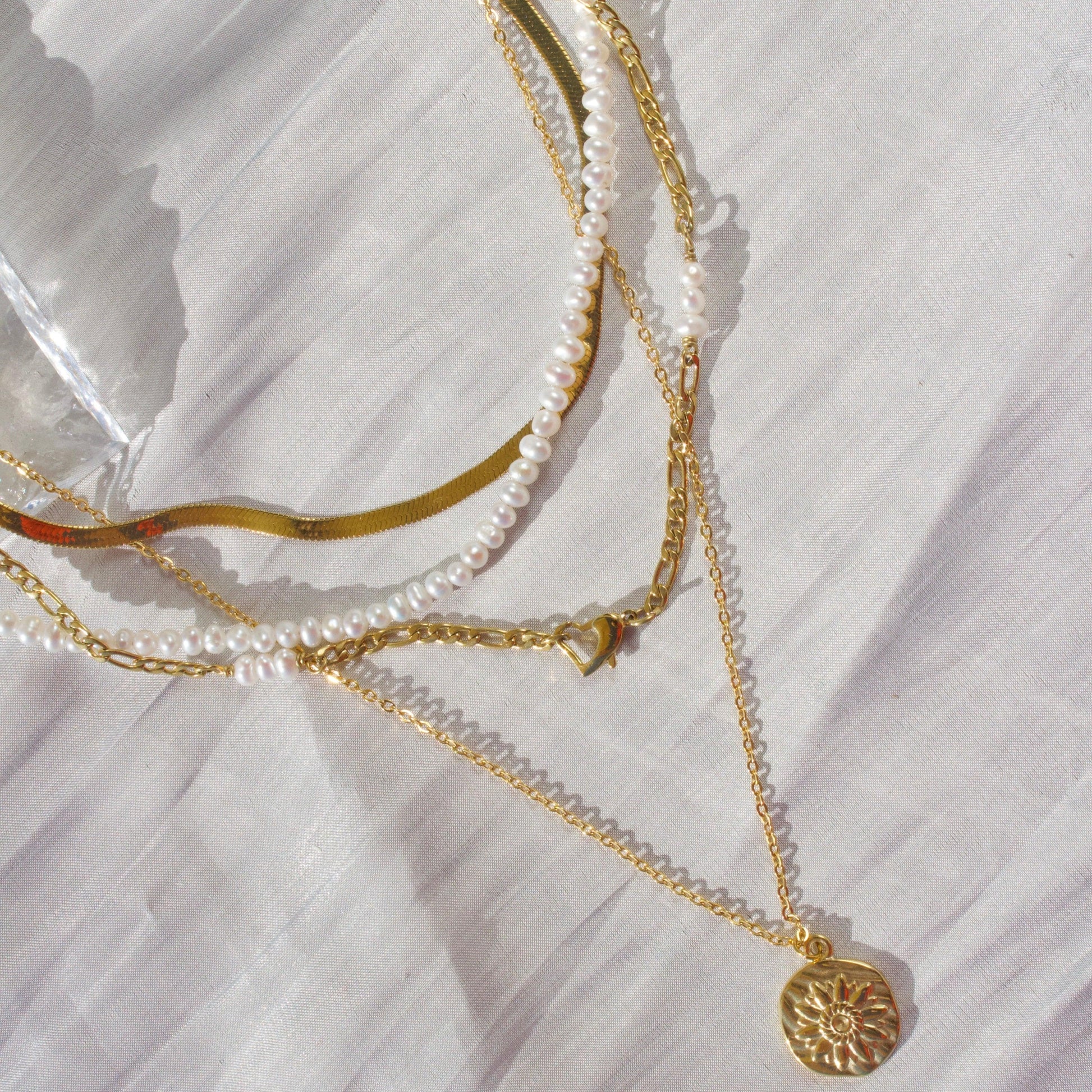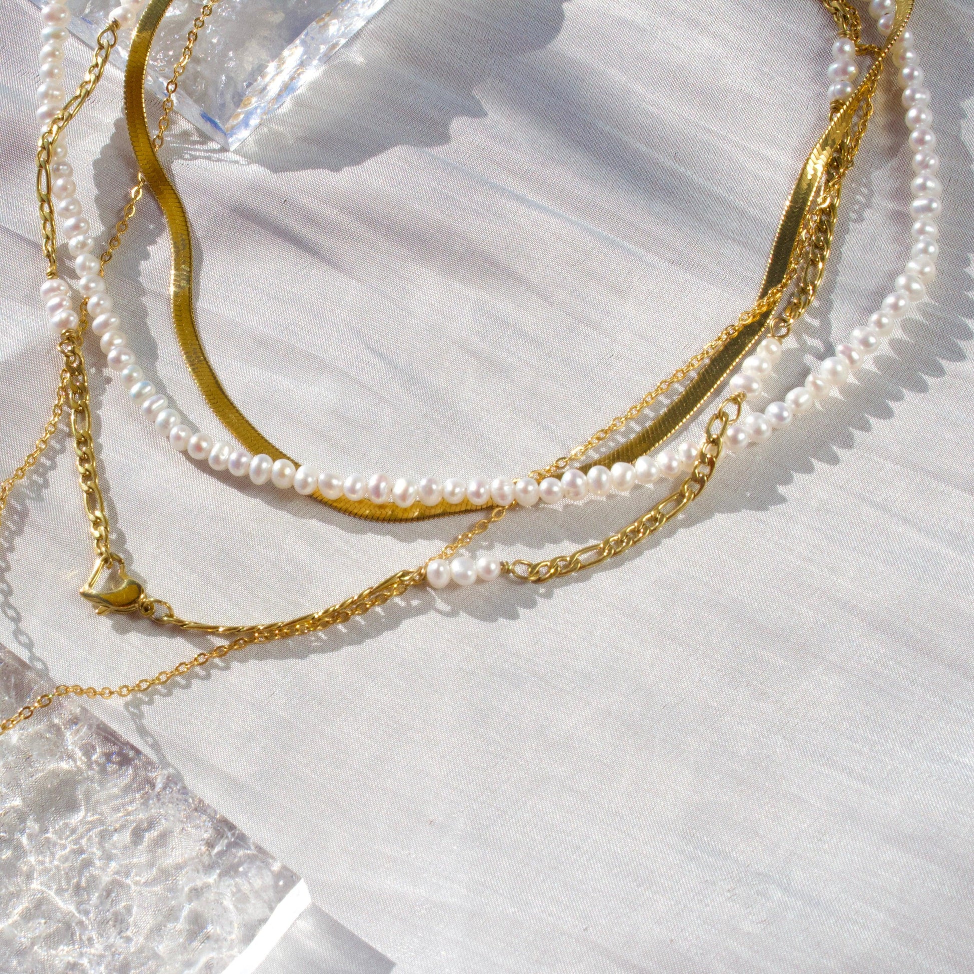 Myla, zarte 5mm grosse Süsswasserperlen treffen auf eine markante, einzigartige Panzerkette und verleihen dieser Halskette ihren modernen und gleichzeitig eleganten Charakter. Die natürlichen Perlen wurden sorgfältig ausgewählt und harmonieren perfekt mit dem klaren Design.