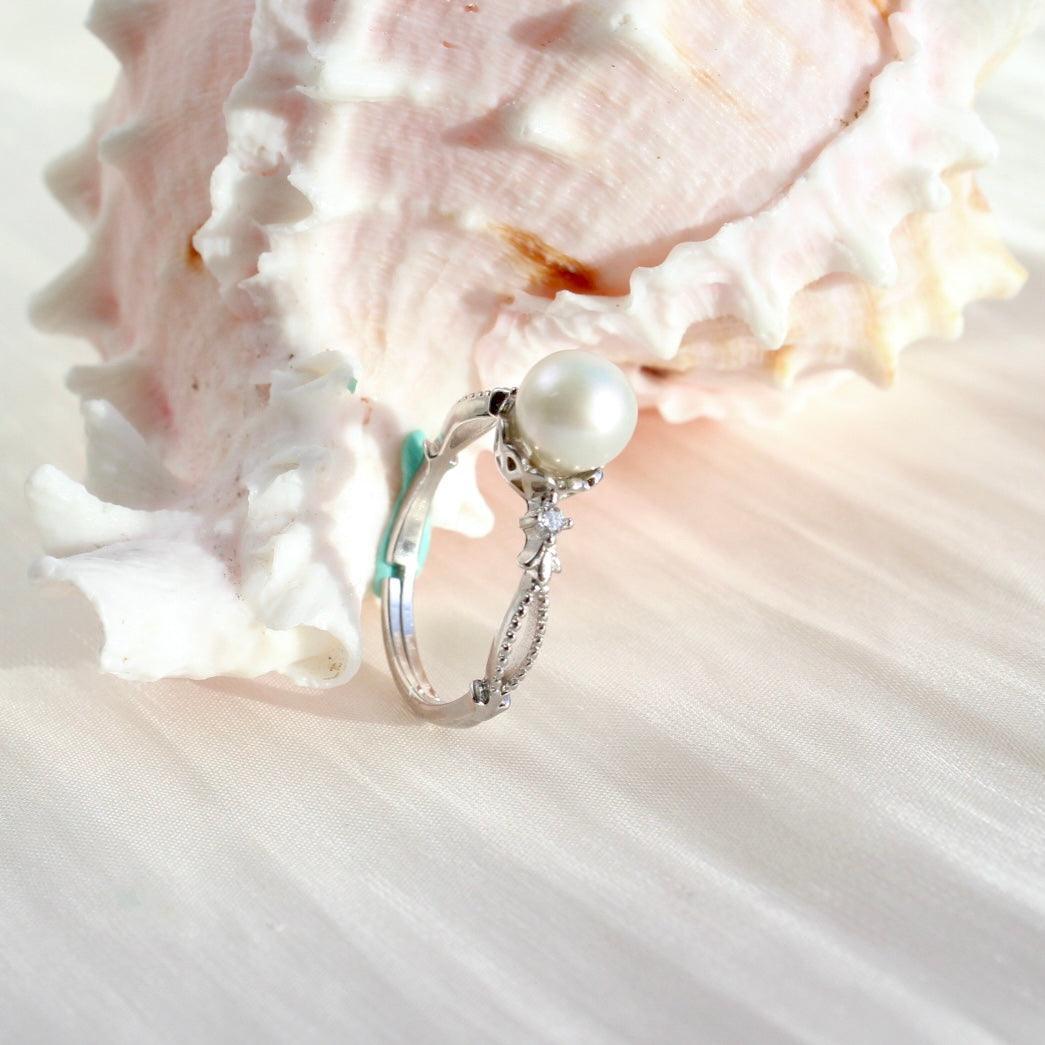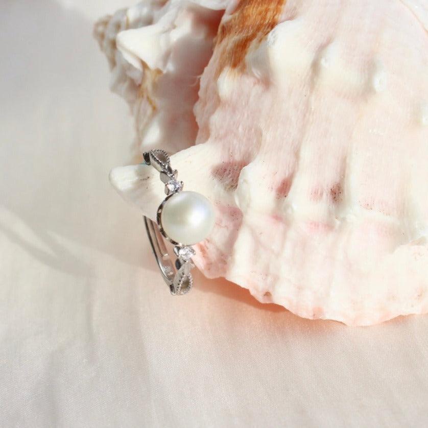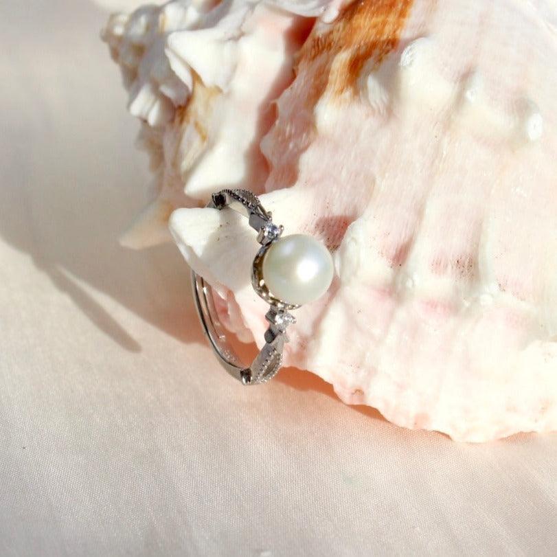Ein klassischer und zeitloser Perlenring aus Sterlingsilber mit Weissgold Beschichtung. Besetzt mit einer runden makellosen natürlichen Süsswasserperle. Die Perle ist ca. 6.5mm gross und der Ring ist in der Grösse verstellbar.