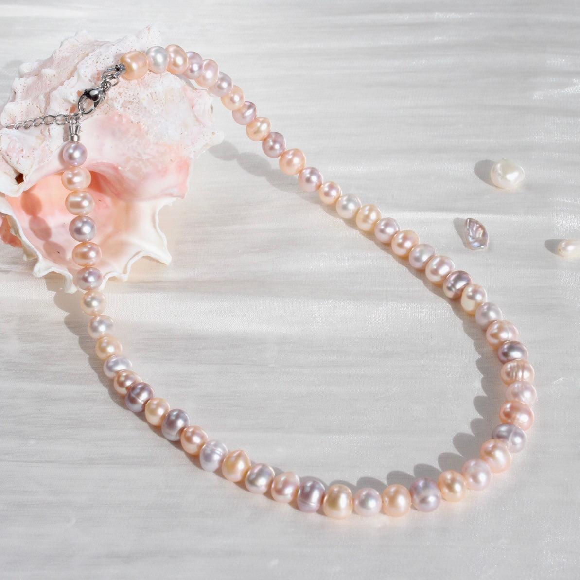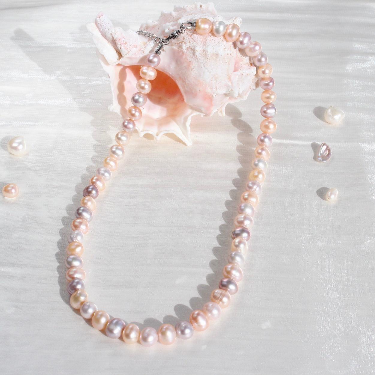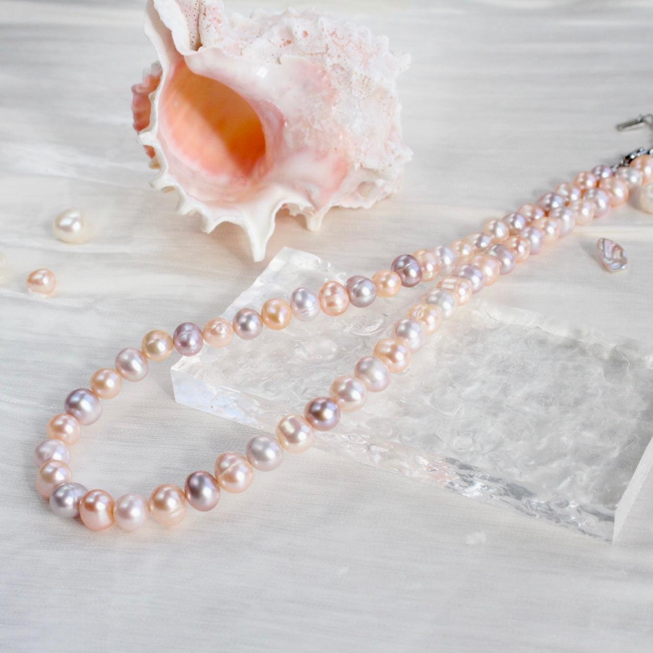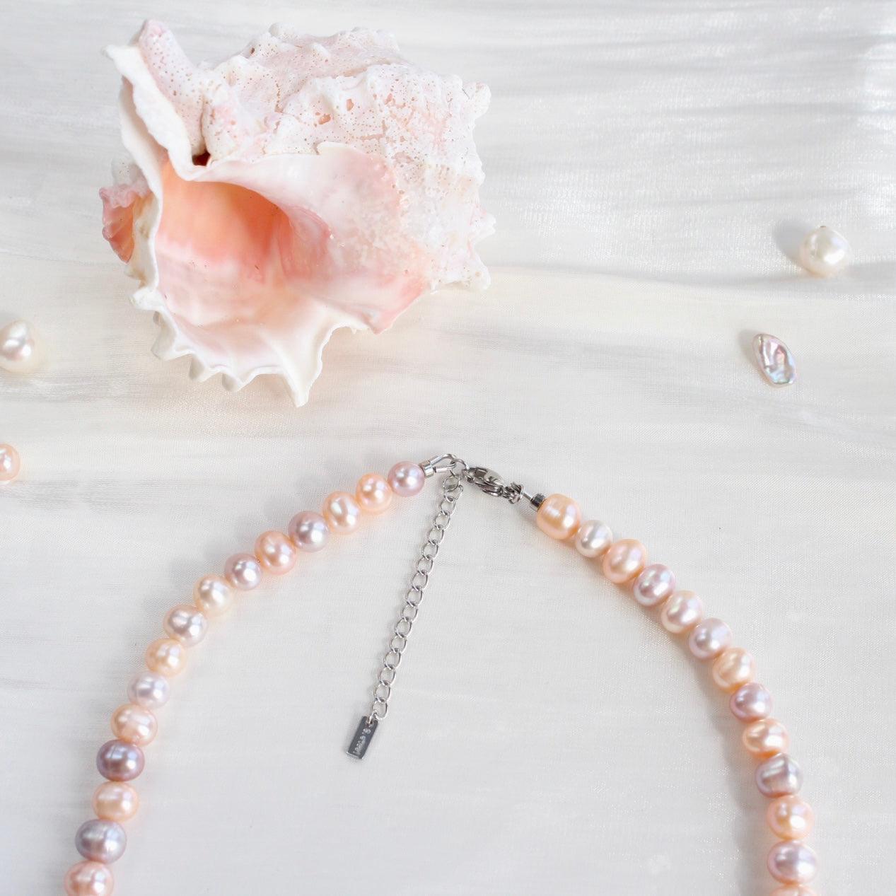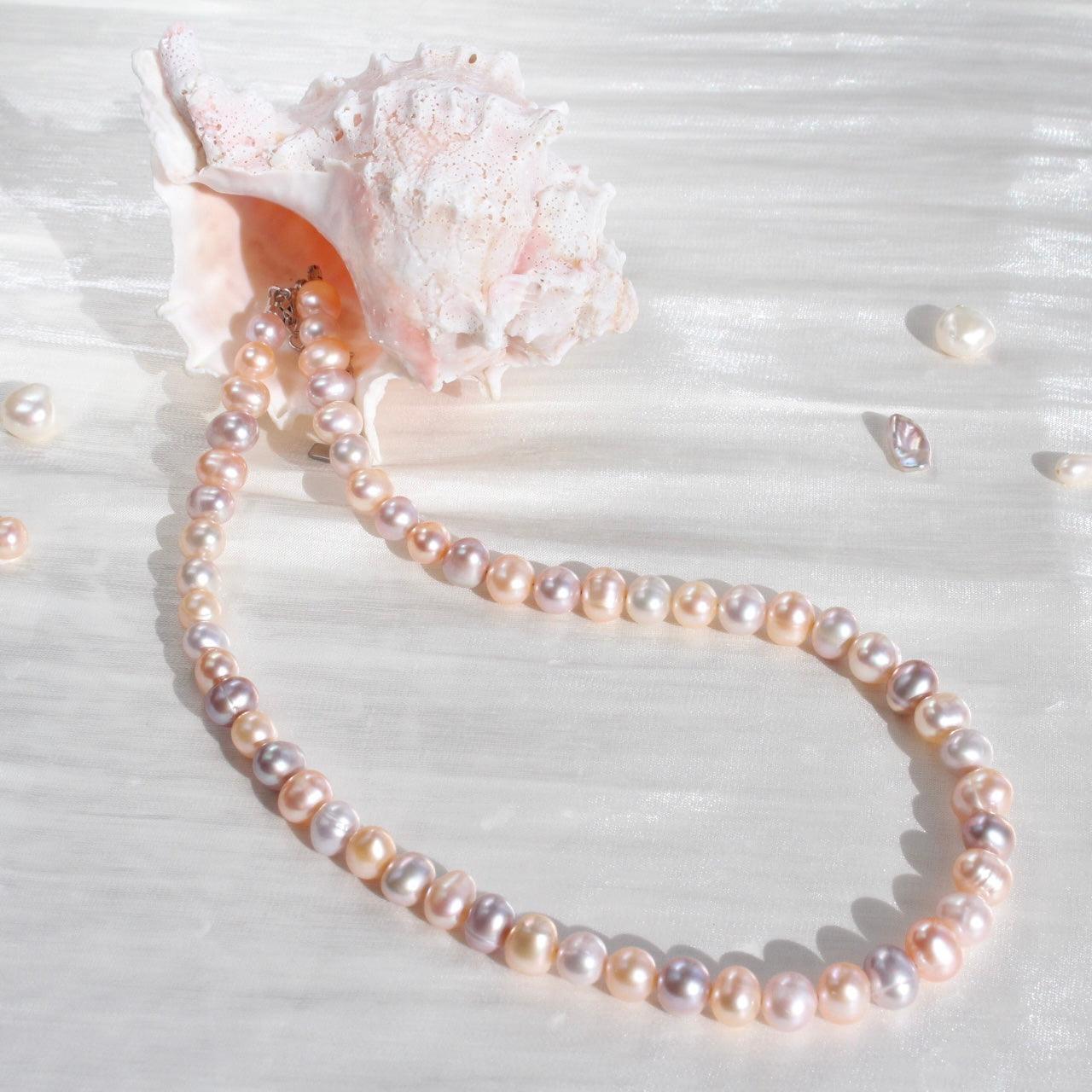 Rachel, diese elegante Perlenkette kombiniert zarte, natürliche Violett- und Orangetöne zu einem harmonischen und gleichzeitig auffälligen Design. Jede Perle ist ein Unikat der Natur und verleiht der Trägerin eine individuelle Ausstrahlung mit einem Hauch von Farbe.