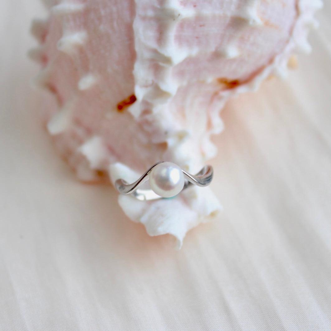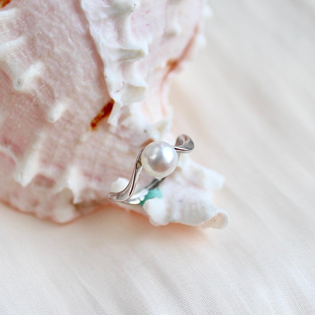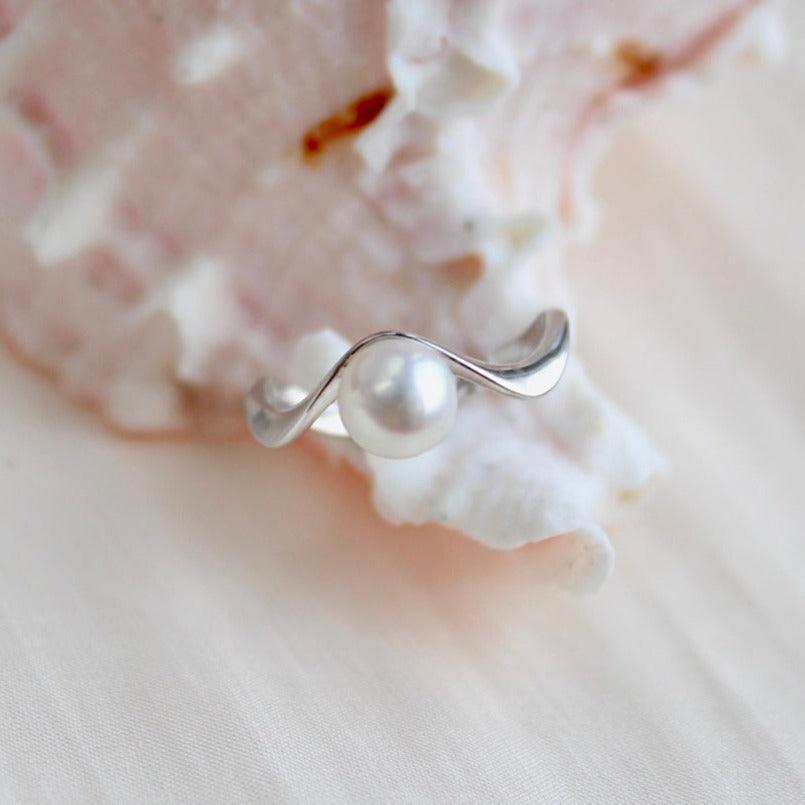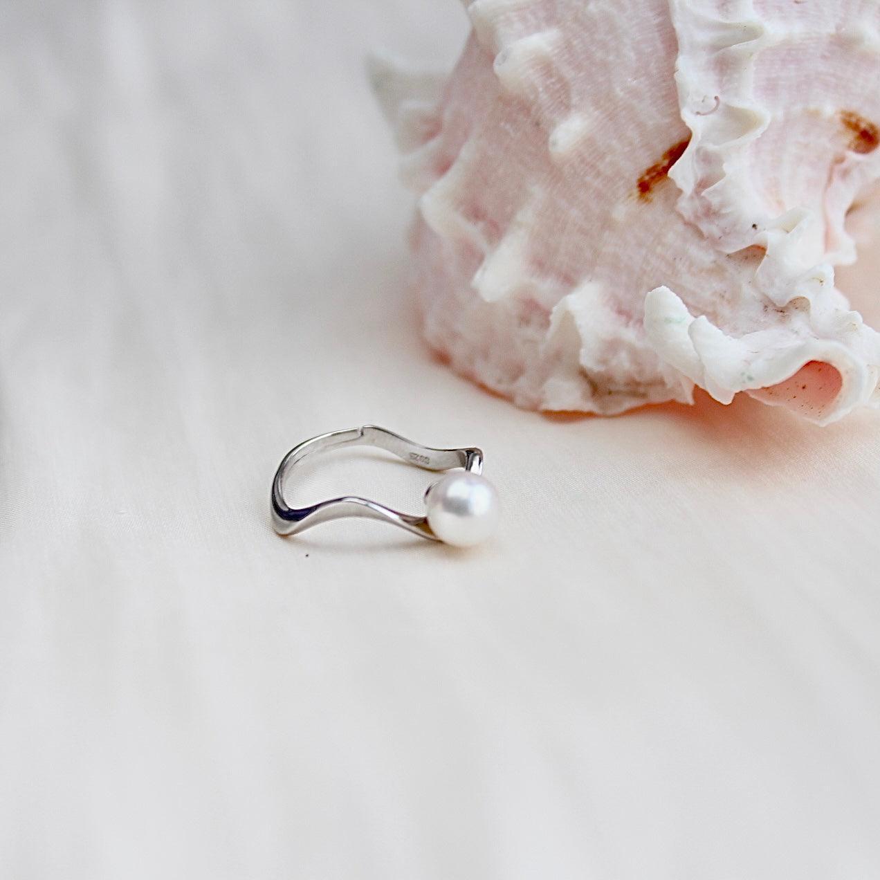 Erleben Sie die pure Eleganz mit diesem handgefertigten Ring aus hochwertigem Sterlingsilber, das mit einer Weissgoldplattierung verziert ist. Das Design zeichnet sich durch eine zarte Welle aus, die zu einer einzelnen, prächtigen Perle führt, die stolz in den Mittelpunkt gestellt wird.