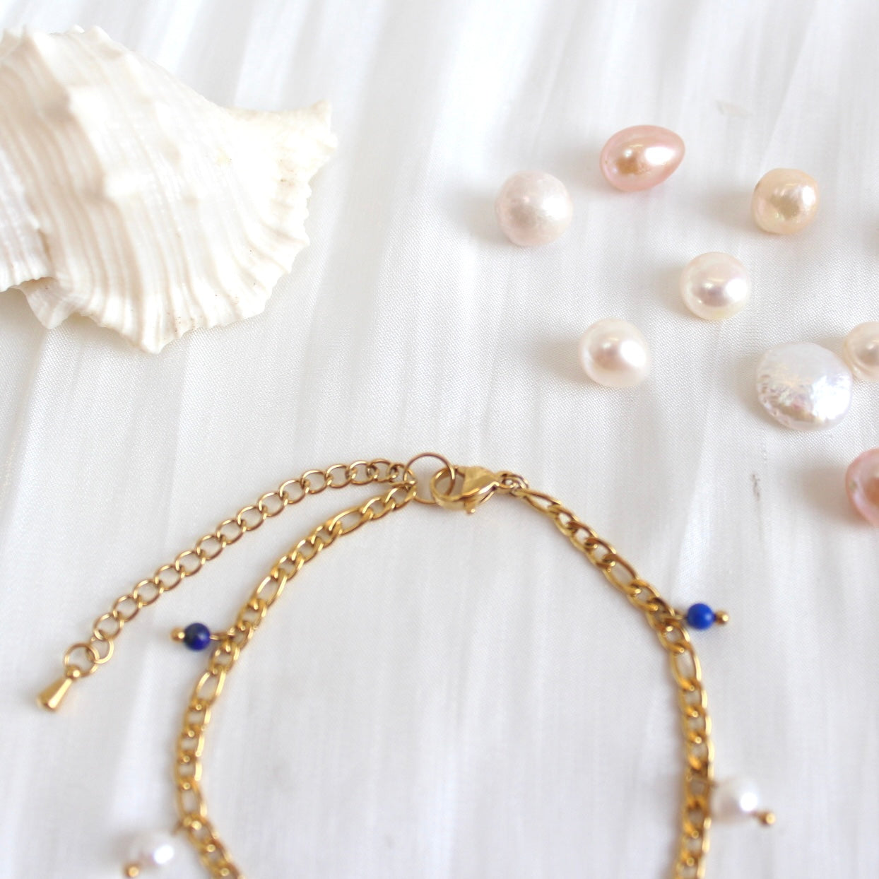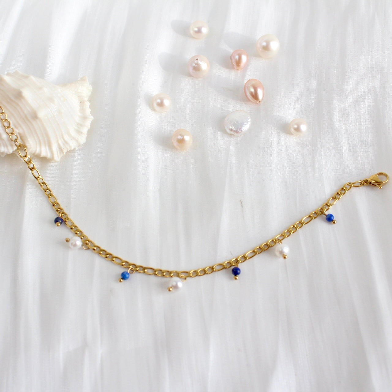 Sasha, eine Armkette, die Natürlichkeit und modernes Design vereint. Tiefblauer Lapis Lazuli und schimmernde Süsswasserperlen treffen auf eine markante Panzerkette und schaffen so ein Schmuckstück voller Eleganz und Schlichtheit – perfekt für alle, die einen klaren, minimalistischen Stil lieben.