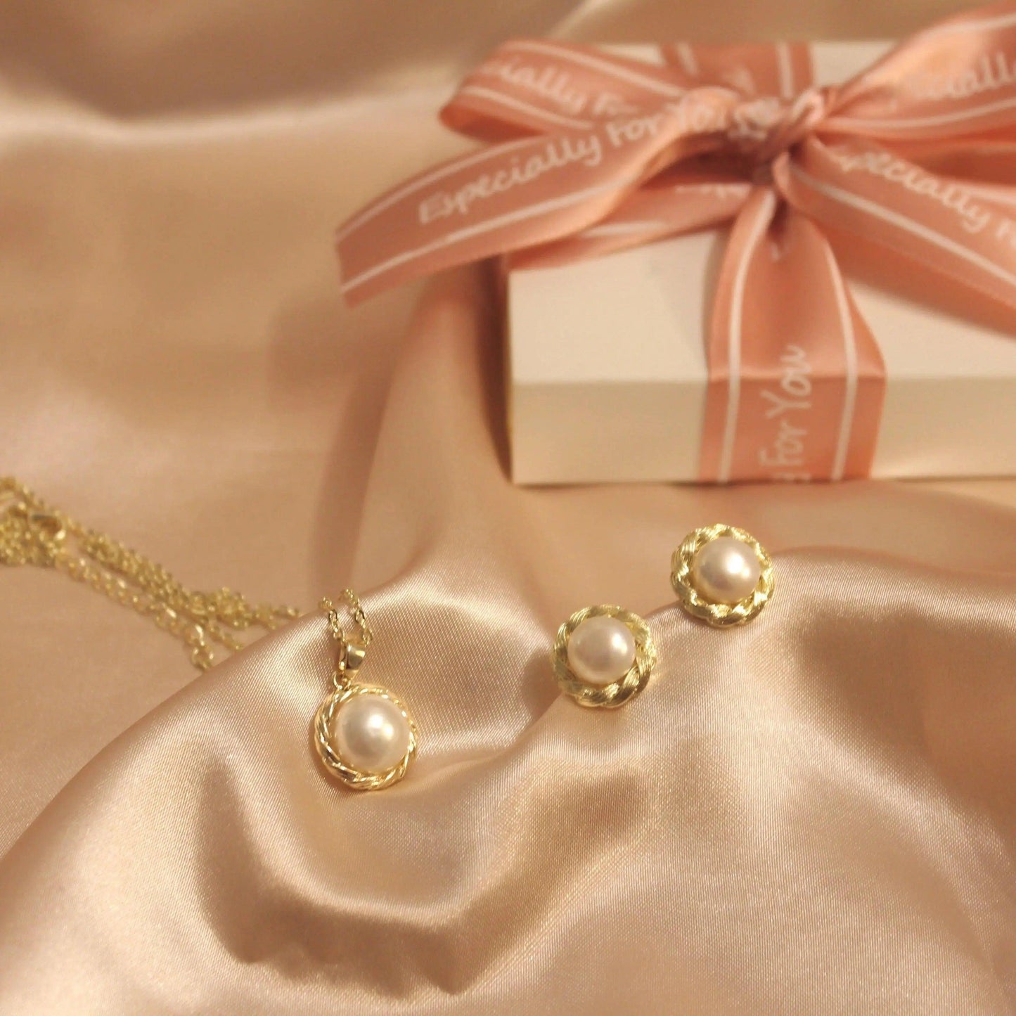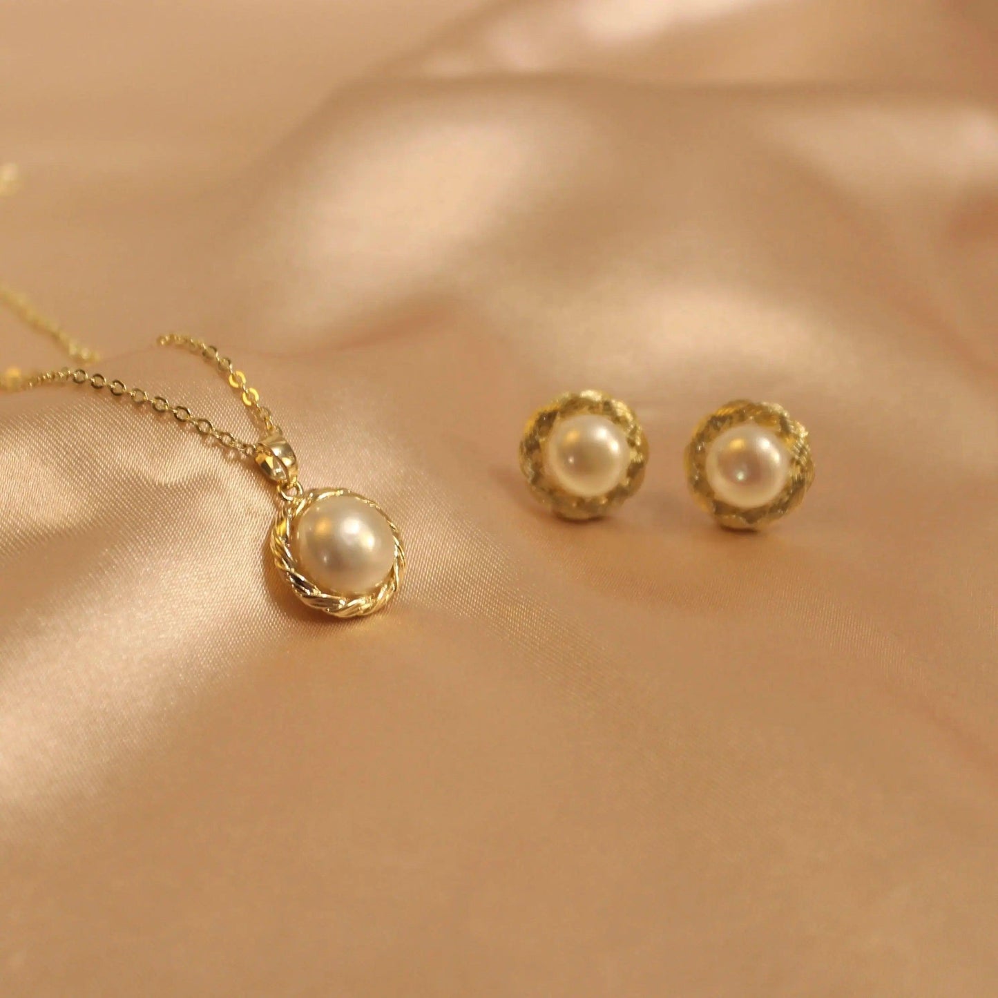 Die Schmuck ist aus Kupfer und der Ohrstecker mit einem Sterlingsilber Stecker und beide sind mit 18k Echtgold vergoldet. Die Perlen sind 4A Qualität 10.5mm / 9mm grosse natürliche Süsswasserperlen. Die Länge der Halskette beträgt 42 cm und hat eine 6cm Verlängerungskette.