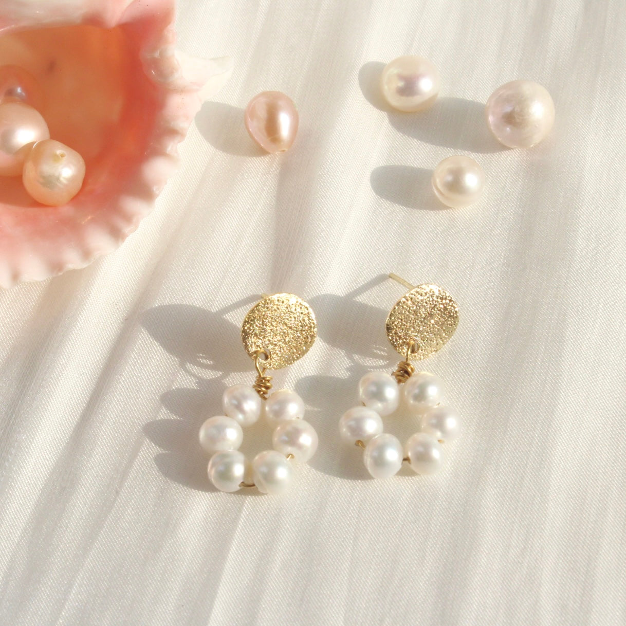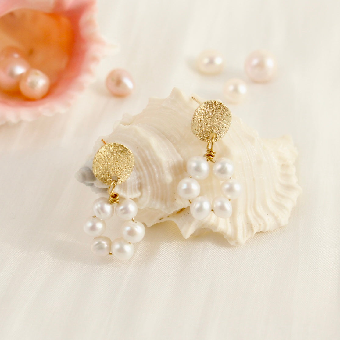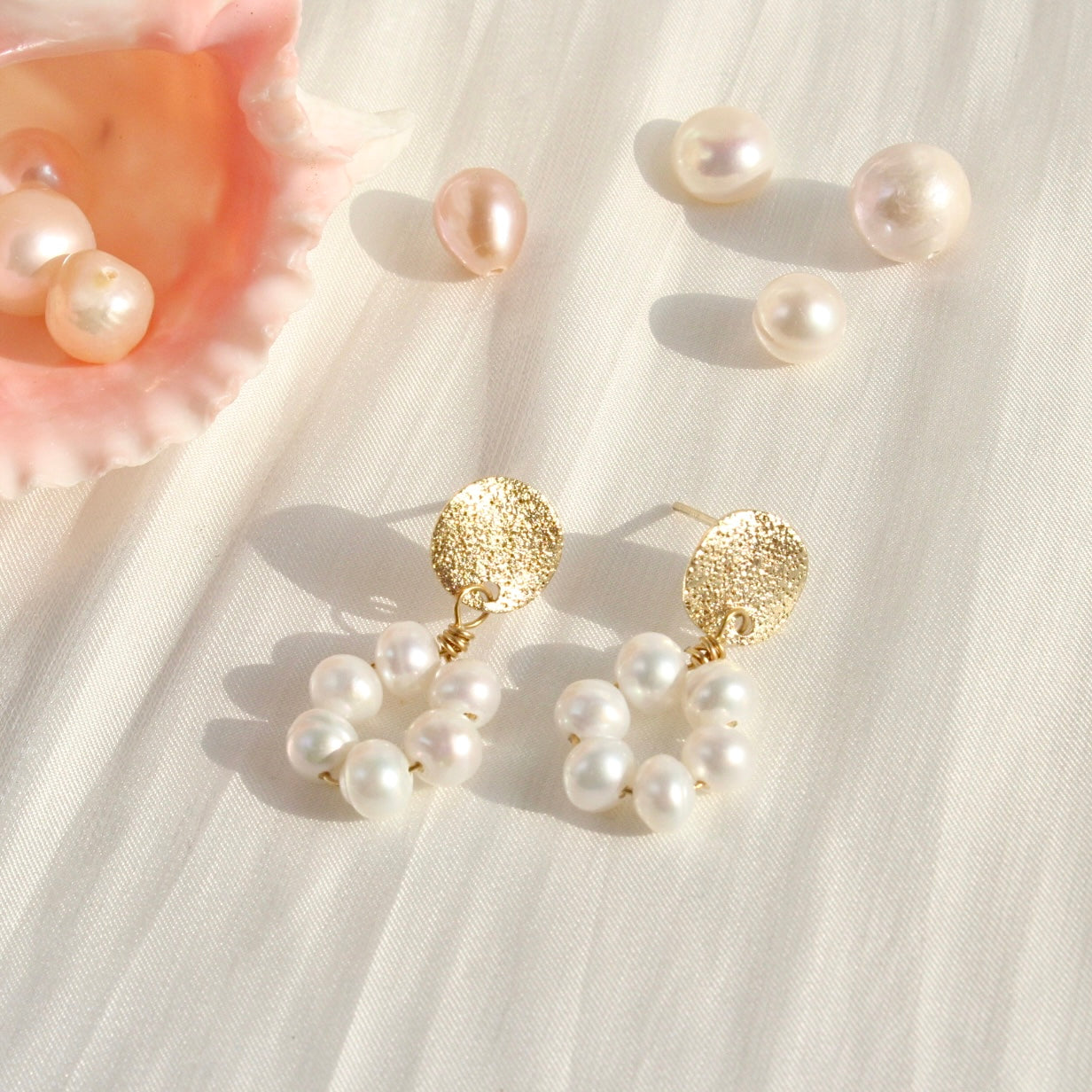 Das kunstvoll gestaltete Design setzt den zarten Perlenkranz perfekt in Szene und unterstreicht seine pure, zeitlose Ausstrahlung. Gefertigt aus hochwertigem Kupfer und veredelt mit einer 18-karätigen Vergoldung, vereinen diese Ohrringe langlebige Qualität mit klassischer Raffinesse.