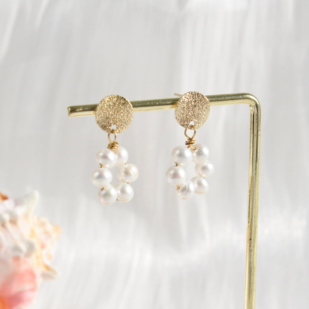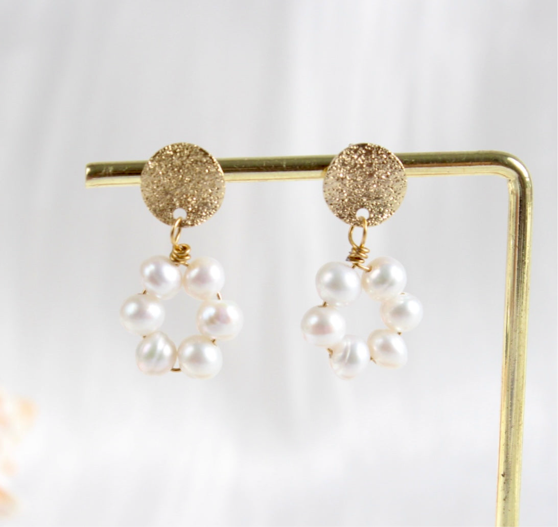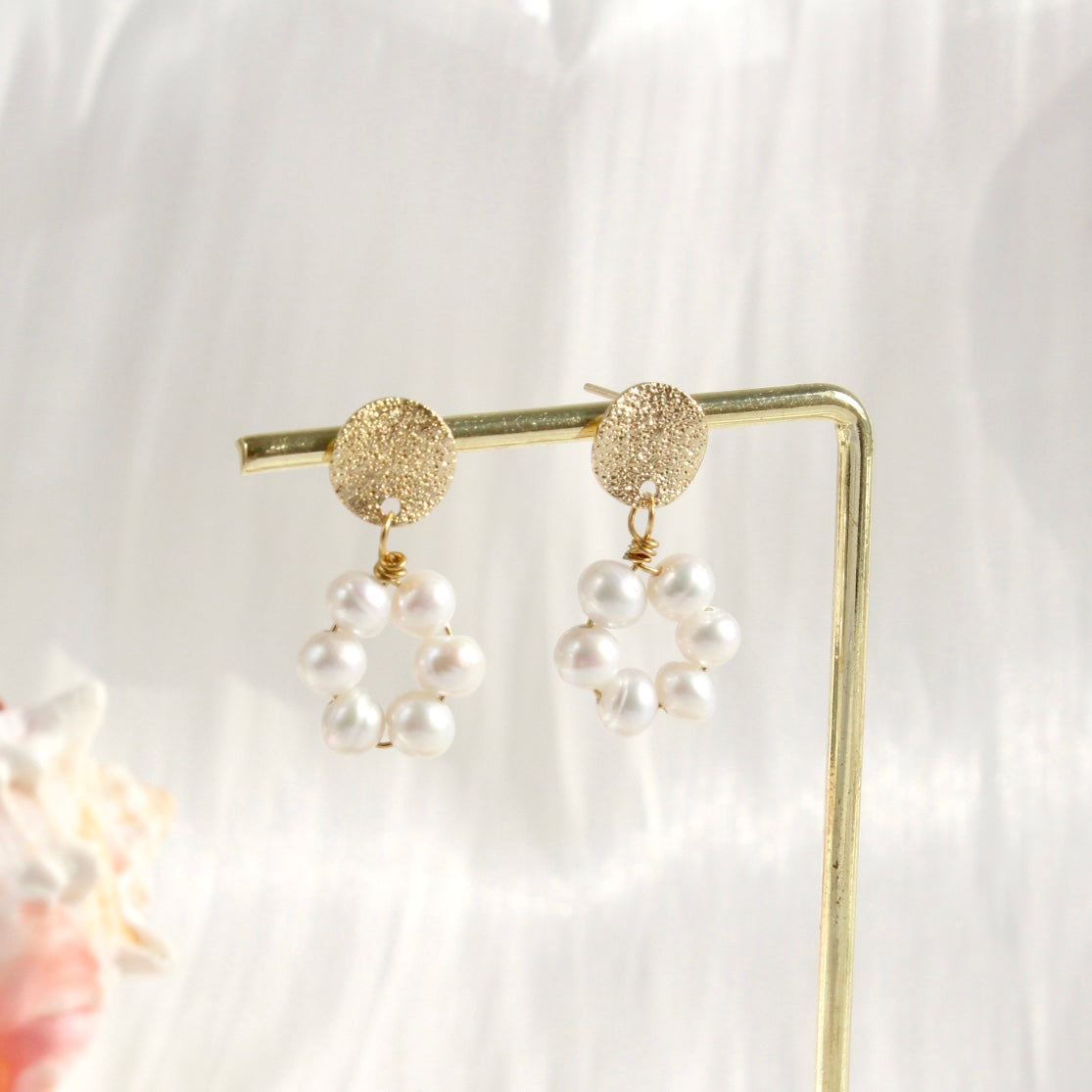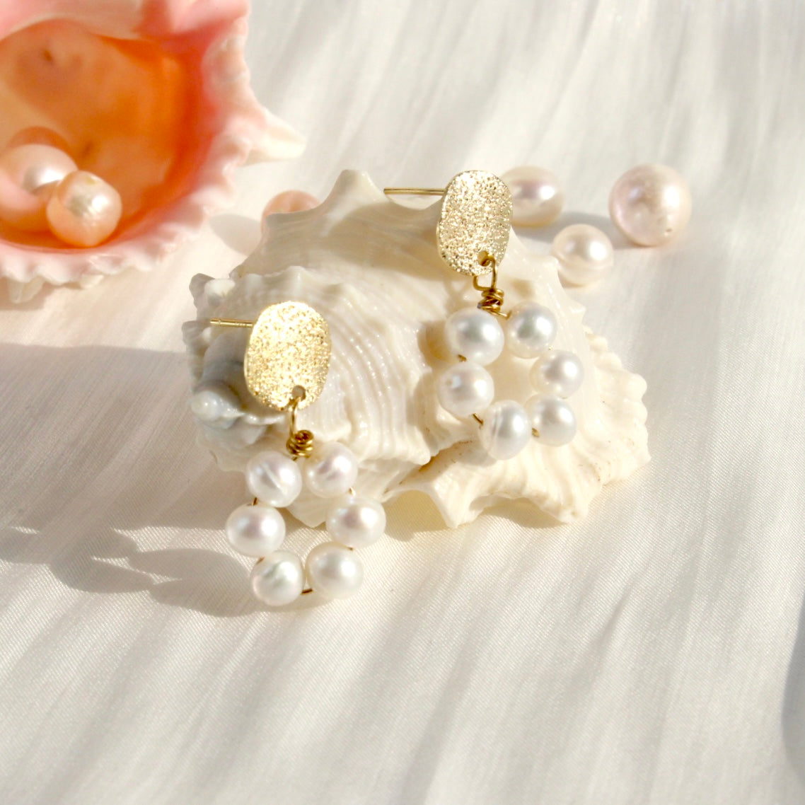 Das kunstvoll gestaltete Design setzt den zarten Perlenkranz perfekt in Szene und unterstreicht seine pure, zeitlose Ausstrahlung. Gefertigt aus hochwertigem Kupfer und veredelt mit einer 18-karätigen Vergoldung, vereinen diese Ohrringe langlebige Qualität mit klassischer Raffinesse.